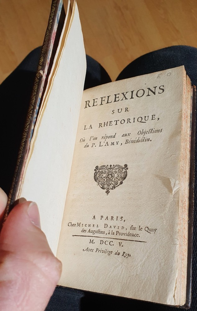 Reflections On The Rhetoric, Where One Responds Aux Objections Of P. Lamy 1705 The description of this item has been automatically translated. If you have any questions, please feel free to contact us. Reflections on rhetoric, where the objections of Fr. Lamy, Benedictine are responded. In Paris, at Michel David, on the Quay des Augustins, in Providence. M. DCC. V. (1705) With privilege of the Roy. In-8 full period of the period, back has 5 nerves, ornate boxes, dishes with arms of the Marquise Delphine de Valbelle de Tourves. Luts with lower bites. (12) + 110p. + 4p. approval and privileges Gibert Balthasar, is a French humanist, born in Aix en Provence in 1662, died in 1741. He taught theology at Mazarin College, of which he was 5 times rector, became a trustee of the university in 1738, defended the privileges of this body and refused to condemn the proposals, de Jansenius, firmness which could not overcome an order of exile in Auxerre. Reflections on rhetoric, where the objections of Fr. Lamy, Benedictine are responded. In Paris, at Michel David, on the Quay des Augustins, in Providence. M. DCC. V. (1705) With privilege of the Roy. In-8 full period of the period, back has 5 nerves, ornate boxes, dishes with arms of the Marquise Delphine de Valbelle de Tourves. Luts with lower bites. (12) + 110p. + 4p. approval and privileges Gibert Balthasar, is a French humanist, born in Aix en Provence in 1662, died in 1741. He taught theology at Mazarin College, of which he was 5 times rector, became a trustee of the university in 1738, defended the privileges of this body and refused to condemn the proposals, de Jansenius, firmness which could not overcome an order of exile in Auxerre. Date de publication 1705 Auteur Gibert Balthasar Caractéristiques spéciales Édition originale Reliure Cuir Reliure Relié Langue Français Quantité unitaire 1 Époque XVIIIème Nom de publication Reflexionss sur la rhetorique, où l'on répond aux objections du P Lieu de publication Paris Nom Reflexionss sur la rhetorique, où l'on répond aux objections du P Sujet Religion