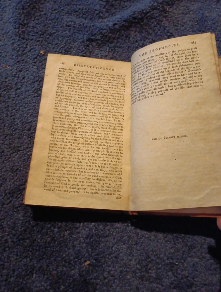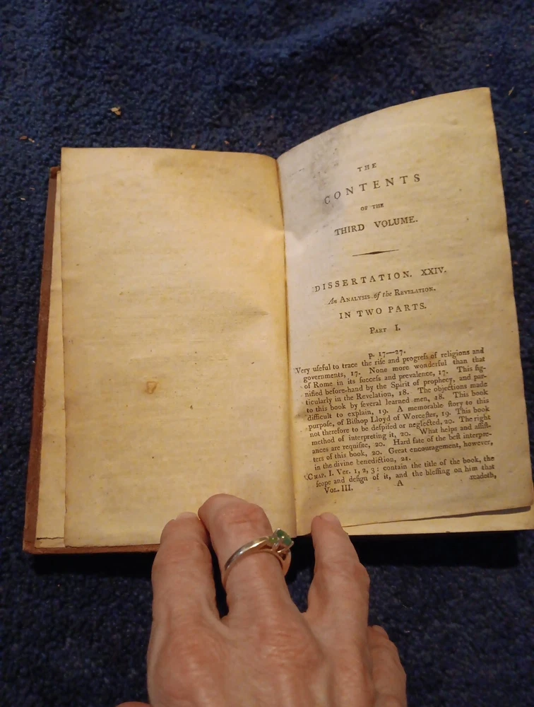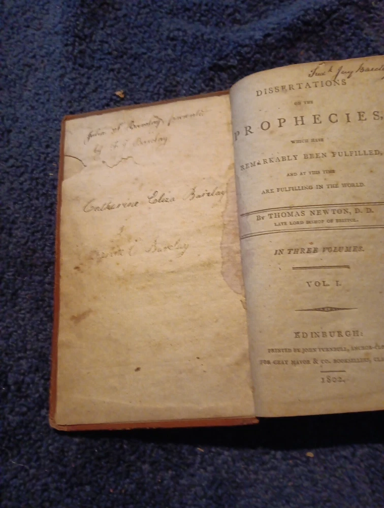 Religion Thomas Newton Dissertations on the Prophecies 1802 1st UK VG- Later UK edition with 1802 on title page and October 5, 1734 on dedication page. Publisher: Edinburgh: John Turnbull, 1802. Three volumes: Volume 1: Octavo (4.5" x 7") [xx] 1-274 [ii Blank] Full contemporary calf, brown gilt-lettered spine label. Top page edge is stained brown. Volume 1 Book Condition: Very Good- Binding is splitting. FEP has previous owners' signature on FEP. FEP has chip missing. Occasional foxing. Volume 2: Octavo (4.5" x 7") [xx] 1-274 [ii Blank] Full contemporary calf, brown gilt-lettered spine label. Top page edge is stained brown. Volume 2 Book Condition: Very Good- Binding is splitting. FEP has previous owners' signature on FEP. Occasional foxing. Volume 3: Octavo (4.5" x 7") [xx] 1-274 [ii Blank]. [xx] 1-274 [ii Blank] Full contemporary calf, brown gilt-lettered spine label. Top page edge is stained brown. Volume 3: Book Condition: Very Good- Binding is tight. FEP & title page has previous owners' signature. Occasional foxing. REP has missing chip. Spine title missing. Thomas Newton (1704-1782), English Anglican theologian, clergyman, biblical scholar, author, biographer, bishop, Dean of St Paul’s Cathedral in London. The 18th century was a wealth of knowledge, exploration and rapidly growing technology and expanding record-keeping made possible by advances in the printing press. The Age of Enlightenment profoundly enriched religious and philosophical understanding and continues to influence present-day thinking. Works collected here include masterpieces by David Hume, Immanuel Kant, and Jean-Jacques Rousseau, as well as religious sermons and moral debates on the issues of the day, such as the slave trade. The Age of Reason saw conflict between Protestantism and Catholicism transformed into one between faith and logic -- a debate that continues in the twenty-first century.