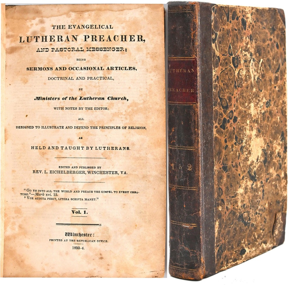 [RELIGION] THE EVANGELICAL LUTHERAN PREACHER, AND PASTORAL MESSENGER; BEING SERMONS AND OCCASIONAL ARTICLES; DOCTRINAL AND PRACTICAL. BY MINISTERS OF THE LUTHERAN CHURCH ... [2 VOLUMES, TOGETHER] Author: Rev. L. Eichelberger [Editor and Publisher] Title: [RELIGION] THE EVANGELICAL LUTHERAN PREACHER, AND PASTORAL MESSENGER; BEING SERMONS AND OCCASIONAL ARTICLES; DOCTRINAL AND PRACTICAL. BY MINISTERS OF THE LUTHERAN CHURCH ... [2 VOLUMES, TOGETHER] Publication: Winchester: Printed at the Republican Office, 1833-34; 1835 Description: Half Leather. 8vo; in quarter calf with morocco marbled paper boards which are rubbed and torn; two volumes are bound together, Volume I, 1-12 and Volume II, 1-12; viii, 184 pages; iv, [1], 2-188 pages; there is foxing throughout but overall a presentable copy of the first 24 issues of The Evangelical Lutheran Preacher. ~~Laid in is an advertising label for Joseph Herron Druggist, Newville, Cumberland County, Pa. Very Good binding. Seller ID: 298667 Black Swan Books Richmond VA We specialize in antiquarian books, classic literature, the Civil War, Viriginiana, travel, art, children's books, and other subject areas, including religion and philosophy . Terms Payment via PayPal is preferred. All orders ship within two [2] business days, Monday through Friday by standard mail, USPS Media Mail. Combined orders and expedited shipping is available. Please contact us for a shipping quote before ordering. All items are guaranteed as listed and described. Any item may be returned within 30 days for any reason in the condition is which they were sent. This listing was created by Bibliopolis.