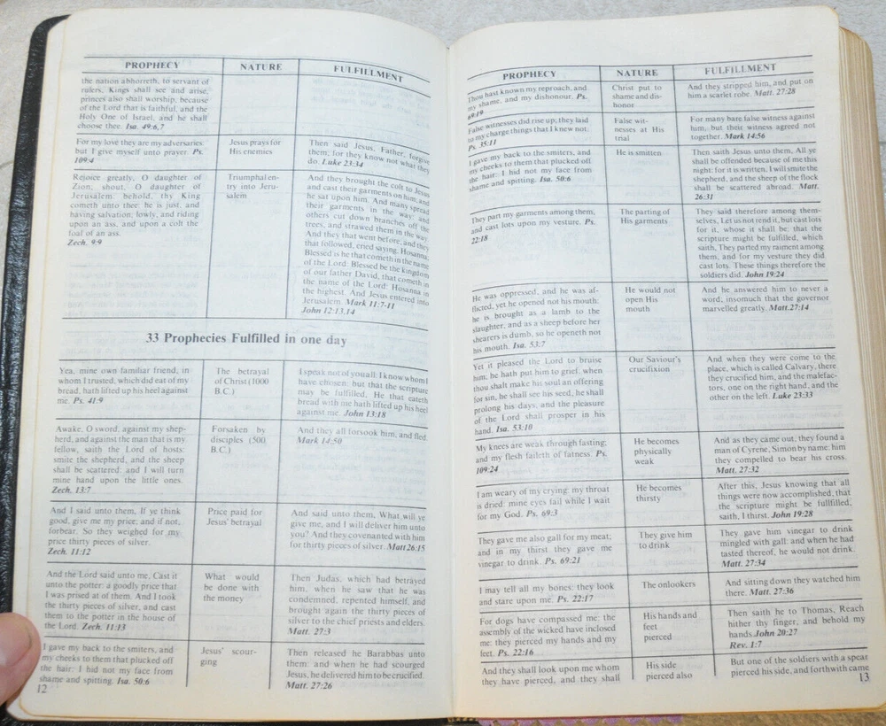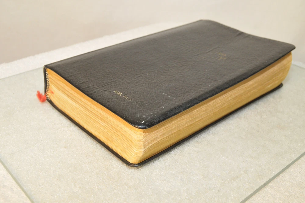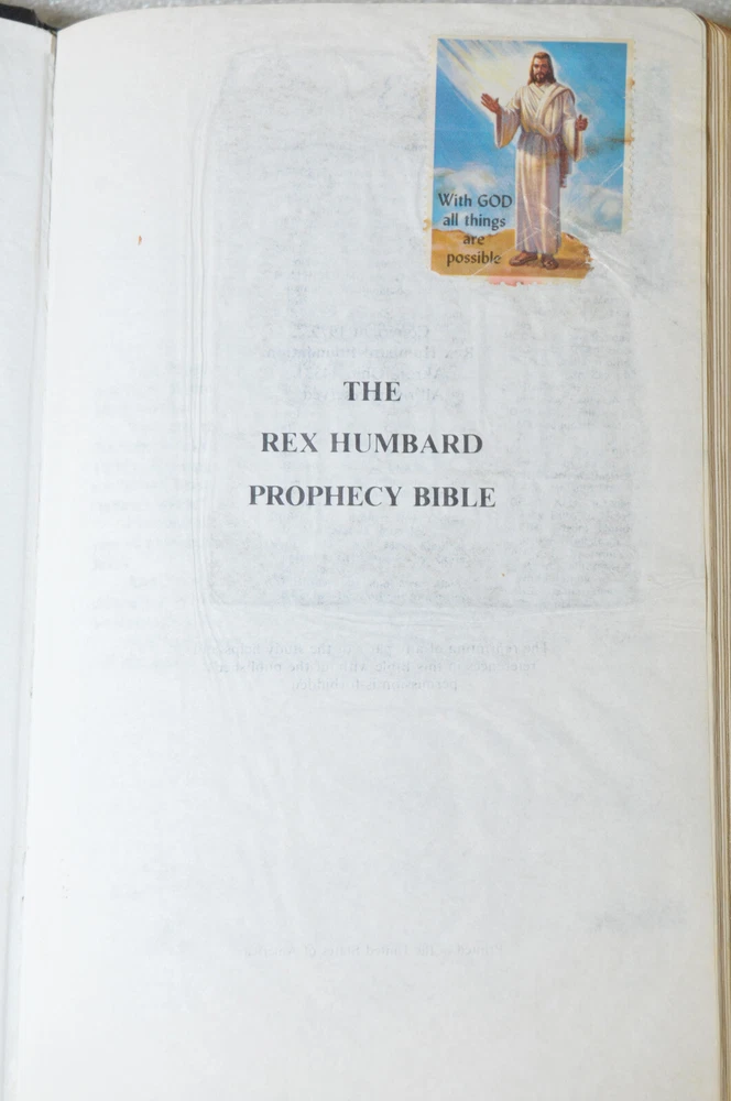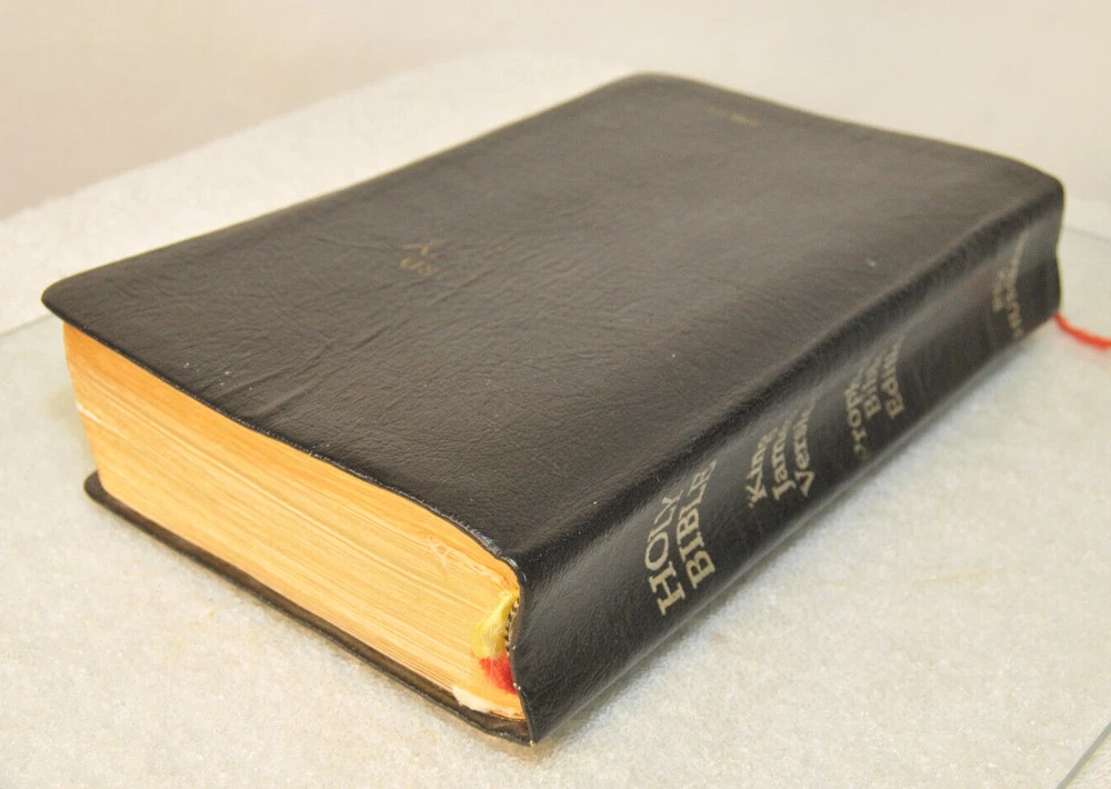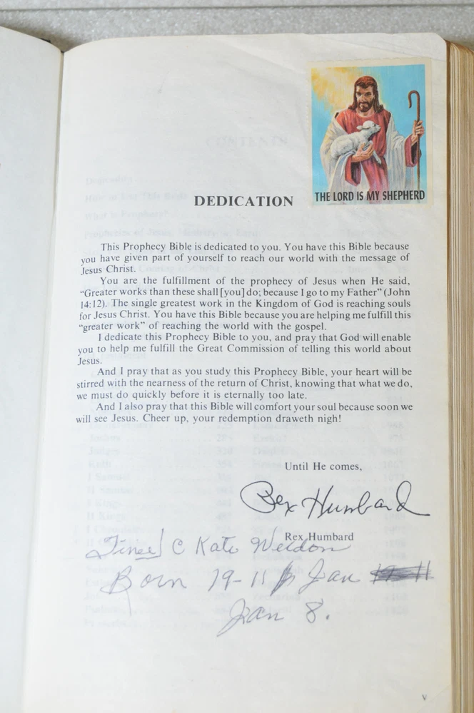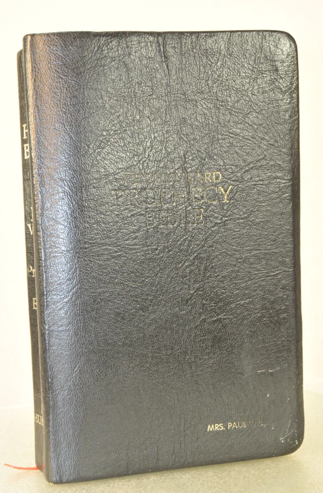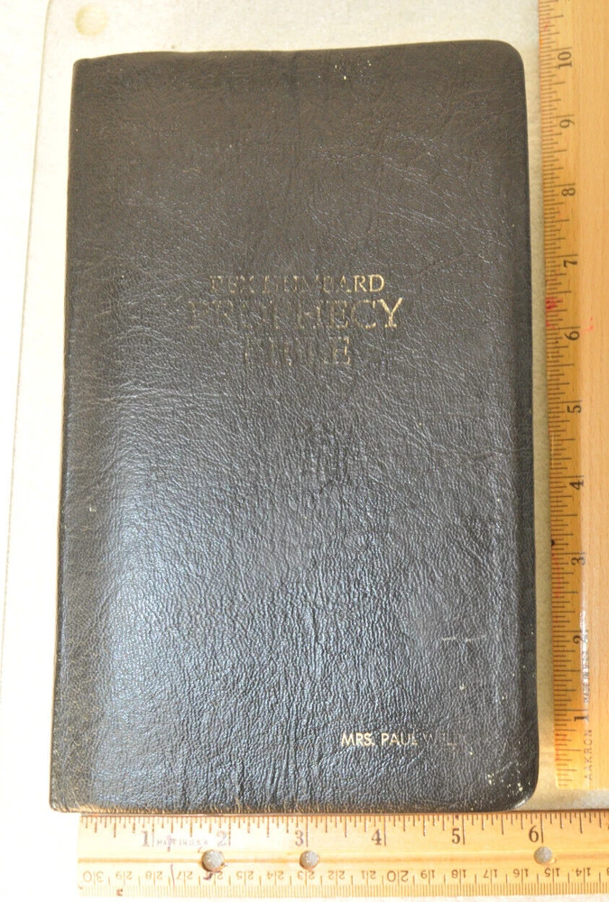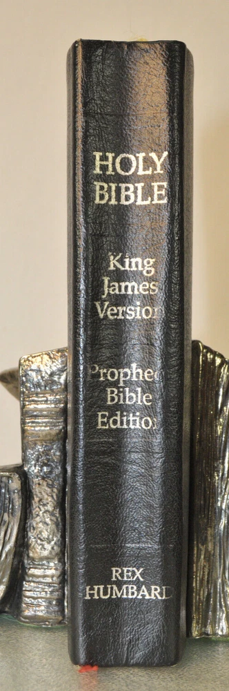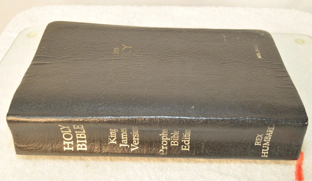 Rex Humbard Holy Bible Prophecy Edition King James Version Genuine Leather Bound Black 1979. Red Letter Edition. This is a well loved and used Bible. It has been marked and written in with ink pen. We offer this as many families have fond memories of this Bible and the Rex Humbard programming on television years ago. Good used condition. Leather cover shows shelf wear, but the leather is still soft and pliable. Family names inked on front end pages. Previous owner marked passages with ink pen and made small notes inside Bible. Previous owner was in habit of folding page corners over to mark passage that were meaningful to her. Please see all photos for details and condition.