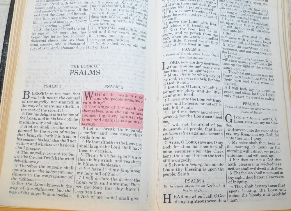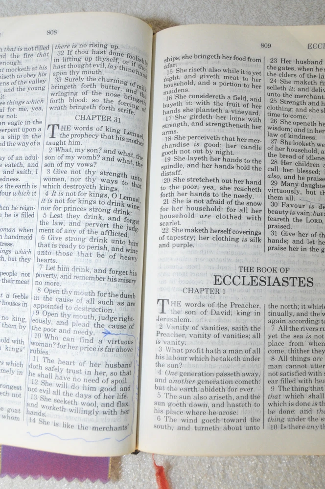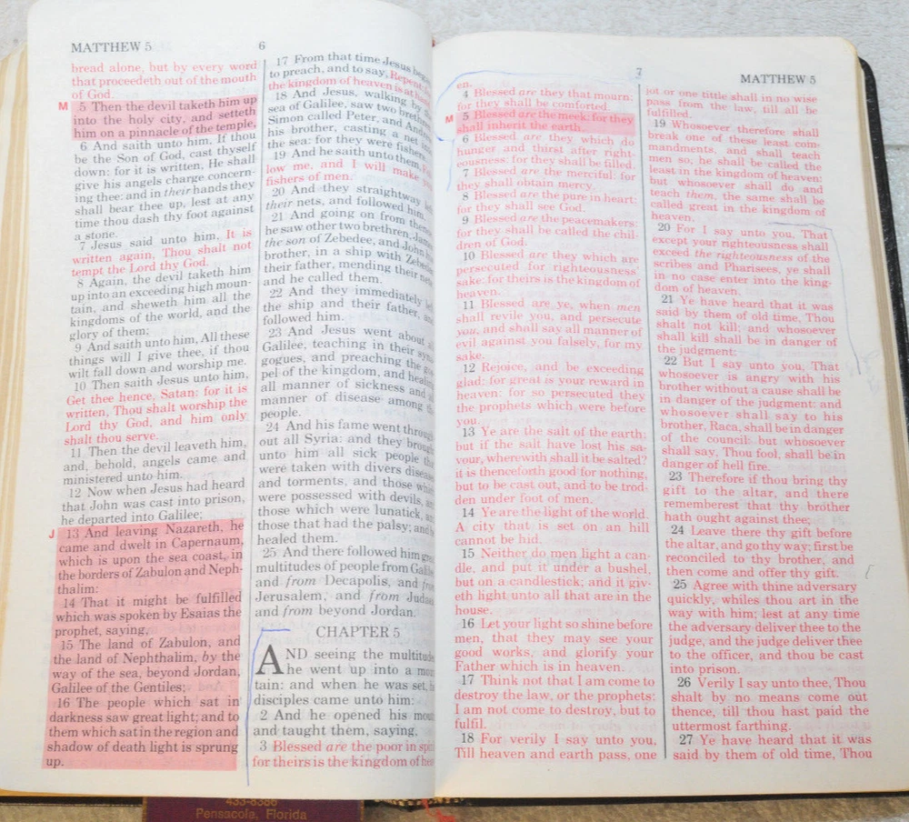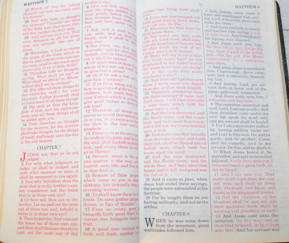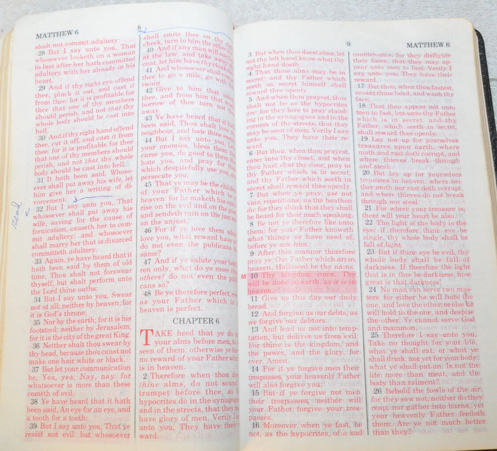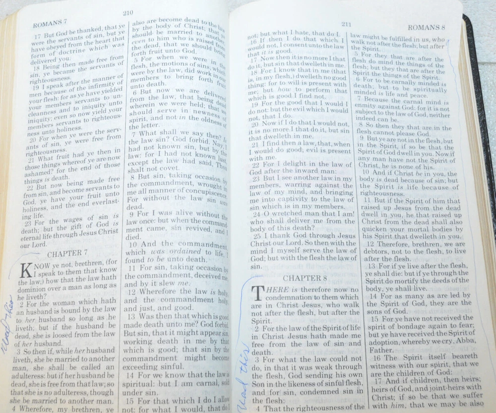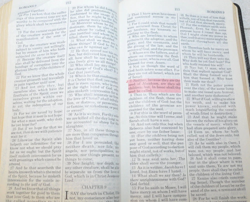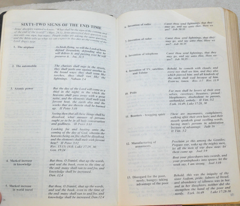 Rex Humbard Holy Bible Prophecy Edition King James Version Genuine Leather Bound Black 1979. Red Letter Edition. This is a well loved and used Bible. It has been marked and written in with ink pen. We offer this as many families have fond memories of this Bible and the Rex Humbard programming on television years ago. Good used condition. Leather cover shows shelf wear, but the leather is still soft and pliable. Family names inked on front end pages. Previous owner marked passages with ink pen and made small notes inside Bible. Previous owner was in habit of folding page corners over to mark passage that were meaningful to her. Please see all photos for details and condition.