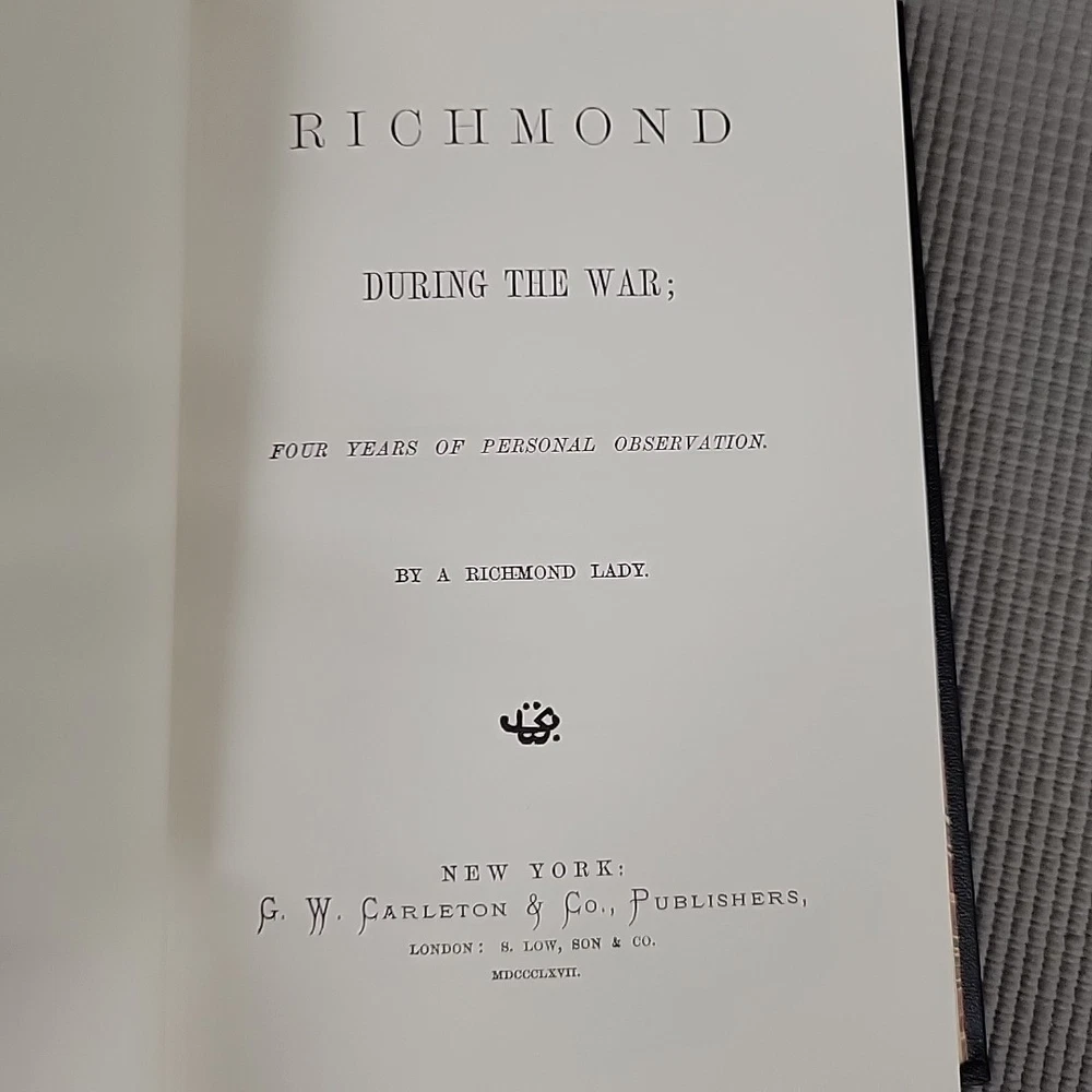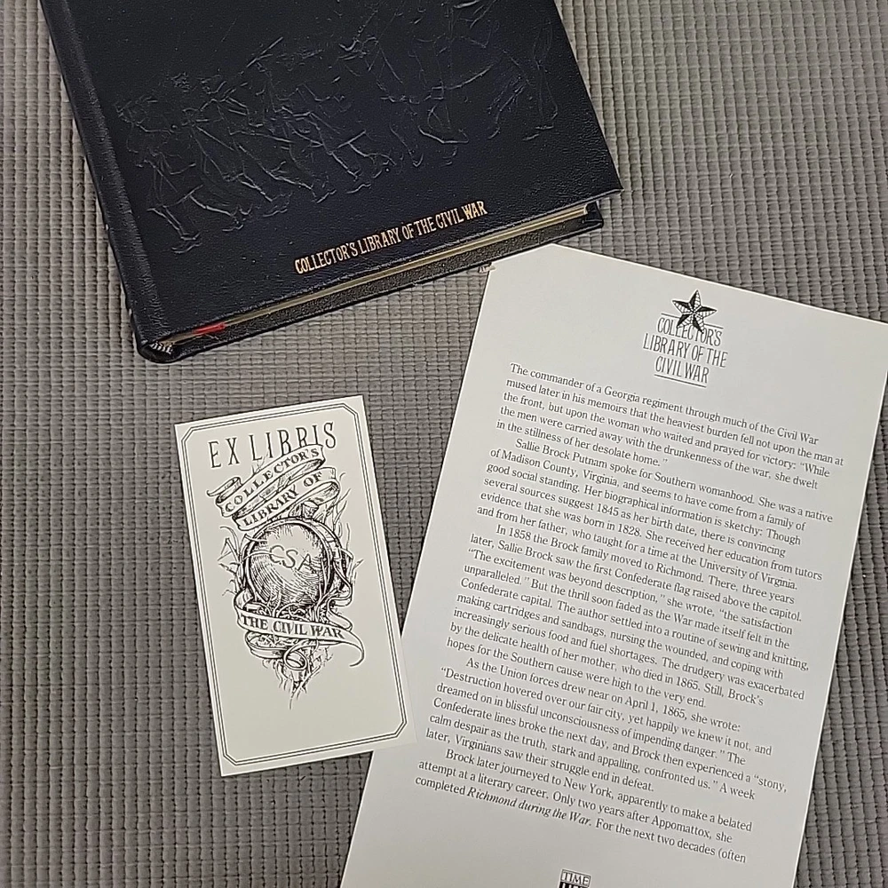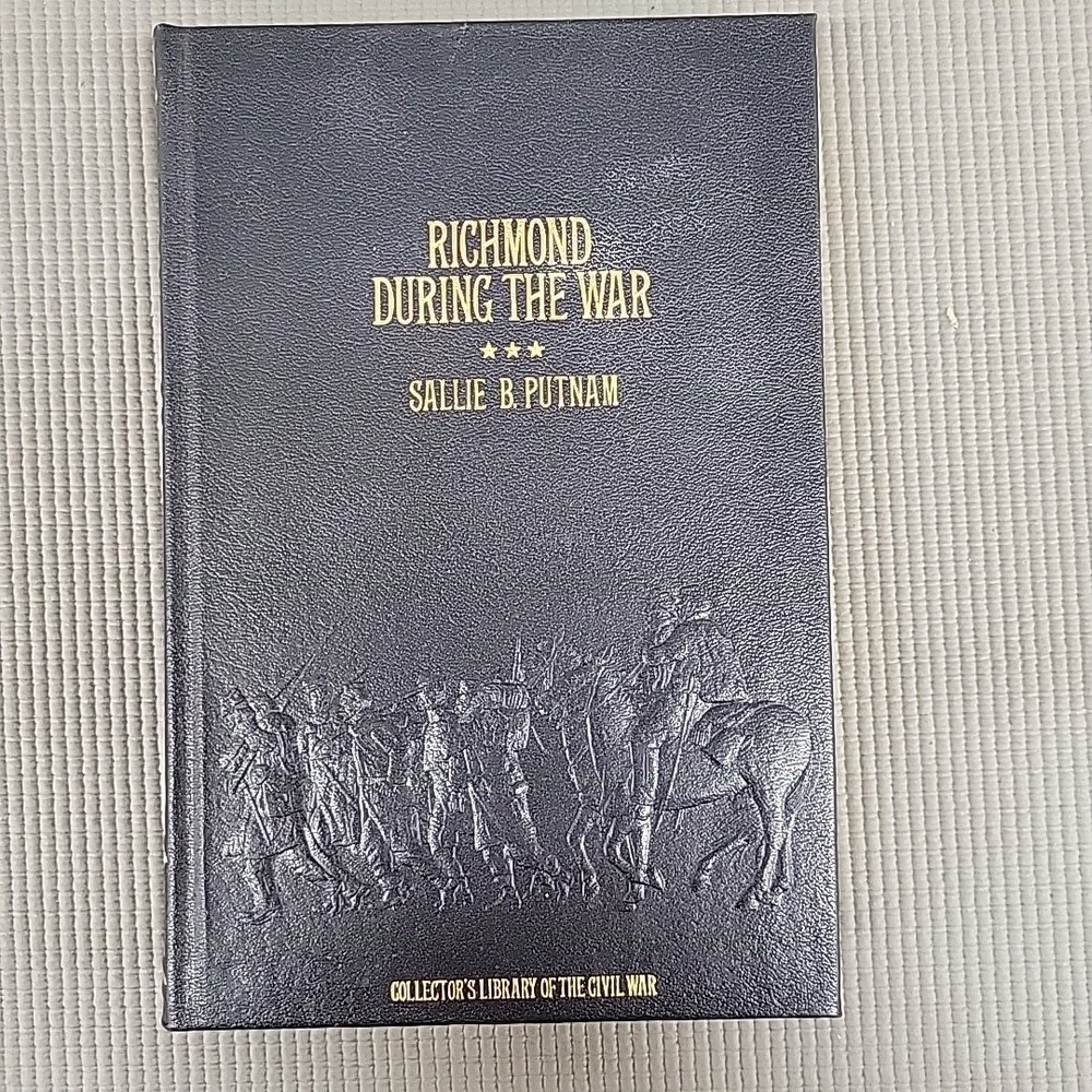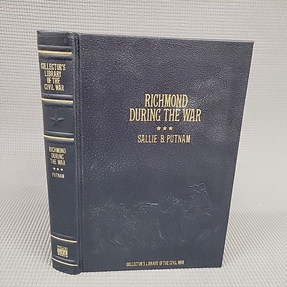 The product is a leather-bound book titled "Richmond During the War; Four Years of Personal Observation By Sallie B. Putnam." It is a nonfiction autobiography and history book published by Time Life Books in 1983. The book provides personal observations of the American Civil War in Richmond. It is 6 inches in length, 8.5 inches in height, and 1 inch in width, with 389 pages and weighing 1.66 pounds.