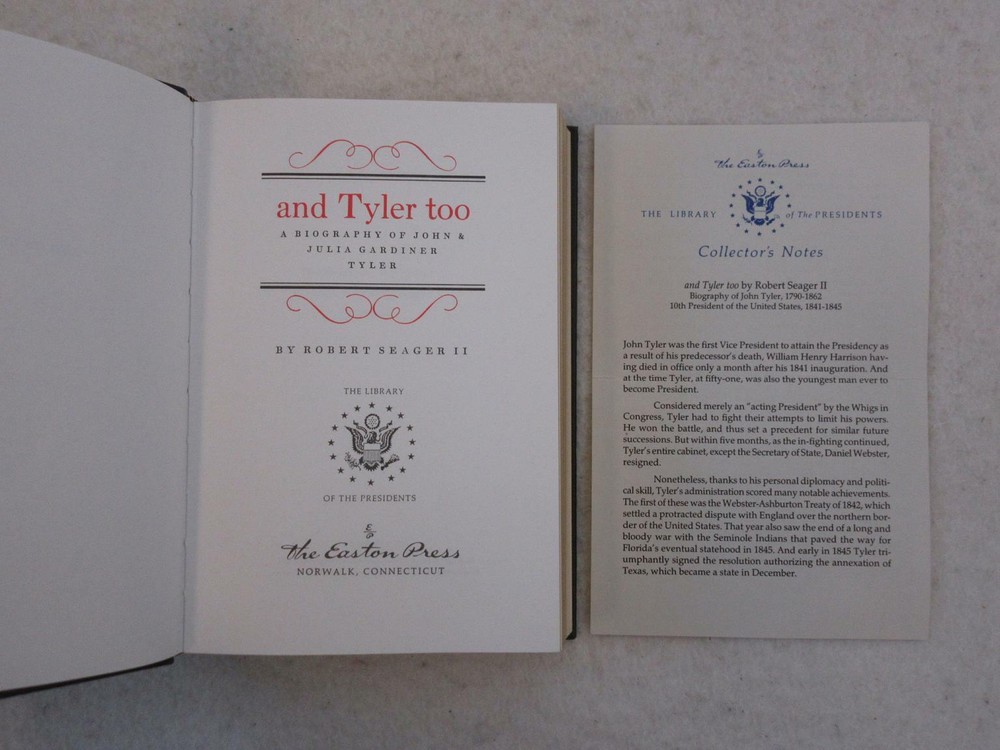Robert Seager II AND TYLER TOO Easton Press Library of the Presidents Leather In near fine condition. Includes Notes. Please examine photos for details. Condition: We strive to describe and photograph the condition of every item as accurately as possible. Photos are of the actual item that is being sold. Please examine the photos carefully for any condition details and possible flaws. Best Offers: Items are available for offers only after being listed for 30 days. We consider all offers in relation to current market values. We try to respond almost immediately to most offers. Most of our counteroffers are firm but we are open to bargaining. Shipping for US Customers: We combine shipping. When ordering multiple items from us please request a total before paying. We charge postage based on weight plus $1 for each eBay listing. All of our orders are packed carefully to prevent damage during shipment. We ship most of our items within 24 hours. Shipping for International Customers: All international orders are shipped via Ebay's Global Shipping Program. IF AN INTERNATIONAL CUSTOMER IS INTERESTED IN ORDERING MORE THAN ONE ITEM please do not Buy It Now or use the Make An Offer option on the listing. Rather message us first with a list of the items desired along with any offers. After we agree on prices we will combine all the orders into a single listing at the agreed upon total price. This will save you significantly on the cost of shipping. Contact Us: We are available 7 days a week and are happy to answer any questions you may have. Attention Sellers - Get Templates Image Hosting, Scheduling at Auctiva.com.