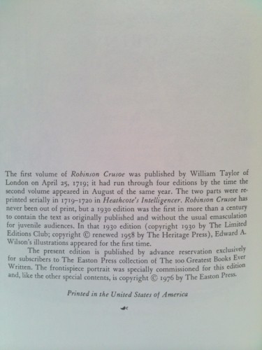 Robinson Crusoe by Daniel Defoe Limited edition. Shelf and handling wear to cover and binding, with general signs of previous use. Endpapers are Moiré fabric with satin ribbon marker. Gilded page edges, clean and unmarked. All pages are intact and binding is sound. Bound In full leather with hubbed spine. Secure packaging for safe delivery.