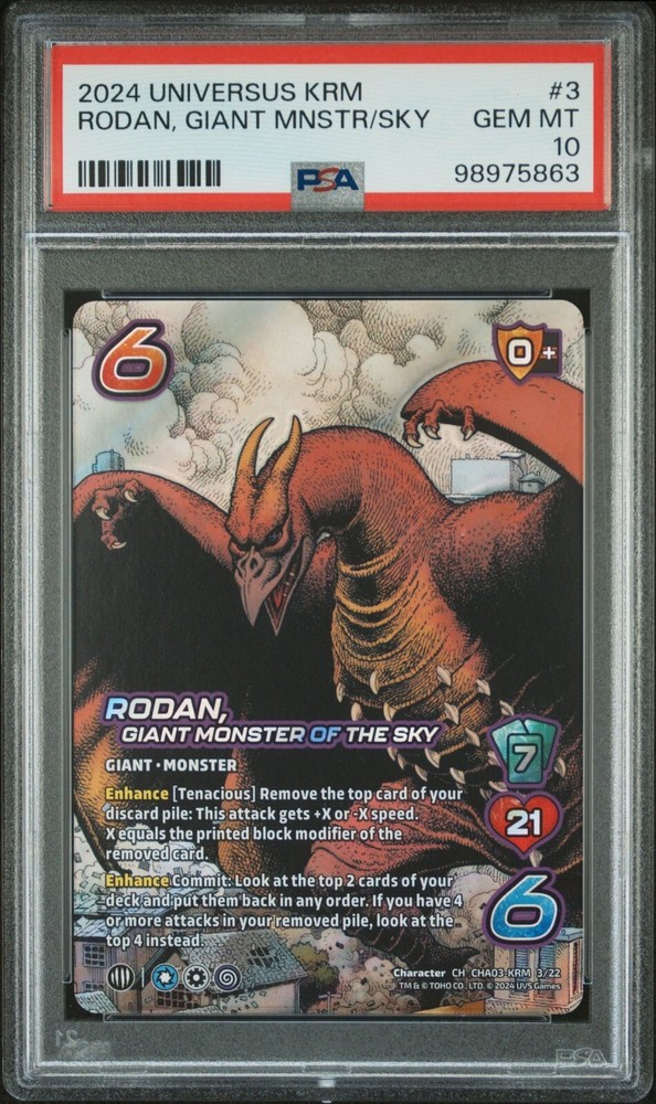 This Rodan card is a total game-changer for any UniVersus collector! The dynamic foil artwork makes the legendary monster pop with incredible detail, and the PSA 10 grade guarantees top-tier condition. Whether you're a Godzilla fan or a serious TCG player, this super rare Challenger Series card is a powerhouse addition to your deck or display. The quality is flawless, and it's awesome to see such an iconic kaiju in full art form. A must-own for fans of the franchise—definitely worth the hype!