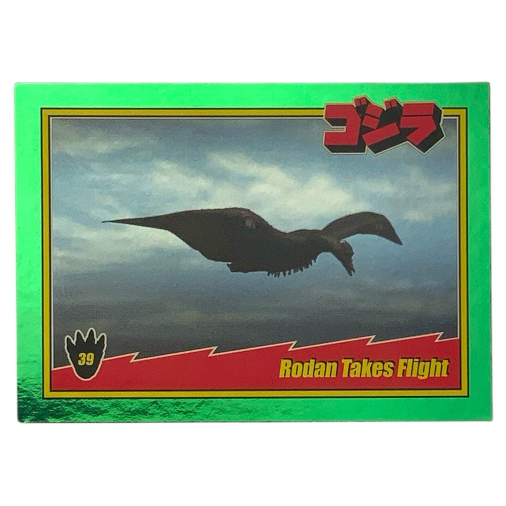 The "Rodan Takes Flight" trading card is part of the 2024 SUPER 7 GODZILLA series 1 set by Toho. This limited edition card features Rodan, a character from the Godzilla franchise, in a scene from the movie "Ghidorah, the Three-Headed Monster (1964)." It is made of card stock and has a green foil holo design, making it a standout addition to any non-sport trading card collection. The card number is 39, and it is a color foil variety.