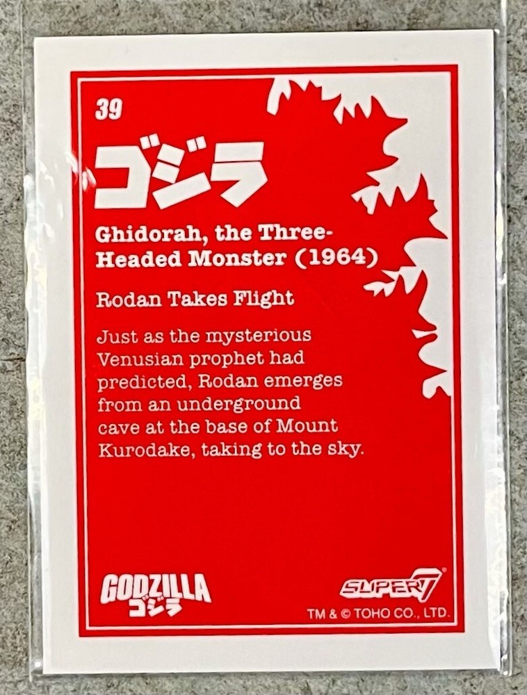 Absolutely love this SUPER 7 GODZILLA card! The art perfectly captures Rodan’s menacing flight, and the vintage Showa-era vibe is pure nostalgia. The colors pop, the details are crisp, and it feels like a high-quality collectible. As a longtime Godzilla fan, adding this to my collection was a no-brainer. It’s a fantastic tribute to a classic kaiju moment—highly recommended for any Toho enthusiast!