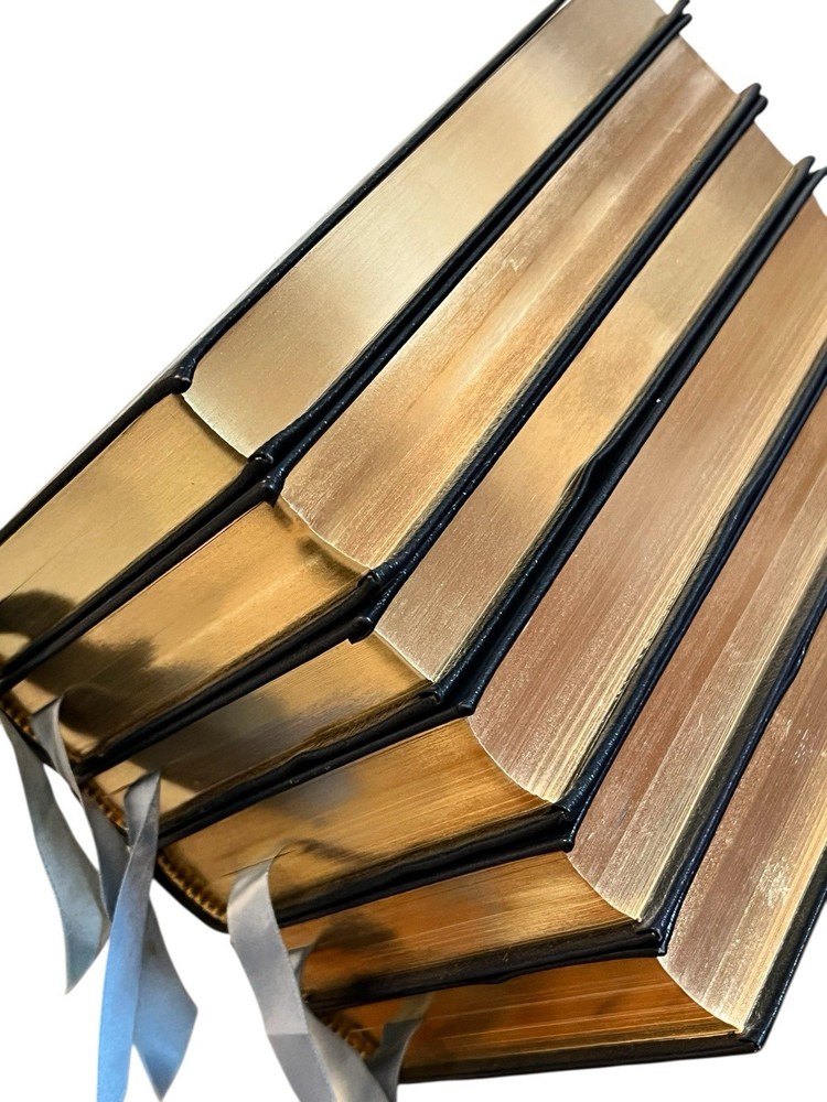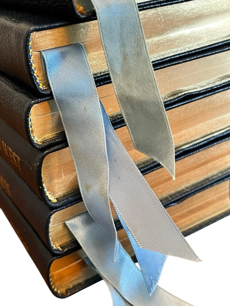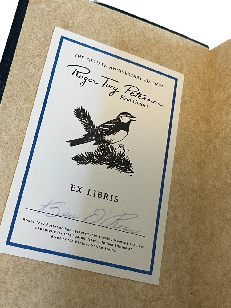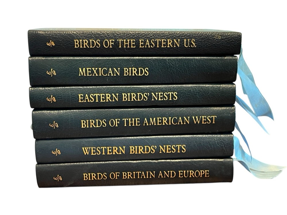 50th Anniversary edition Includes the following volumes: Birds of the American West Birds of Britain and Europe Birds of the Eastern United States Mexican Birds Western Birds' Nests Eastern Birds' Nests Soft covers bound in blue leather. Gold gilded page edges. Attached ribbon bookmarks. Excellent condition overall. Birds of Britain and Europe has light shelf wear on the cover and all but one of them have a name written on a bookplate inside the front cover. Some of the ribbon bookmarks have some discoloration. Please be sure to look closely at all photos for details.