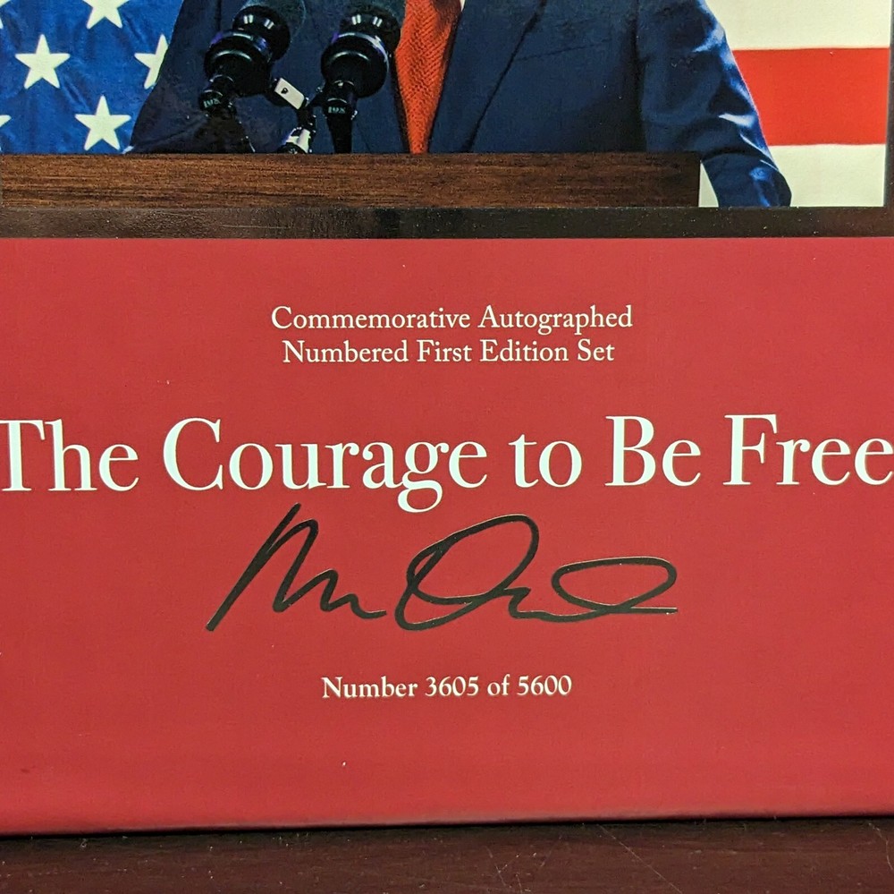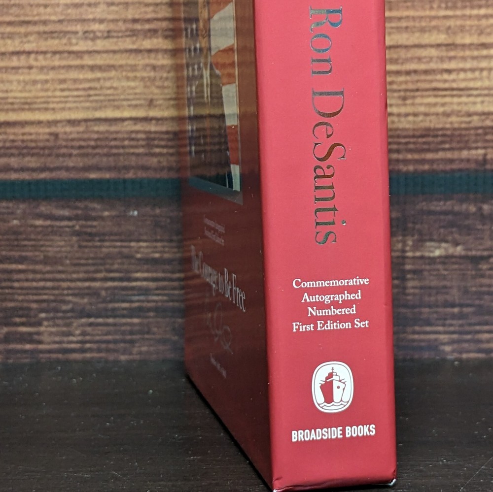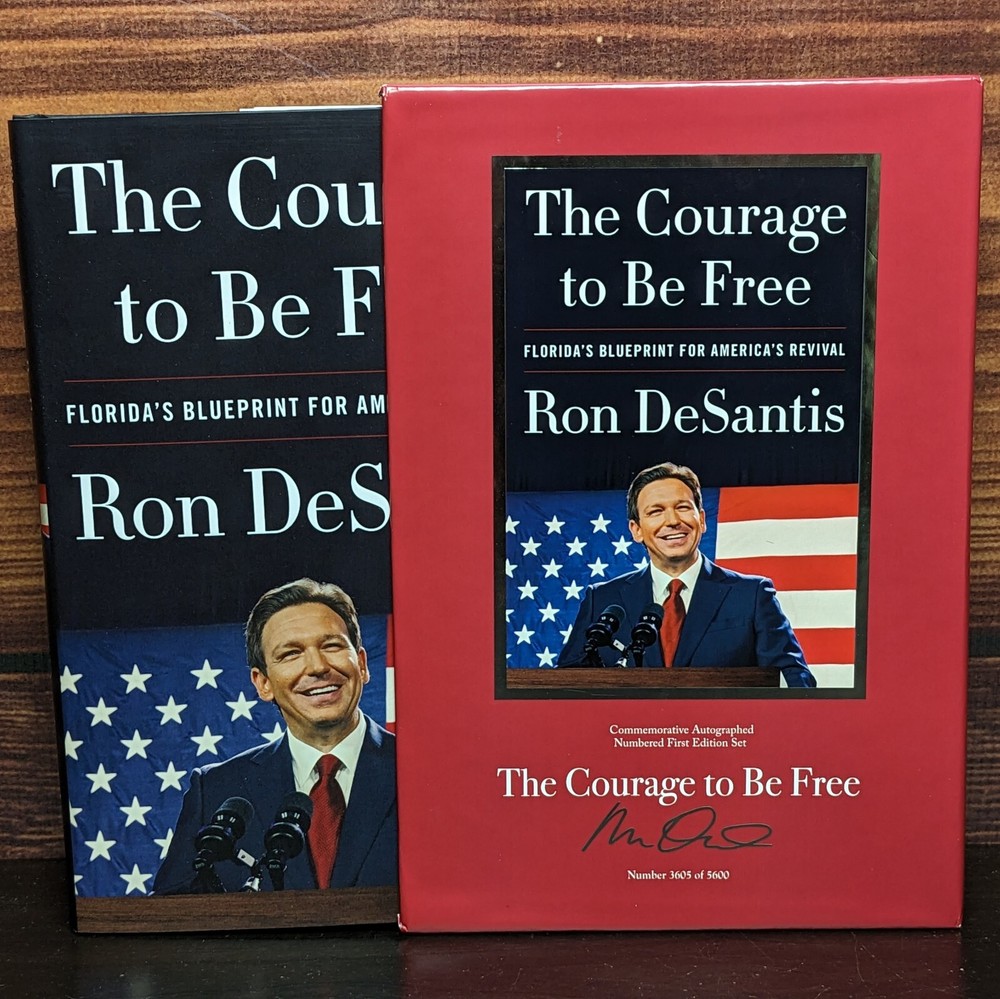 Ron DeSantis Signed Deluxe Collector Edition Set Book, Numbered out of 5600 copies. The Courage to Be Free: Florida's Blueprint for America's Revival Commemorative Autographed Numbered Limited Edition First Edition Set We have three copies of this book. Numbers 3605/5600, 3606/5600, and 3610/5600. All books come with a Certificate of Authenticity from Premiere Collectibles. Shipping via USPS Media Mail.