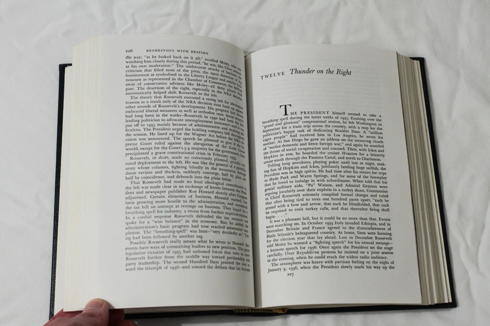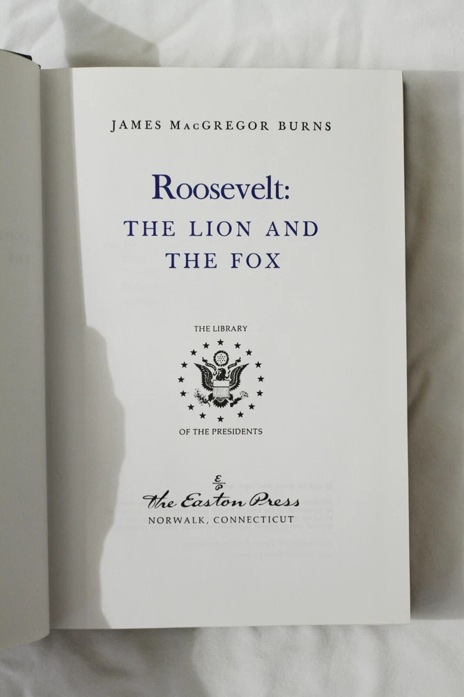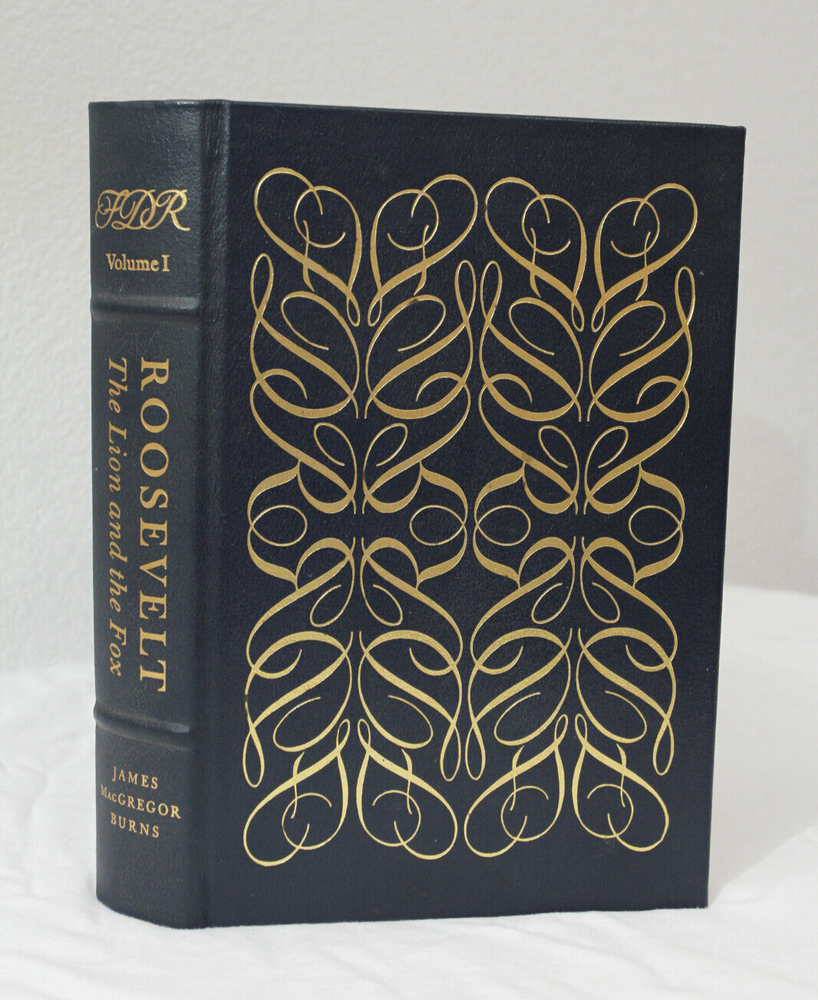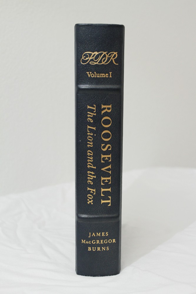 A good condition leather bound hardcover copy of 'Roosevelt: The Lion and the Fox' by James MacGregor Burns and published by Easton Press. The outside of the book has some rub wear from storage and a little scratching to the gold gilt page edges. The spine also appears to have a slight lean. Inside all pages are crisp and clean, with no writing or markings, as well as no folds. The book appears to have been read very little, if at all. Shipped via USPS Media Mail.