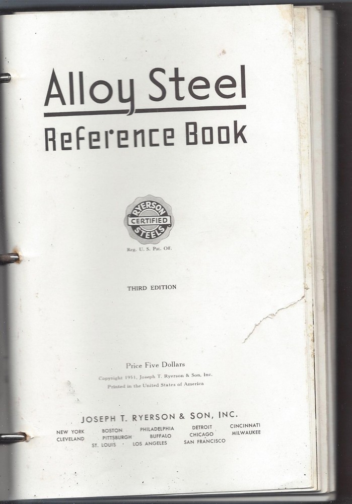 This is a 7" x 10" spiral bound leather edition with 11 sections and the supplement. The section pages are numbered in sequence up to 340 pages. Third Edition. Section topics: Chemical Analysis and Structure of Alloy Steel Heat Treatment of Ally Steels Testing Alloy Steel Physical Characteristics of Alloy Steels Buying, Mechanical Properties, Definitions of Alloy Steel Low Carbon Alloy Steels Medium Carbon Direct Hardening Alloy Steels Heat Treated Alloy Steels Tool Steels and Nitralloy Tables of Standard Technical Information Section XI Index Comments, offers welcome 14 Day Return Assurance Please Check out my other items ! Thank you