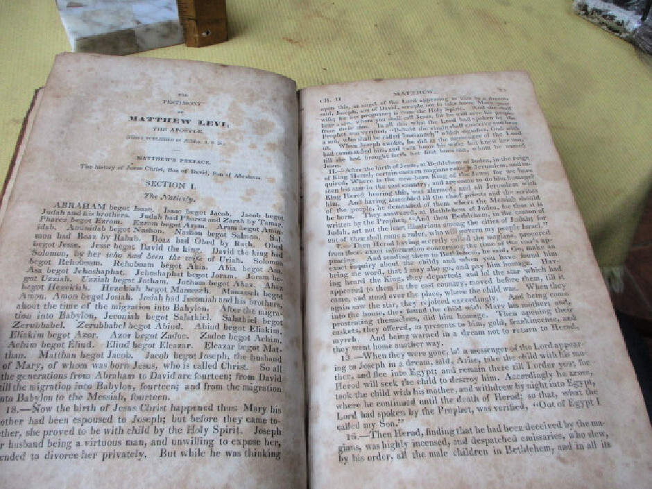 e1545. Sacred Writings of Apostles and Evangelist of Jesus Christ, commonly styled The New Testament. Translated from original Greek by Campbell, Macknight, Doddridge, with Appendix, etc by Alexander Campbell, 4th Edition, Bethany, Brooke Co., VA., 1835. Pub'd by M'Vay & Ewing. Octavo, 401 pages, full calf covers.....front cover reinforced within and 5 pages repaired. Folding color map in front in Good condition and another folding color map in poor condition at page 209. This is a survivor of old house fire with a couple scorch marks on top edges of both covers. Acceptable condition. PLEASE NOTE: This book has rudimentary repairs......not professional, but with enough skill to make it serviceable. Do not hesitate to e-mail with any questions. As Always, Satisfaction Guaranteed! I expect to receive payment within 10 days, unless we have made other arrangements. Shipping will be USPS Media mail or Priority, if requested. I'm glad to combine multiple purchases in order to minimize shipping costs. I WILL SHIP INTERNATIONALLY, and I try to be as economical as possible with the shipping costs. RETURN POLICY: Satisfaction Guaranteed! Track Page Views With Auctiva's FREE Counter