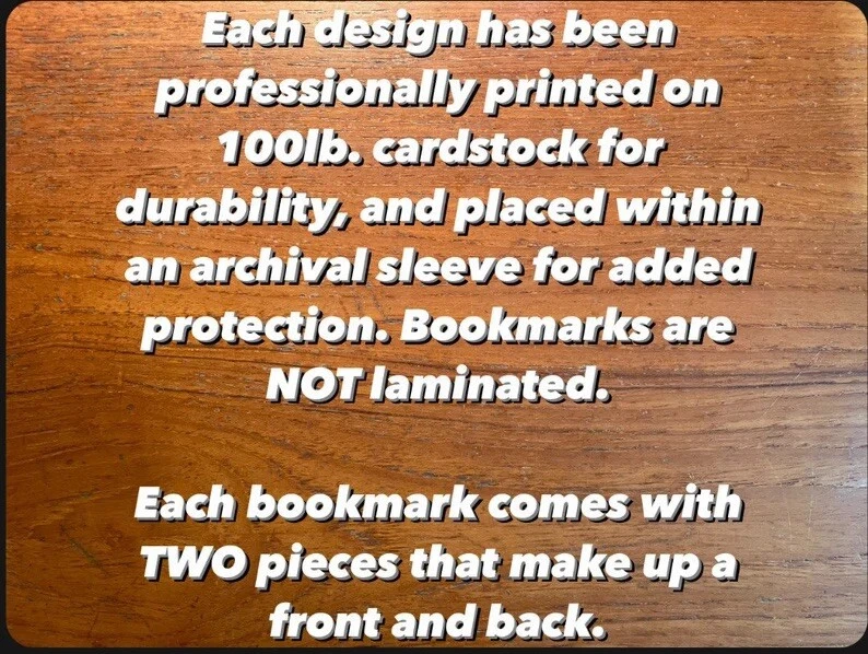 Each bookmark set comes with two designs of the same title serving as a "front" and a "back". All designs have been professionally printed on 100# cardstock for durability, and placed within an archival sleeve for protection. But of course you can remove them from the sleeve and use them separately if you wish. Bookmarks are NOT laminated. Please choose your design(s) from the dropdown menu. Makes a fantastic gift for all bibliophiles, including yourself! Be sure to check my other listings for more bookmarks... Comes from my smoke and pet free home.