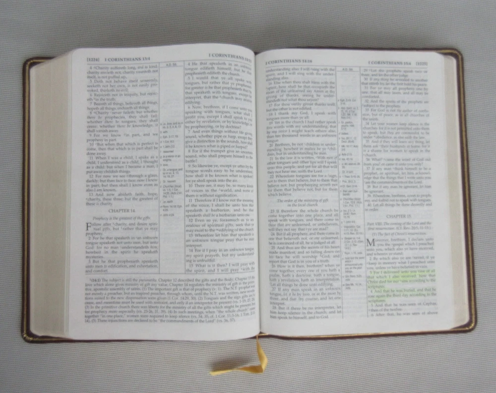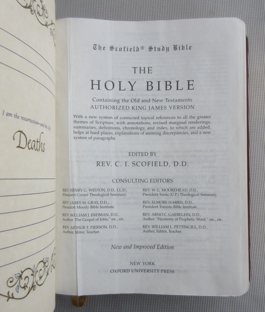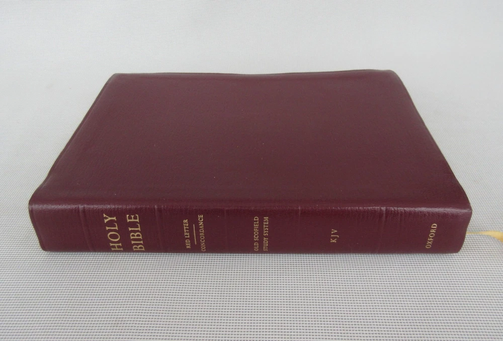 Scofield Study Bible (King James Version) New & Improved Edition edited by Rev. C. I. Scofield, D.D. published by Oxford University Press New York 1996 Flexible boards ; maps; binding intact; internal and external hinges intact; burgundy colored leather covers; gold text and graphics on spine ; single ribbon bookmark; 1610 pages including concordance and various indices; some light yellow highlighted verses (see photos); no torn or missing pages; 9-1/2" x 7". I am not a professional book appraiser. Please use the photos to make your own judgment of the book's condition. Shipping to any domestic (US) address will be made through USPS Media Mail (2 - 10 days delivery time.) Purchases with shipment to any location outside the United States will be made via eBay International Delivery. Combined shipping is available on most of our listings. If a calculated shipping charge on multiple items seems unreasonable, it probably is. Sometimes the eBay Rate Calculator has a mind of its own. Contact us with your interests and with your zip code and we will do our best to respond quickly with an accurate shipping quote. All items we offer are guaranteed to be correctly represented to the best of our knowledge. Most of the items we list are vintage or antique, and may have minor nicks, dings, scuffs, scratches, wear, etc. as would be expected. In our descriptions of listings we try to be as complete as possible. The absence of a condition statement does not imply that the item is in perfect condition or completely free from wear and tear, imperfections, or the effects of aging. What is found in the description and/or seen in the photos is the extent of what is included in this listing. Please do not assume that this listing has or should have additional parts, pieces, or accessories that are not detailed in the description and/or is not shown in the photos. If you need more details or have any specific questions about the listing or what is included please email us prior to purchase. All items are sold "as is." By purchasing this item you are agreeing that 1) you have read the complete description, 2) reviewed all photos, and 3) have asked any questions of concern.