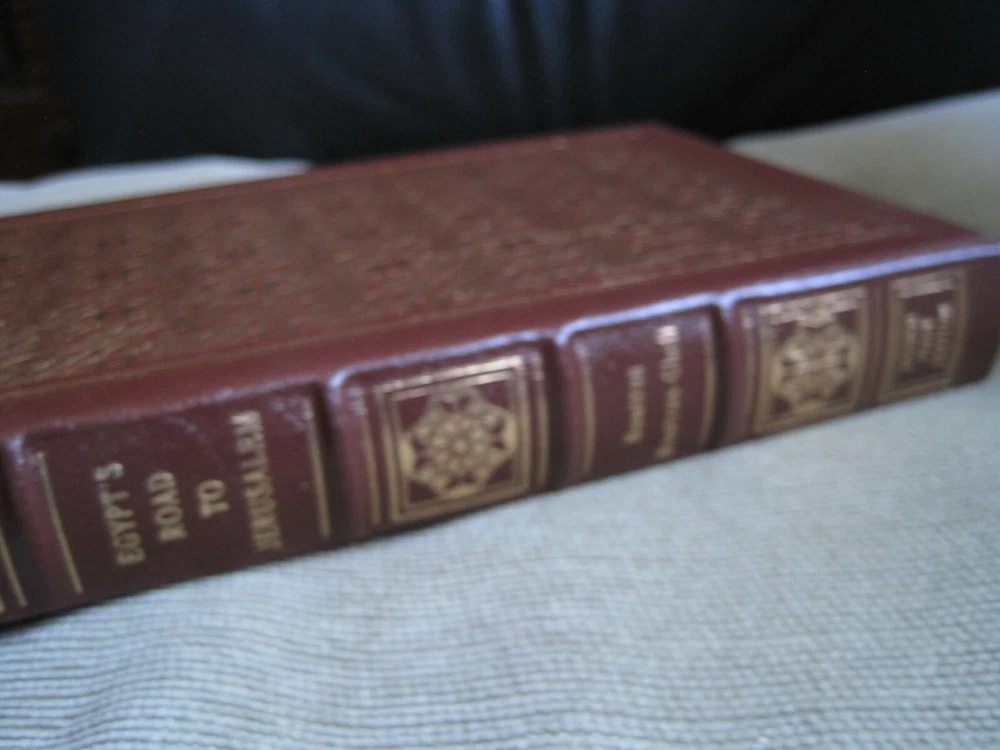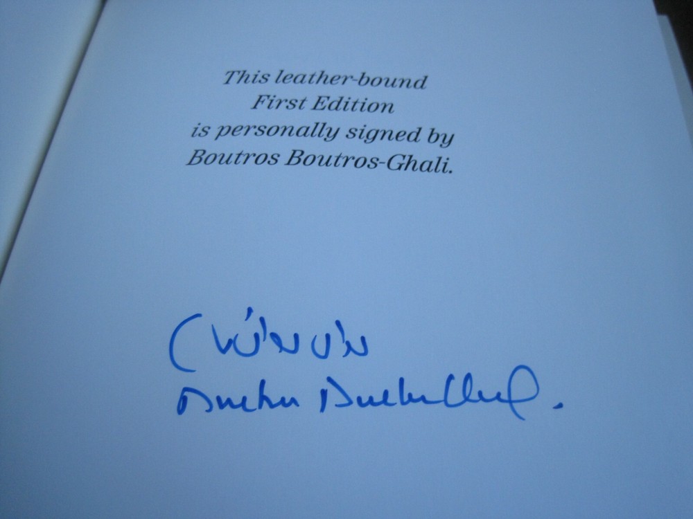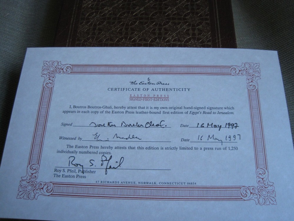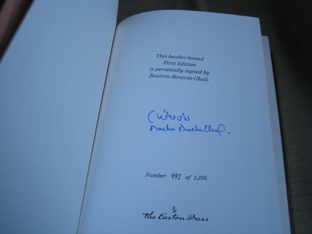 This is a leather bound signed numbered first edition of former UN Secretary-General Boutros Boutros-Ghali's best-seller - "Egypt's Road To Jerusalem" . The book is new, unread and in great condition. Signed by the author, the late Egyptian diplomat and politician on the limitation page, it also includes a signed and dated certificate of authenticity. This is number 442 of only 1250 copies ever printed of this limited first edition. Easton Press books are the golden standard in the publishing industry, highly collectible and lasting generations. Easton Press Full Genuine Leather Dubbed Spine Accented Wit 22 kt. Real Gold Satin Ribbon Page Marker Distinctive Cover Design Gilded Page Edges To Protect Against Humidity High Quality Acid - Free paper Smyth-Sewn Pages Silk-Moire Endleaves I combine multiple items for savings on shipping charges. I ship worldwide. Please ask about international shipping charges and/or different shipping options.Thank you!