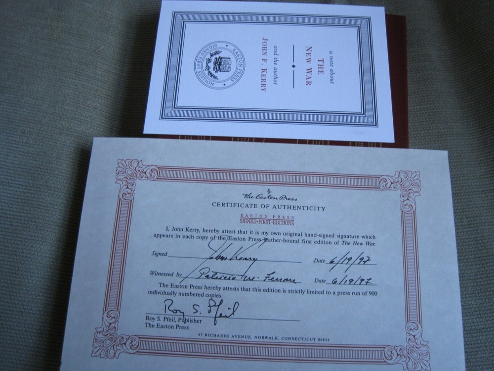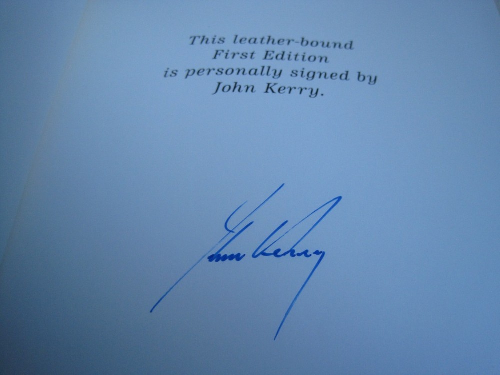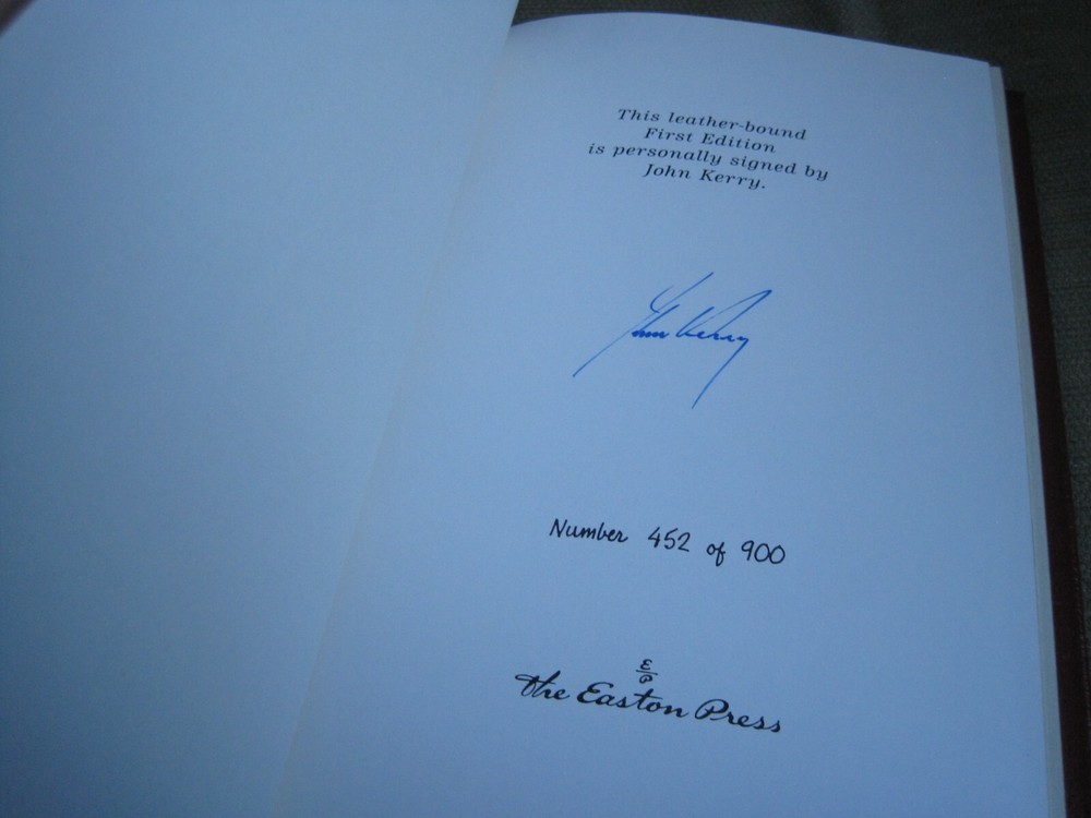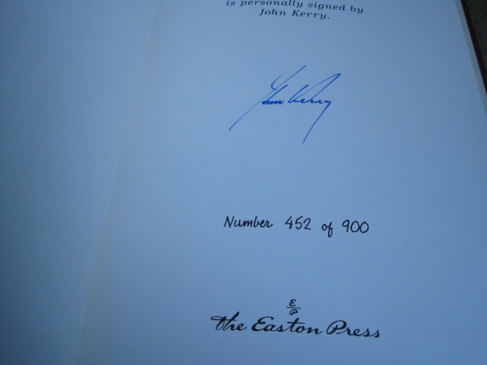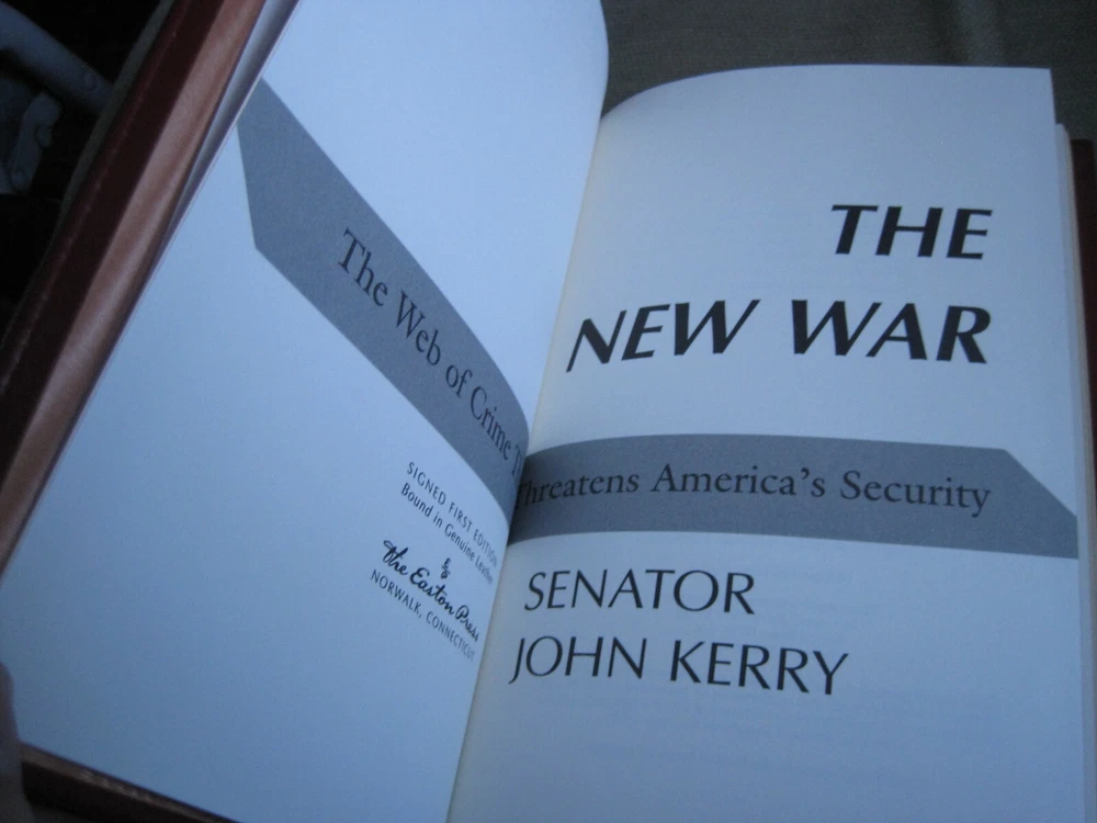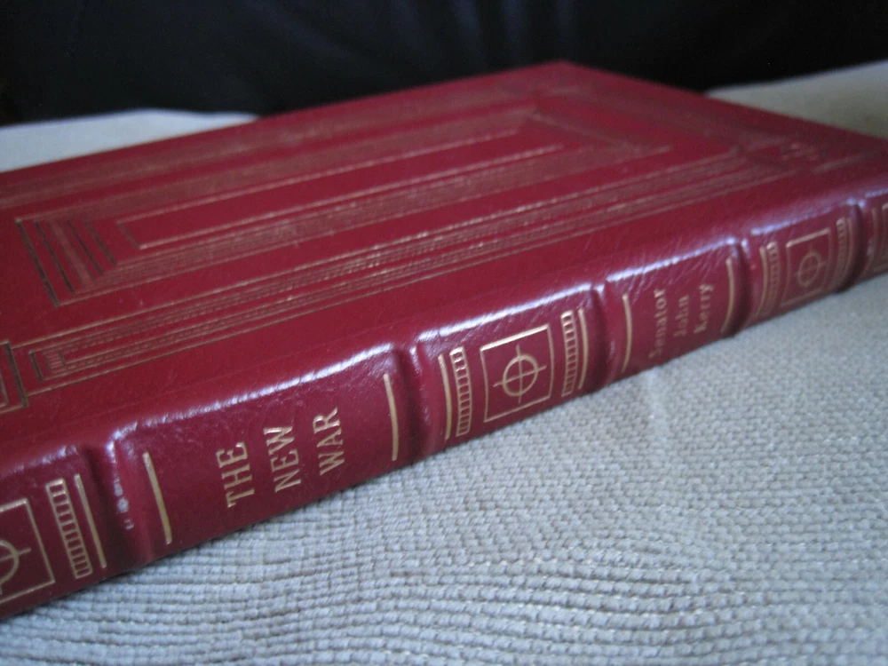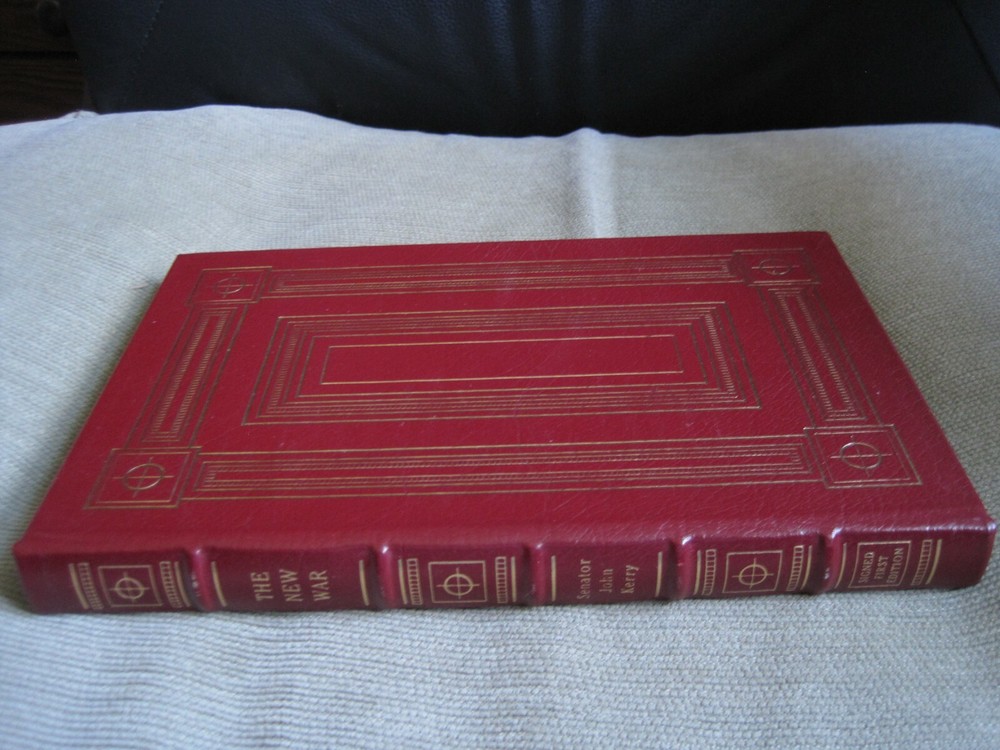 This is a leather bound signed numbered first edition of former Senator and Secretary of State John Kerry's best-seller - "The New War" . The book is new, unread and in great condition. Signed by the author on the limitation page, it also includes a signed and dated certificate of authenticity, and the publisher's note card. This is number 452 of only 900 copies ever printed of this limited first edition. Easton Press books are the golden standard in the publishing industry, highly collectible and lasting generations. Easton Press Full Genuine Leather Dubbed Spine Accented Wit 22 kt. Real Gold Satin Ribbon Page Marker Distinctive Cover Design Gilded Page Edges To Protect Against Humidity High Quality Acid - Free paper Smyth-Sewn Pages Silk-Moire Endleaves I combine multiple items for savings on shipping charges. I ship worldwide. Please ask about international shipping charges and/or different shipping options.Thank you!
