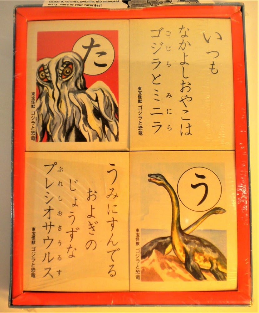 (I have a website to offer you if you would like to learn additional information and for reference of this set. Please message me about it.) SEIKA KARUTA GODZILLA AND DINOSAURS 1978 - TRADITIONAL JAPANESE CARD GAME - DEAD STOCK UNOPENED - NEW When it comes to Godzilla Karuta or paper-made collectibles, this Seika Karuta Godzilla and Dinosaurs card game is rare. In checking the major websites (as of this listing date), no set is available for sale. The card game is dead stock from a retail store in Japan. It has not been opened and the four decks and or packs of cards are wrapped in plastic. All the cards within the tray are new, in mint condition probably with some color fading for being decades old (I am not sure, never opened). The illustration artwork of the Toho Godzilla movie monster characters and dinosaurs represents a Showa period style. I have seen photos of Godzilla with his son Minilla and Hedorah, they look great. I do not know who did the artwork for the cover of the box or the cards. The illustrations are beautiful, and perhaps the illustrations were produced by a well-known Manga artist of the time (1978). The box and or package measures approximately 5.5" in length by 7" in width and 1" in height. The inner box is red in color compared to the green-colored version. Overall, the box is in very good condition for its age with minor creases and dents (see photos). Within the box, there are four packs of cards that measure approximately 2" 3/8 by 3" 1/8. I do not know how many cards there are in total or how many are in a pack. I do not know how many illustrations of the Toho Godzilla movie monster characters and dinosaurs there are. What I know is that in all likely hood, you will never see a complete set like this one, in this condition, listed on any major website. A rare, vintage Goji collectible that is difficult to find and buy in this condition. All my inventory-stock is authorized and licensed by various companies here in the U.S.A., Japan, or abroad. They have been maintained in the very best condition possible over the years or decades. I urge you to bid or buy this now from me while it is available for sale! Please take a moment to read this before you place a bid or make a purchase from me. I use as much time as needed to check, double-check and triple-check every listing that I place on eBay, however, I do make mistakes in my listings now and then. I do, and when brought to my attention, will always correct any mistake in my listing. I would ask you to please be familiar with or know about the item that you will place a bid on or purchase from me. If you need additional information, or if you have any concerns or questions about the listing, please contact me before you place any bid or before you purchase the item from me. If this is a gift for someone, please know that if this is not the item they would like to receive, I offer no exchanges or returns, all sales are final. If a bid was won or if a purchase was made, the completion of the payment is expected. It is out of my control and not my responsibility if a most beloved family pet inadvertently placed a bid or made a purchase accidentally or not on a computer or smartphone without the eBay account holder knowing. The transaction will not be canceled by me! Regarding my shipping charges, when I do charge, charges from me are the actual shipping charges. Whatever carrier I choose, shipping charges are determined by the size of the shipping box and the weight. I try my best to use an overabundance of packaging material to protect the item during transit, which affects the weight. All my shipping charges are subject to eBay's "Final Value fee" and the fee has to be taken into account with my shipping charge. When I do charge for shipping, many times I do not charge enough to cover all the shipping costs. In the rare cases that I have overcharged in my shipping cost, I have refunded the overcharge amount to my customers through PayPal. My customers throughout the many years of selling on eBay where I have overcharged in error on my shipping costs can attest to the above statement. Please take a moment to learn something about me, I am an eBay seller who tries his very best to offer all my customers the very best-best conditioned collectibles that the world has to offer along with the very best customer service that I can provide. I want every customer of mine to know that I am not your "average seller on eBay," I operate a very small and personalized "pop operation" that caters to his customers. It has blessed me and brought me great joy to have so many grandmothers, mothers, and dads buy from me for their loved ones. Sometimes, I do not have the lowest price for a collectible item.