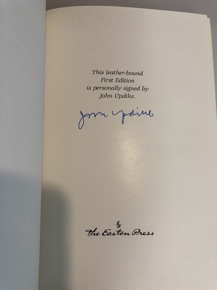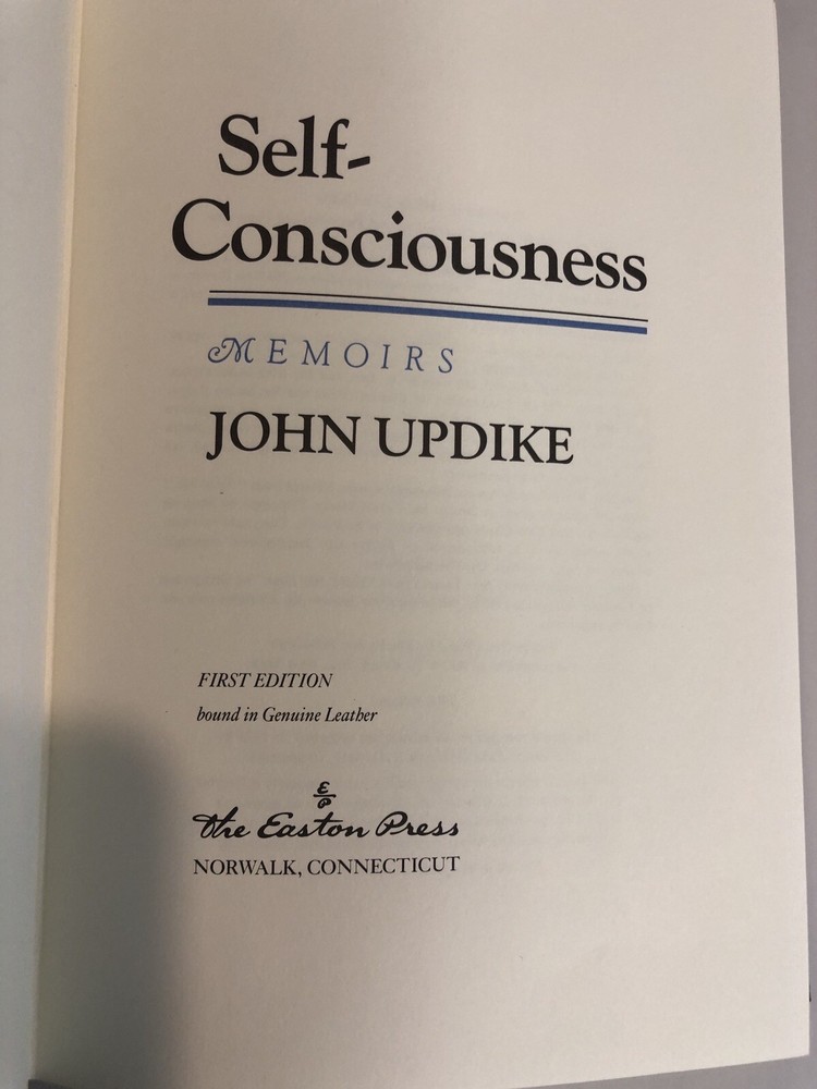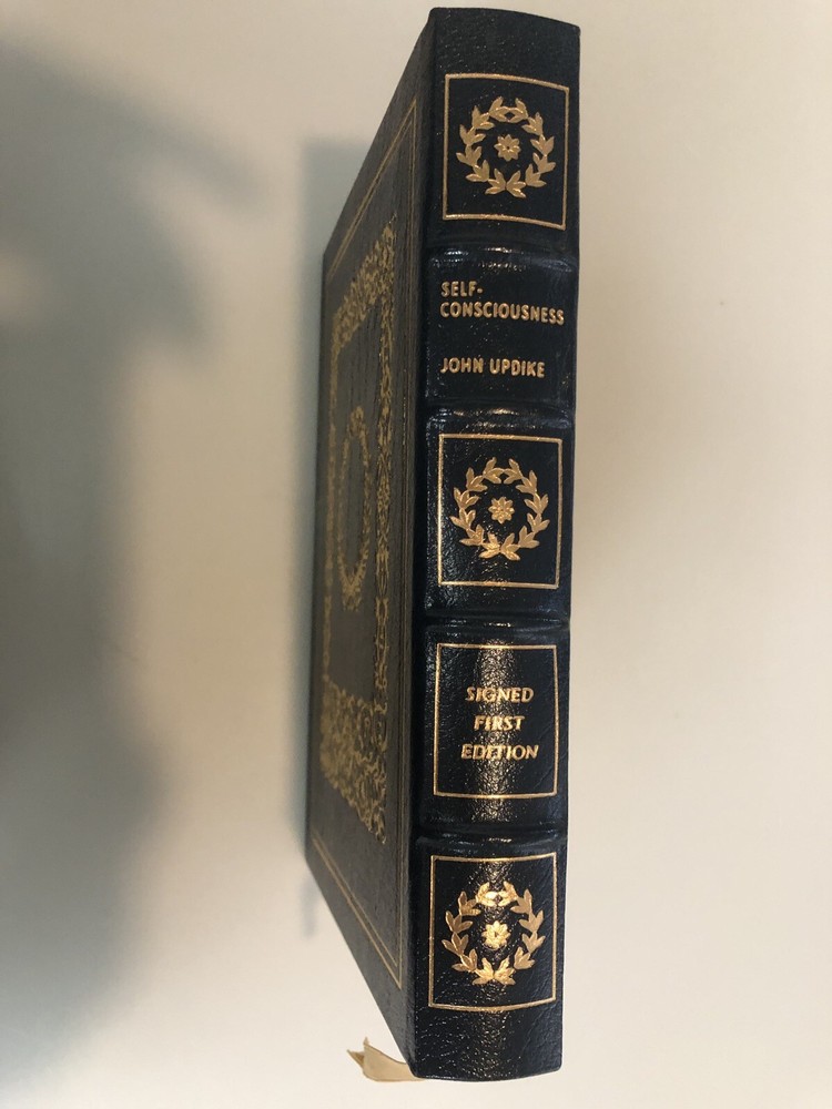 John Updike SELF-CONSCIOUSNESS : Signed Easton Press 1st Edition 1st Printing Hardcover Norwalk, Connecticut Easton Press 1989 Fine, Leather Bound. Book accented in 22kt gold. Signed by Updike. Printed on archival paper with gilded edges. The endsheets are of moire fabric with a silk ribbon page marker. Smyth sewing and concealed muslin joints to ensure the highest quality binding. This book is in full leather with hubbed spines. Signed Limited Edition