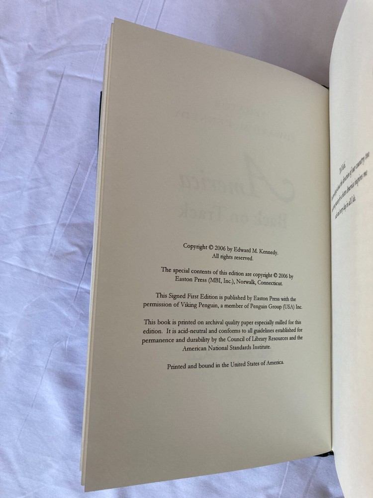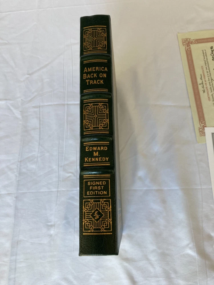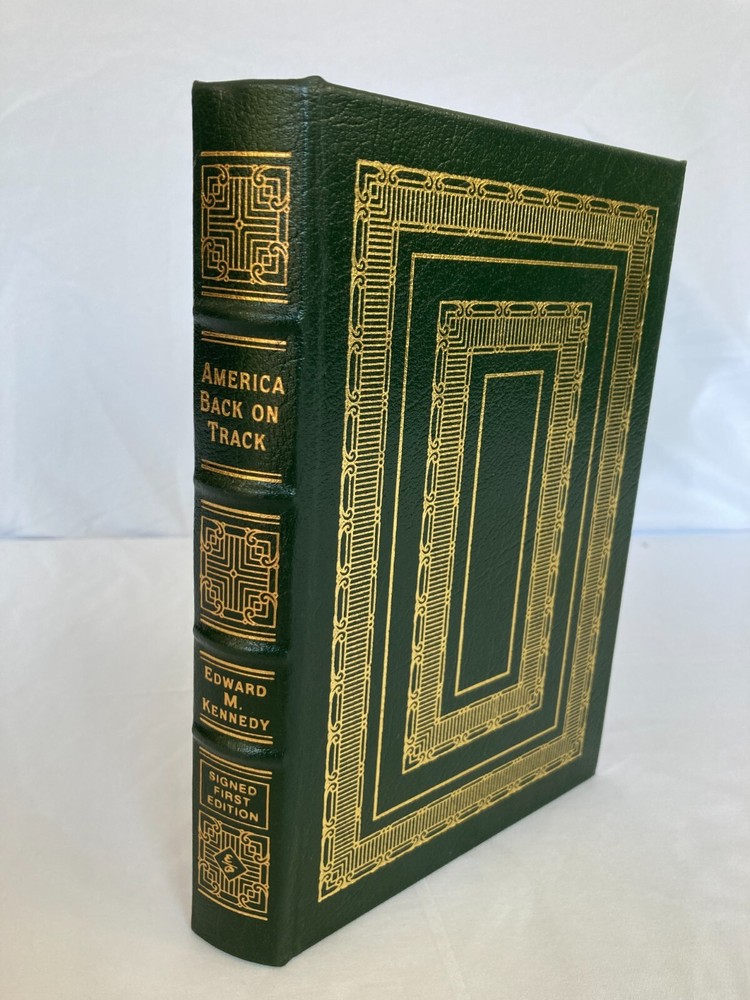 WRITIER/ARTIST : Edward M. Kennedy (Boston, Massachusettes, Hyannis Port, 1932-2009) TITLE : America Back on Track, Easton Press, 2006 PUBLISHER : Easton Press DESCRIPTION : For sale is a leather-bound, signed limited edition book by former United States Senator Edward M. Kennedy's America Back on Track published by Easton Press in 2006. The book is signed by Kennedy on the book's colophon. This edition was limited to only 1,750 signed copies. This is copy number 1,020. CONDITION : The book is in near fine condition with minor rubbing to the board edges, see photos. The spine and boards are tight and straight. There are no internal markings other than Kennedy's signature. There is no previous owner's bookplate or markings. The page-edge gilt is in very good condition with minor scratching to the top and bottom page edge guilt, see photos. Let me know if you have any questions. Don't forget to take a look at my other signed, limited edition books and prints for sale. Thank you