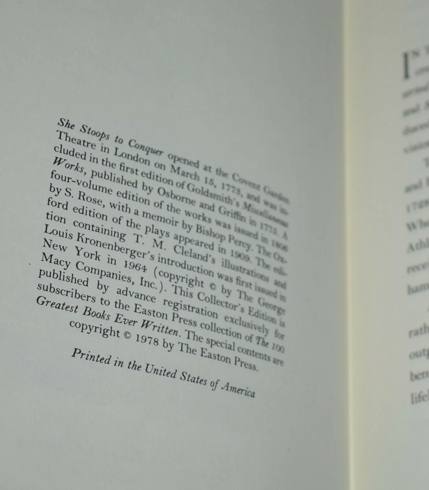 SHE STOOPS TO CONQUER by Oliver Goldsmith Easton Press Leather Bound In great condition, bought then placed on my bookshelf for decades. Please see my many photos. Check out my many other listings, many more Easton Press books coming.