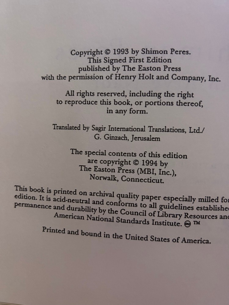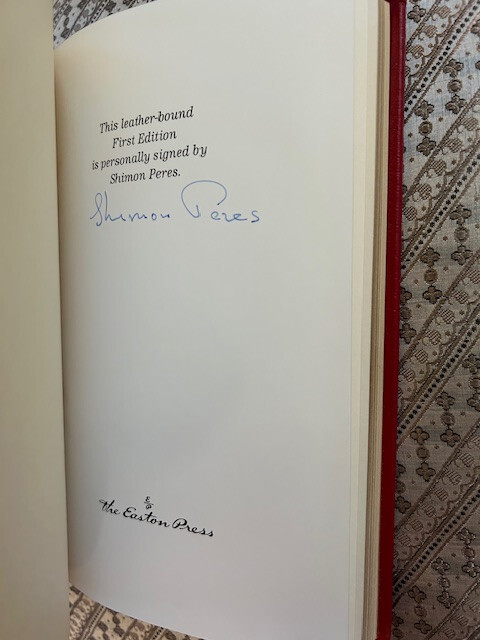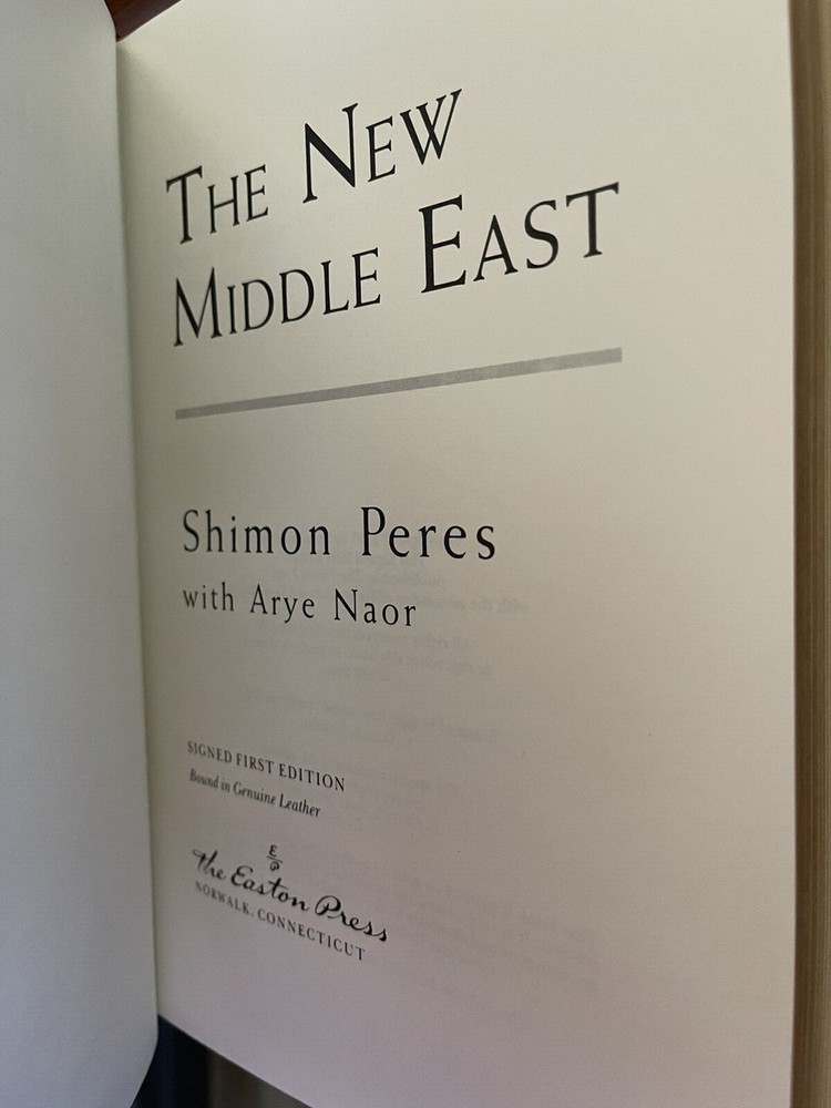 Shimon Peres 2 August 1923 – 28 September 2016) was an Israeli politician who served as the eighth prime minister of Israel from 1984 to 1986 and from 1995 to 1996, and as the ninth president of Israel from 2007 to 2014. He was a member of twelve cabinets and represented five political parties in a political career spanning 70 years. Nobel Peace Prize 1994. HAND AUTOGRAPHED SIGNED 1993 1st EASTON PRESS LEATHER "THE NEW MIDDLE EAST" EXCELLENT UNREAD CONDITION.
