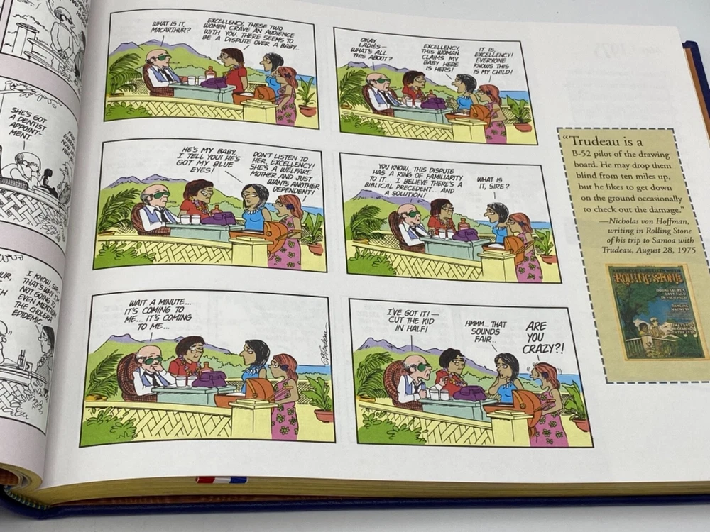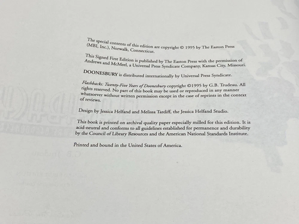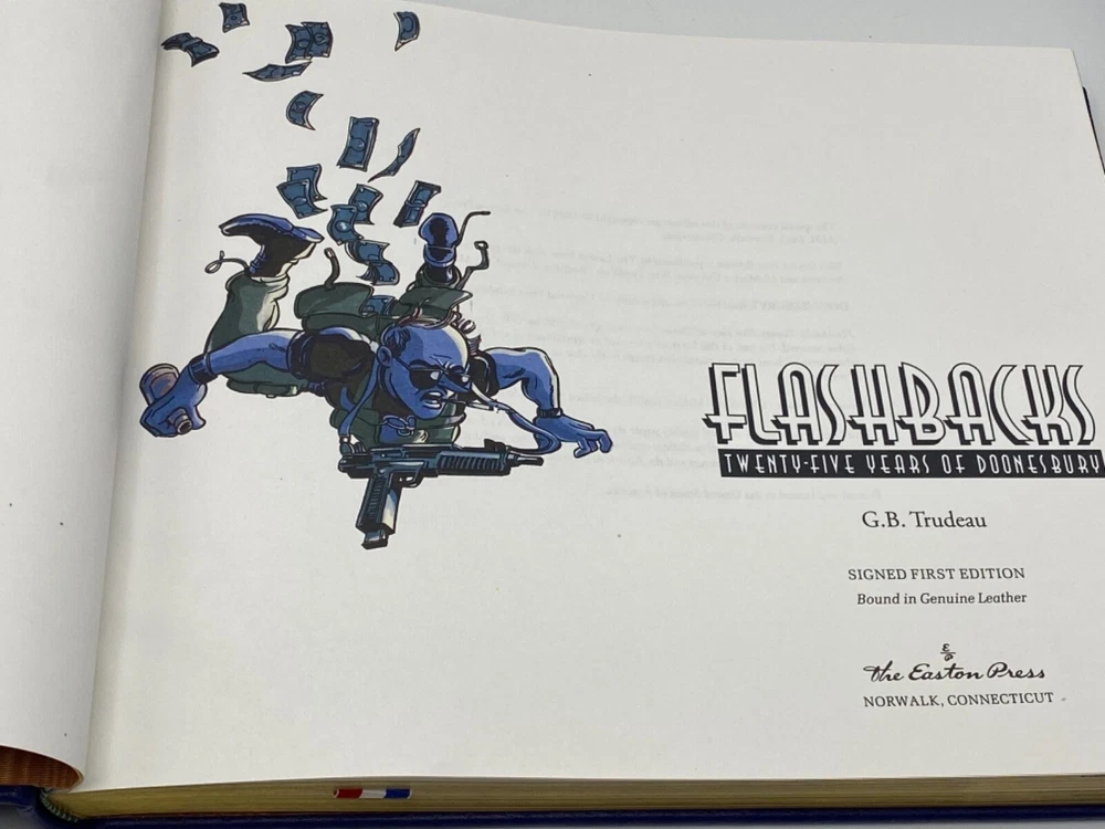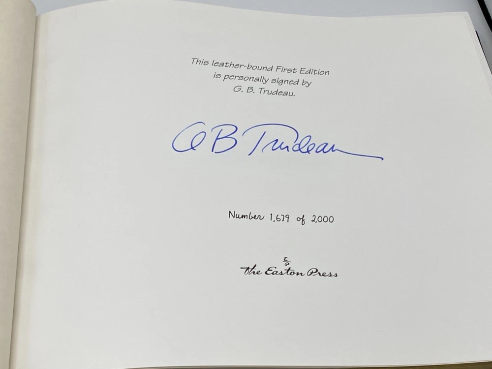 MAKES THE PERFECT GIFT FOR ANY DOONESBURY FAN ** PLEASE READ : Mahalo for taking the time to look at our listing. We truly appreciate it. We always do our BEST to give you the most accurate description of these beautiful books. If, however, you have any SPECIFIC questions about the SIZE of the book, NUMBER of pages, TYPE of leather, SMELL or FEEL of the book, PLEASE email us through EBay’s mail system BEFORE you bid, and we will be HAPPY to give you more information. We want you to be completely happy with your purchase and keep you as our customers for years to come!** DESCRIPTION: Easton Press full-leather binding LONG OUT OF PRINT SIGNED 🖊️ FIRST EDITION by G.B. TRUDEAU. THIS IS A SCARCE , VINTAGE HEIRLOOM EASTON WITH LAVISH GILT IMPRESSIONS TO THE BOARDS AND SPINE with BEAUTIFUL ILLUSTRATIONS. IT IS ONE OF THE MOST HIGHLY-PRIZED & MOST BEAUTIFUL EDITIONS OF THIS CLASSIC CARTOON SERIES YOU CAN FIND. ABOUT THE BOOK: Since emerging from it's cozy campus origins in 1970 and making its national debut in 29 newspapers, " Doonesbury " has evolved to encompass a vast, interrelated cast of characters, and now appears in more than 1,400 newspapers worldwide. This unique quarter - century anniversary anthology offers the essence of the strip - over 800 daily and Sunday strips that form the core of the "Doonesbury" saga, all fully annotated to document the strip's effect on the wider world. Acclaim and outrage, ire and impact are duly noted - "Doonesbury" has left an impressive and entertaining trail of fallout, and outlasted many of it's most vocal critics. In addition, the strip's creator logs on with an introduction, and in a Q&A series addresses some of the questions he has so adroitly evaded in the past. CONDITION: Book is in LIKE-NEW condition for its age with no discernible flaws (SEE PICS FOR FURTHER DETAILS). NO ATTACHED BOOKPLATES, WRITING FROM PREVIOUS OWNER, ETC. It is a BEAUTIFUL EDITION. SHIPPING: FREE TO US ADDRESSES ONLY. INTERNATIONAL $ based on location. WE SHIP PRIORITY MAIL & PACK VERY WELL. Please check out our other listings of Easton Press, Franklin Library, Limited Editions Club, First Edition Library, Heritage Press, International Collectors Library, and Folio Society editions. WE DO COMBINE SHIPPING IF YOU PURCHASE MORE THAN ONE COPY. Mahalo for looking at our listings! By bidding/purchasing this item, you are helping a very grateful family who sends you our WARMEST ALOHA & MAHALO!