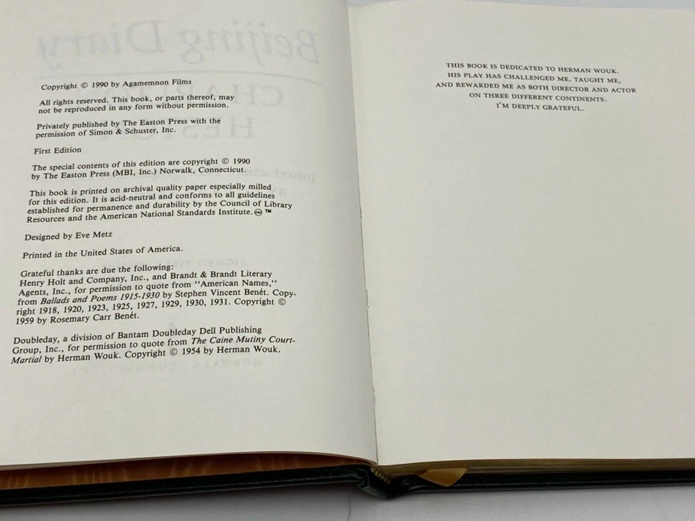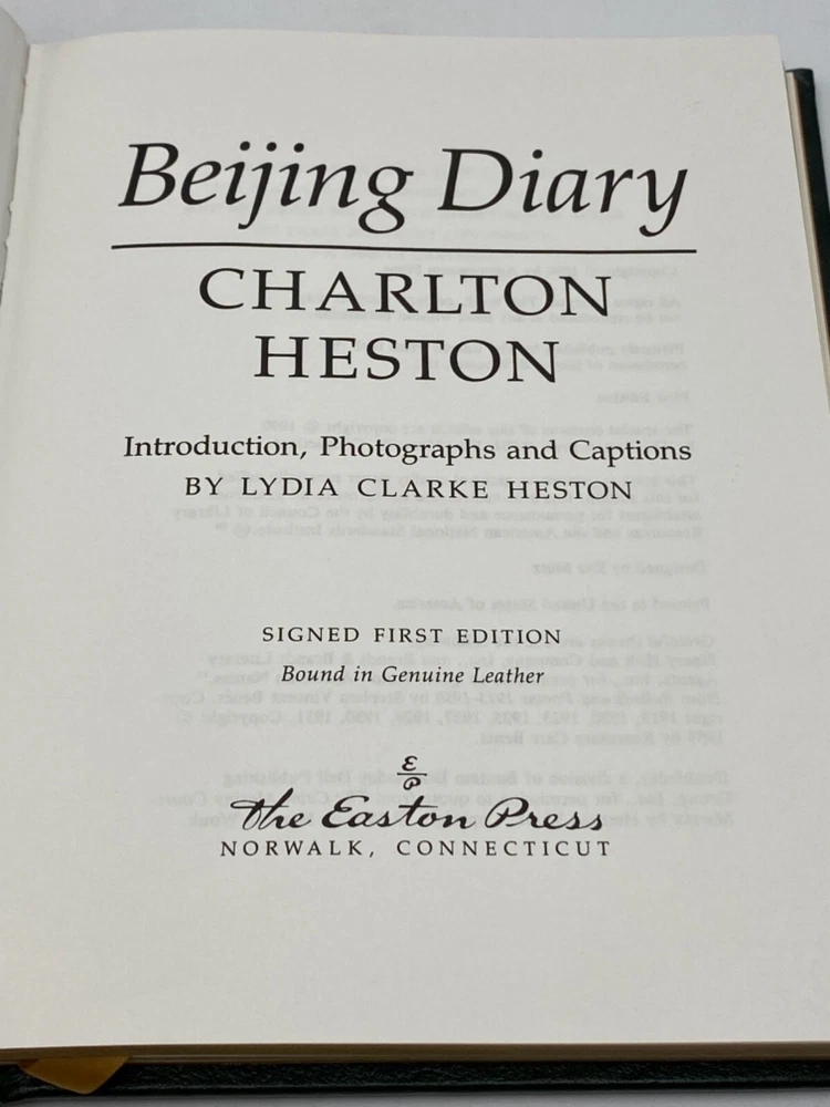 MAKES THE PERFECT GIFT FOR ANY FAN OF SIGNED FIRST EDITIONS / CHARLTON HESTON ** PLEASE READ : Mahalo for taking the time to look at our listing. We truly appreciate it. We always do our BEST to give you the most accurate description of these beautiful books. If, however, you have any SPECIFIC questions about the SIZE of the book, NUMBER of pages, TYPE of leather, SMELL or FEEL of the book, PLEASE email us through EBay’s mail system BEFORE you bid, and we will be HAPPY to give you more information. We want you to be completely happy with your purchase and keep you as our customers for years to come!** DESCRIPTION: Easton Press full-leather binding, from the SIGNED FIRST EDITION Series, personally SIGNED by CHARLTON HESTON. THIS IS A VINTAGE HEIRLOOM EASTON WITH LAVISH DEEP GILT IMPRESSIONS TO THE BOARDS AND SPINE with GREAT PHOTOGRAPHS. IT IS ONE OF THE MOST HIGHLY PRIZED & MOST BE3AUTIFUL EDITIONS OF THIS GREAT BOOK YOU CAN FIND. CHARLTON HESTON, UNFORTUNATELY, PASSED AWAY IN 2008, MAKING THESE SIGNED FIRST EDITIONS HIGHLY COLLECTIBLE AND ONLY TO INCREASE IN VALUE OVER TIME. ABOUT THE BOOK: In Beijing Diary , world famous actor/director tells the personal story of a remarkable theatrical and political event--his 1988 production of an all-Chinese version of "The Cain Mutiny Court-Martial" in Beijing Description In Beijing Diary, world famous actor/director tells the personal story of a remarkable theatrical and political event--his 1988 production of an all-Chinese version of "The Cain Mutiny Court-Martial" in Beijing CONDITION: Book is in LIKE NEW condition for its age with no discernible flaws (SEE PICS FOR FURTHER DETAILS). NO ATTACHED BOOKPLATES, WRITING FROM PREVIOUS OWNER, ETC. It is a BEAUTIFUL EDITION. FREE shipping TO US ADDRESSES ONLY. INTERNATIONAL $ based on location. WE SHIP PRIORITY MAIL & PACK VERY WELL. Please check out our other listings of Easton Press, Franklin Library, Limited Editions Club, Heritage Press, International Collectors Library, Heritage Press, and First Edition Library editions. WE DO COMBINE SHIPPING IF YOU PURCHASE MORE THAN ONE COPY. Mahalo for looking at our listings! By bidding/purchasing this item, you are helping a very grateful family who sends you our WARMEST ALOHA & MAHALO!