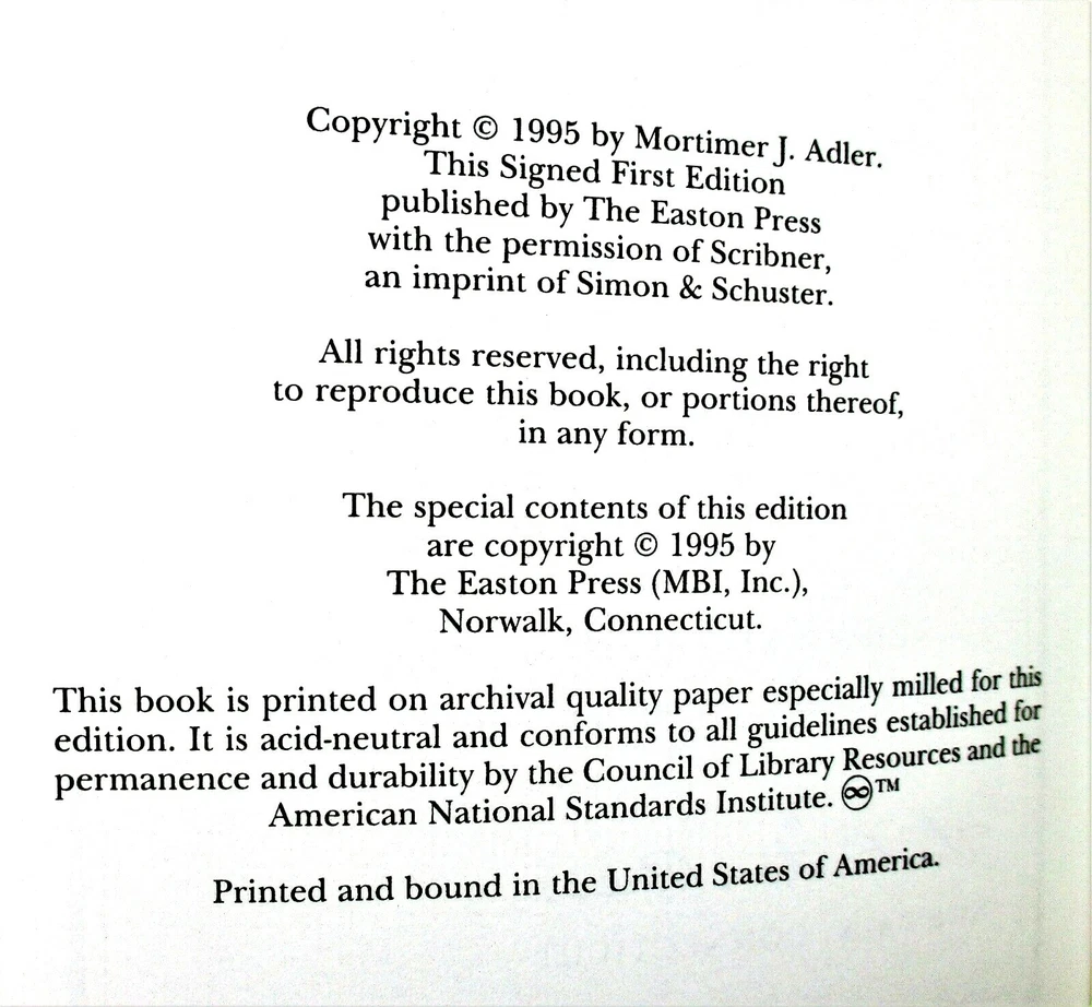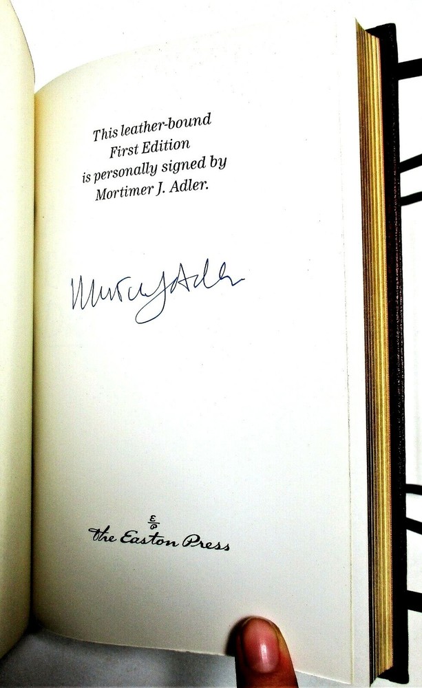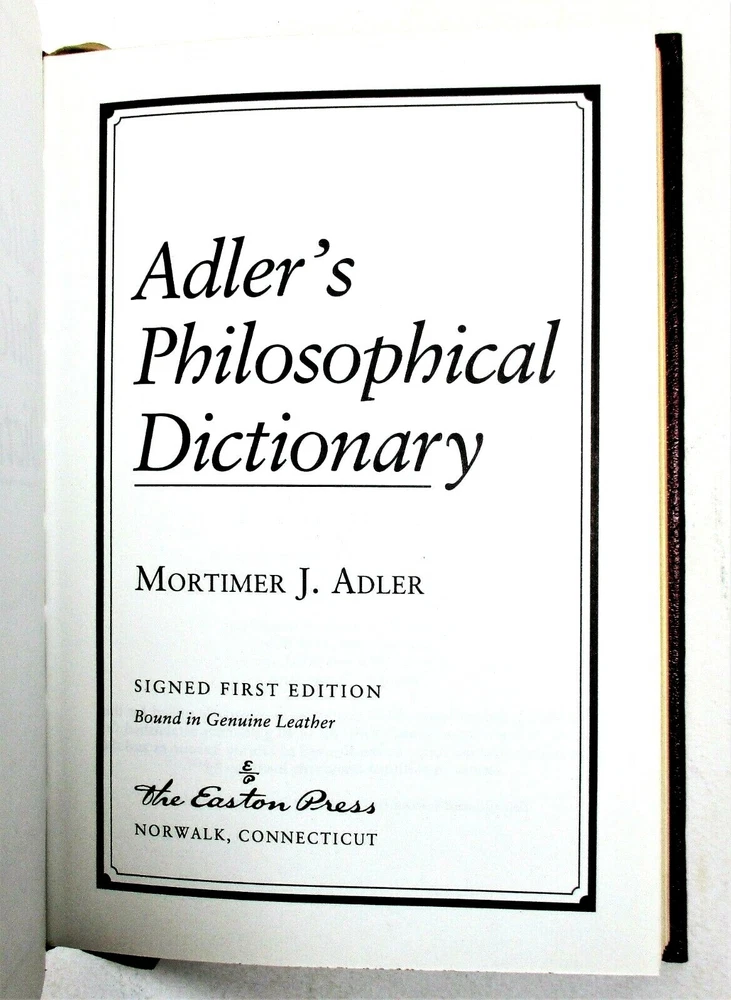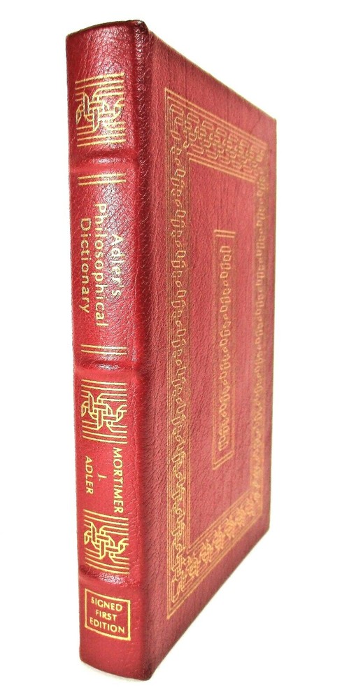 For sale is an Excellent condition leather hardcover copy of Adler's Philosophical Dictionary by Mortimer J. Adler. SIGNED by author on limitation page! Stated 1st Thus Edition, published in 1995 by Easton Press in Norwalk, CT. Binding is tight and pages are unmarked, with the sole exception of an unsigned Easton Press bookplate affixed to the first free endpaper. Boards are clean and square with minimal shelf wear. Features beautiful deep red leather, gold foil decoration to covers and spine, gold foil lettering and raised bands on spine, gilded textblock fore edges, and a golden satin placeholder ribbon. Please see photos for condition detail. L-783