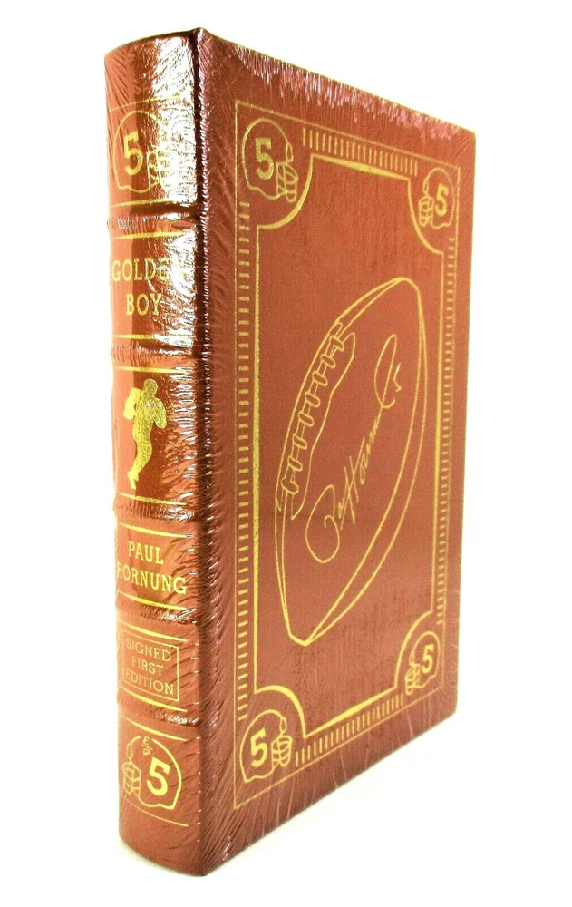 For sale is a NEW, still sealed leather hardcover copy of Golden Boy by Paul Hornung. SIGNED on limitation page by Paul Hornung! 1st / Limited / Collector's Edition, one of 1500 copies made. Published in 2004 by The Easton Press in Norwalk, CT. Presumably comes with signed COA. Binding is tight and pages unmarked. Boards are clean and square with no shelf wear. Please see photos for condition detail. L-454