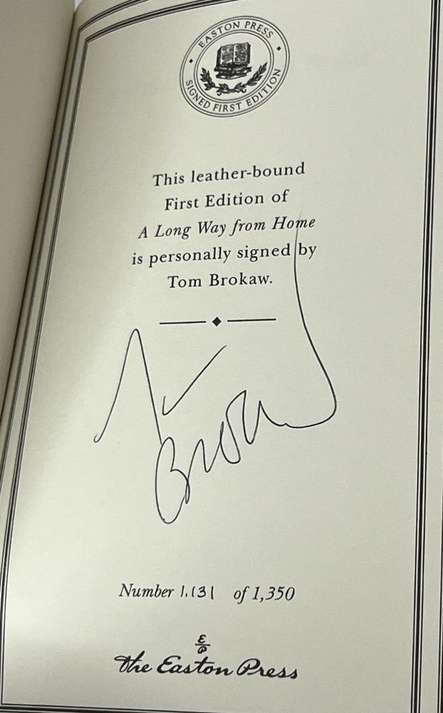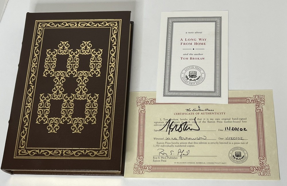 This is a signed, 1st edition copy of "A Long Way From Home" by Tom Brokaw. The book is bound in leather and was published by Easton Press in Norwalk, Connecticut in 2002. The topic of the book is "Reflections on America" and it falls under the category of Antiquarian & Collectible books. The book also comes with a Certificate of Authenticity from 2002. The author is a well-known journalist and author, and the book offers insights into his reflections on America. This book is a must-have for collectors of signed first editions and fans of Tom Brokaw.
