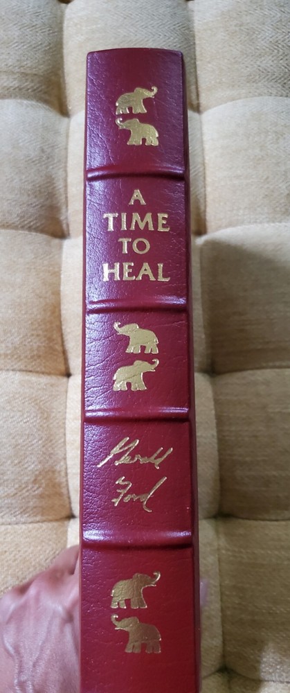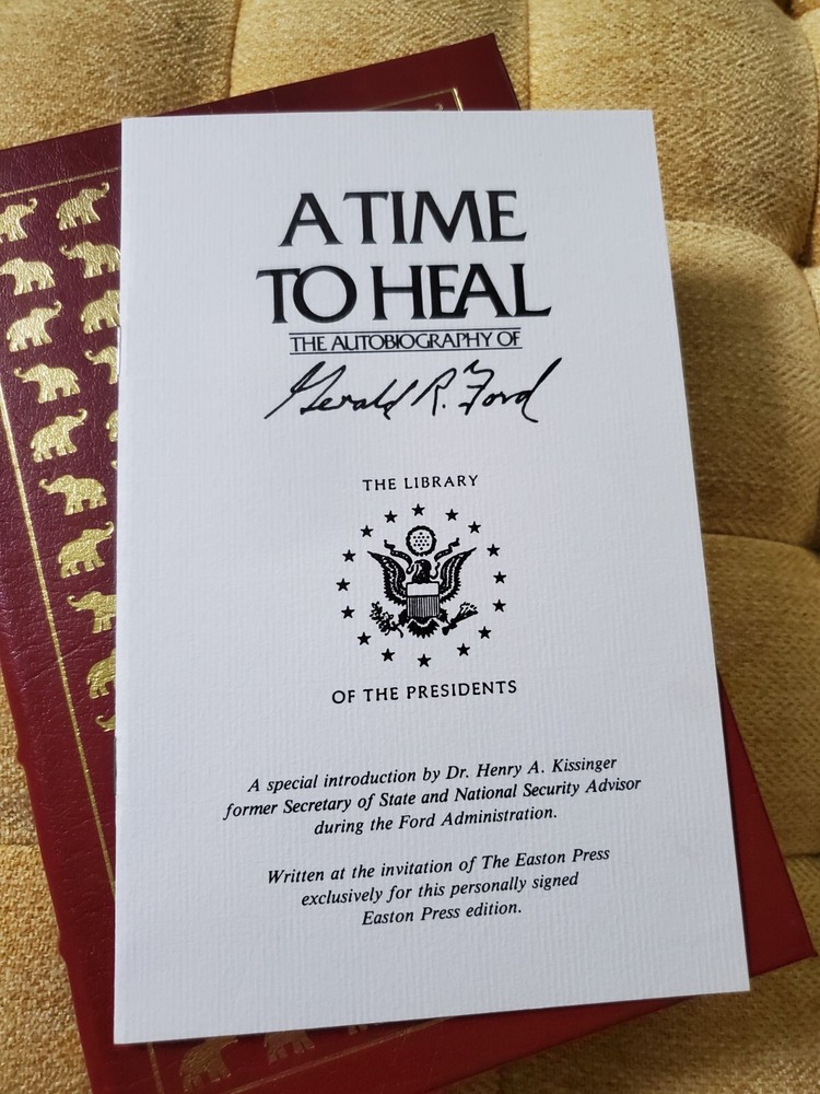 A TIME TO HEAL: THE AUTOBIOGRAPHY OF GERALD R. FORD - EASTON PRESS SIGNED BY U.S. President GERALD FORD. Easton Press, 1987. Norwalk, CT USA. Leather bound. Very Good to Near Fine. Stunning Red Leather cover with raised bands, a gilt stamped title on the spine, and decorative gilt stamped patterns on the spine and front covers. All edges gilt. Patterned endpapers and silk ribbon place marker. Part of The Library of the Presidents collection. Limited Edition Collector's Item Condition: Brand New. Sealed in original shrink wrap. Never opened. Book has been stored in climate controlled room for 30 years in original shipping box. Pristine boards with very clean and crisp pages. No missing or damaged pages. Gilting is clean and untouched. 23 other books in Easton Press Library of the Presidents are also for sale! Please check my other listings or make an offer on all books in set. A Time To Heal The Autobiography of Gerald Ford ( Signed Limited Edition ); John Quincy Adams by Samuel Flagg Bemis Vol. 1 John Quincy Adams by Samuel Flagg Bemis Vol. 2 Life and Times of William Taft by Henry Pringle Vol. 1 Life and Times of William Taft by Henry Pringle Vol. 2 Millard Fillmore by Robert J Rayback President James Buchanan by Philip Shriver Klein John Adams by Page Smith Vol. 1 John Adams by Page Smith Vol. 2 In the Days of McKinley by Margaret Leech Roosevelt The Lion & The Fox by James MacGregor Burns Roosevelt The Soldier of Freedom by James MacGregor Burns James Polk Jacksonian and Continentalist by Charles Sellers Vol. 1 James Polk Jacksonian and Continentalist by Charles Sellers Vol. 2 Franklin Pierce by Young Hickory of Granite Hills by Roy Franklin Nichols Grant A Biography by William S McFeely Lyndon Johnson and The American Dream by Doris Kearns Eisenhower by Stephen E. Ambrose Vol. 1 Eisenhower by Stephen E. Ambrose Vol. 2. Lincoln by David Herbert Donald Herbert Hoover - A Public Life by David Berner Theodore Roosevelt An Autobiography The Life of Andrew Jackson by Robert V. Remini Andrew Johnson A Biography by Hans L. TreFousse Each volume in this series is from the Library of the Presidents and is copyrighted 1983 through 1994. One of the volumes have been personally signed by a president (Gerald Ford) Each edition features full genuine leather with covered boards, raised bands on the spines, gilt text and decorations stamped in the compartments, and with gilt tool work on both the front and rear boards. The end papers are silk with matching silk placement ribbons sewn-in at the head of the spine. All three edges of the text blocks are gilt. Sizes vary from small octavo to quarto.