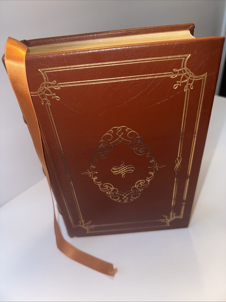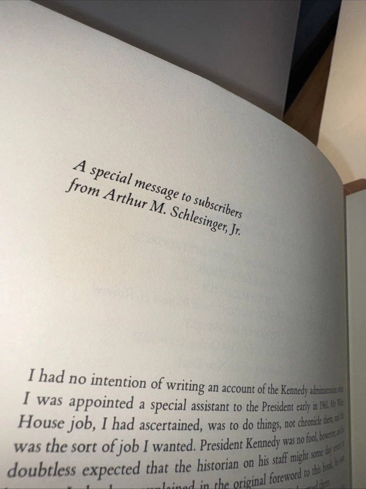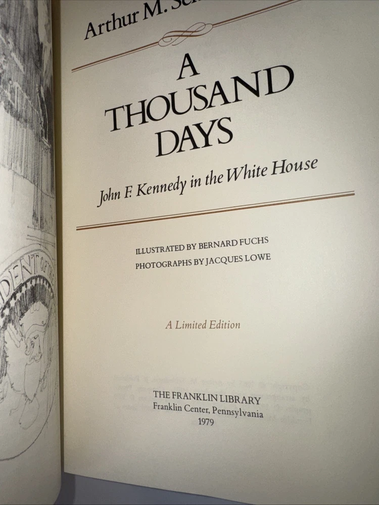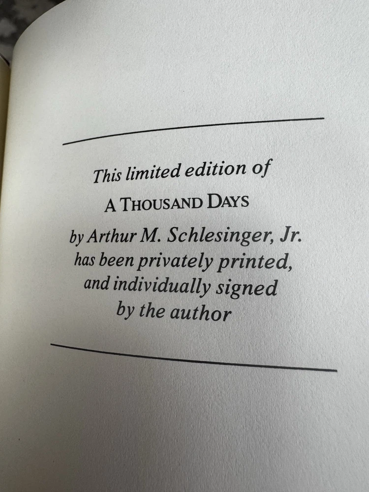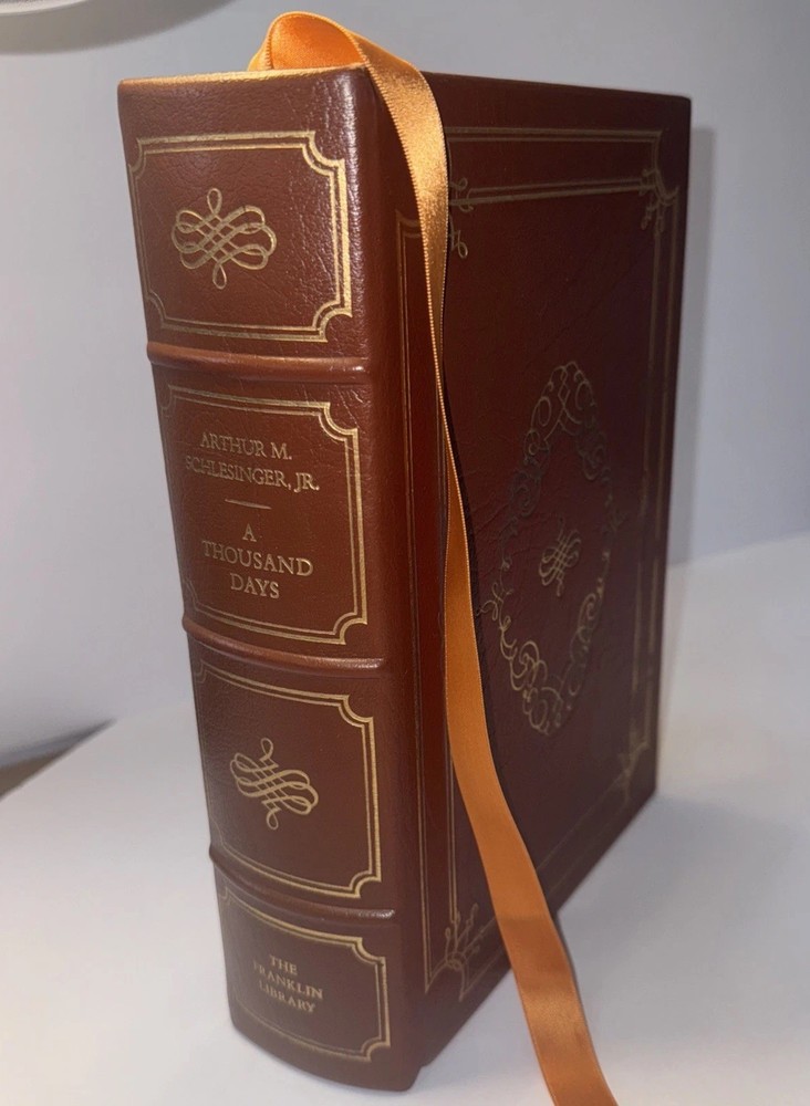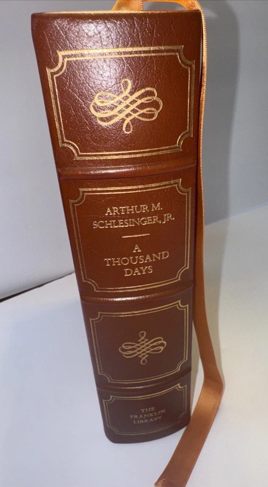 1st Edition Leather Binding 22k gold gilding on pages Burnt Orange Moire Silk end papers Satin Sewn in Bookmark Acid free paper Symth-Sewn binding Black and white photos The raised bands on binding ***Hand Signed copy*** “A Thousand Days “ Arthur M. Schlesinger, Jr. In memory of John Fitzgerald Kennedy Contains Original 1965 Houghton Mifflin Company printing ***Plus extra insight in 1979 from the Author. Illustrated by Bernard Fuchs Photographs by Jacques Lowe A Limited Edition from the Franklin Mint Corporation Spine in amazing condition never fully opened. Tight. Amazing condition Some discolor on front and rear. Did not try to clean. See pics for gilding. Very good condition.