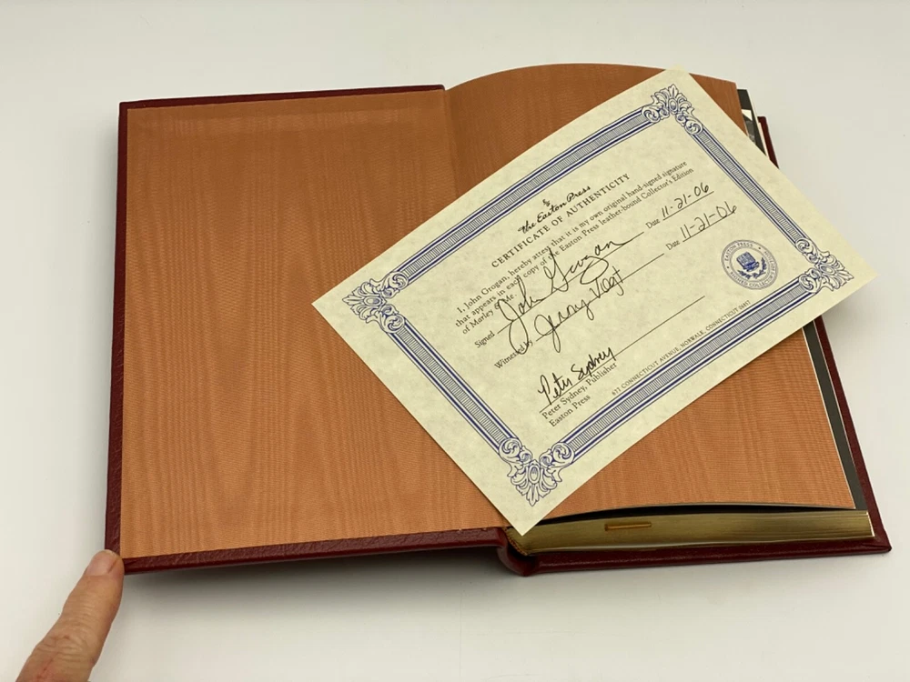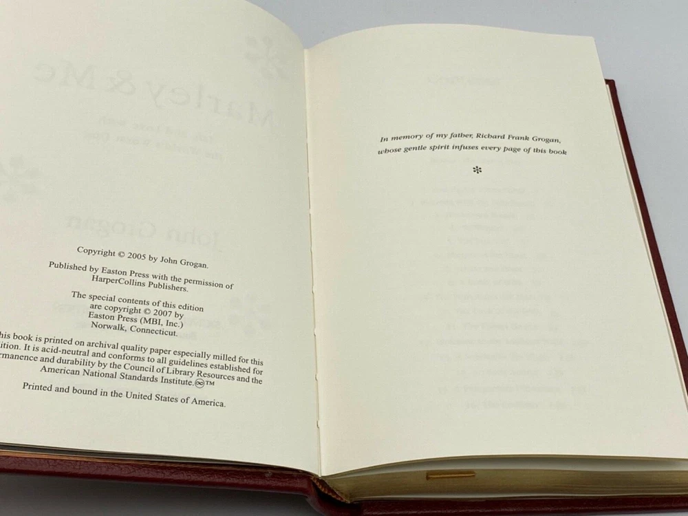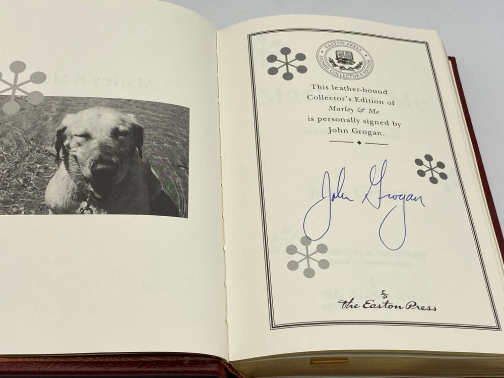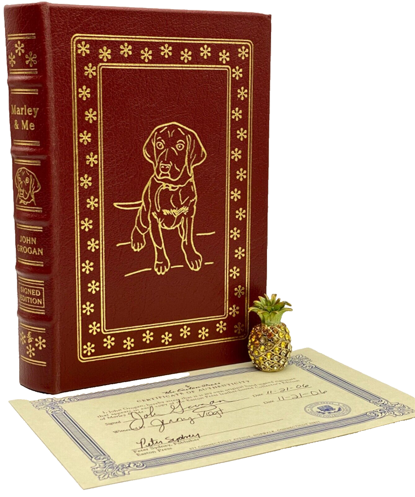 MAKES THE PERFECT GIFT FOR ANY DOG LOVER / LABRADOR RETRIEVER OWNER ** PLEASE READ : Mahalo for taking the time to look at our listing. We truly appreciate it. We always do our BEST to give you the most accurate description of these beautiful books. If, however, you have any SPECIFIC questions about the SIZE of the book, NUMBER of pages, TYPE of leather, SMELL or FEEL of the book, PLEASE email us through EBay’s mail system BEFORE you bid, and we will be HAPPY to give you more information. We want you to be completely happy with your purchase and keep you as our customers for years to come!** DESCRIPTION: Easton Press full-leather binding, LONG OUT OF PRINT SIGNED edition of MARYLEY & ME by JOHN GROGAN. THIS IS A SCARCE VINTAGE HEIRLOOM EASTON WITH GORGEOUS DEEP GILT IMPRESSIONS TO THE BOARDS AND SPINE with BEAUTIFUL PHOTOGRAPHS . IT IS ONE OF THE MOST HIGHLY-PRIZED & MOST BEAUTIFUL EDITIONS OF THIS CLASSIC YOU CAN FIND. CERTIFICATE OF AUTHENTICITY IS INCLUDED. 🍍 NOT INCLUDED… 😃 ABOUT THE BOOK: John and Jenny were just beginning their life together. They were young and in love, with a perfect little house and not a care in the world. Then they brought home Marley , a wiggly yellow furball of a puppy. Life would never be the same. Marley quickly grew into a barreling, ninety-seven-pound streamroller of a Labrador retriever, a dog like no other. He crashed through screen doors, gouged through drywall, flung drool on guests, stole women's undergarments, and ate nearly everything he could get his mouth around, including couches and fine jewelry. Obedience school did no good—Marley was expelled. Neither did the tranquilizers the veterinarian prescribed for him with the admonishment, "Don't hesitate to use these." And yet Marley's heart was pure. Just as he joyfully refused any limits on his behavior, his love and loyalty were boundless, too. Marley shared the couple's joy at their first pregnancy, and their heartbreak over the miscarriage. He was there when babies finally arrived and when the screams of a seventeen-year-old stabbing victim pierced the night. Marley shut down a public beach and managed to land a role in a feature-length movie, always winning hearts as he made a mess of things. Through it all, he remained steadfast, a model of devotion, even when his family was at its wit's end. Unconditional love, they would learn, comes in many forms. CONDITION: Book is in LIKE condition for its age with no discernible flaws (SEE PICS FOR BETTER DETAILS). NO ATTACHED BOOKPLATES, WRITING FROM PREVIOUS OWNER, ETC. It is a GORGEOUS EDITION. SHIPPING: FREE TO US ADDRESSES ONLY. INTERNATIONAL $ based on location. WE SHIP PRIORITY MAIL & PACK VERY WELL. Please check out our other listings of Easton Press, Franklin Library, Limited Editions Club, First Edition Library, Heritage Press, International Collectors Library, and Folio Society editions. WE DO COMBINE SHIPPING IF YOU PURCHASE MORE THAN ONE COPY. Mahalo for looking at our listings! By bidding/purchasing this item, you are helping a very grateful family who sends you our WARMEST ALOHA & MAHALO!