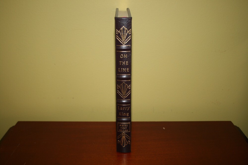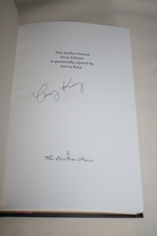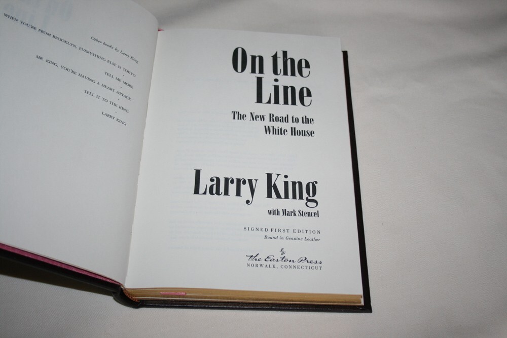 From the Easton Press Signed First Edition Collection... On The Line The New Road to the White House PERSONALLY SIGNED by Larry King Easton Press Signed First Edition Copyright 1993 by The Easton Press Bound in Premium Full Leather This Signed First Edition contains all of the classic Easton Press trimmings: Premium Leather Silk Moire Endleaves Distinctive Cover Design Hubbed Spine, Acccented in Real 22KT Gold Satin Ribbon Page Marker Gilded Page Edges Long-lasting, High Quality Acid-neutral Paper Smyth-sewn Pages for Strength and Durability A very scarce title in any condition, this copy is in Fine condition. The front and back covers are both in near perfect condition and the gilded page edges show hardly any wear (see pictures). There is absolutely no bookplate nor other signs of previous ownership in this book. This book is personally signed by the author as issued by the publisher and would be a beautiful addition to your Easton Press collection. Hopefully you can add this book to your collection and enjoy it in the years to come... Please Email Me With Any Questions You Might Have! Shipping Info: Buyer to Pay Shipping and Handling International Bidders Pay Extra Shipping Seller Not Responsible For Uninsured Items Lost or Damaged in Mai l Good luck and happy bidding!