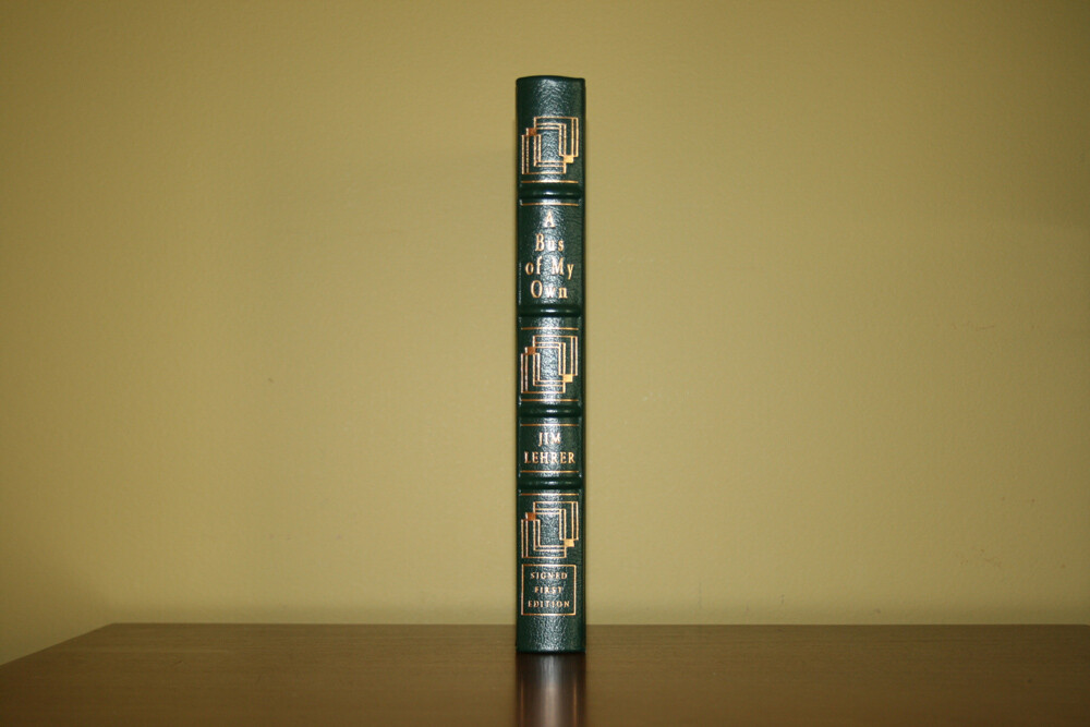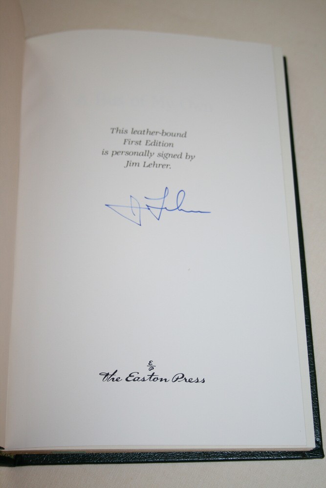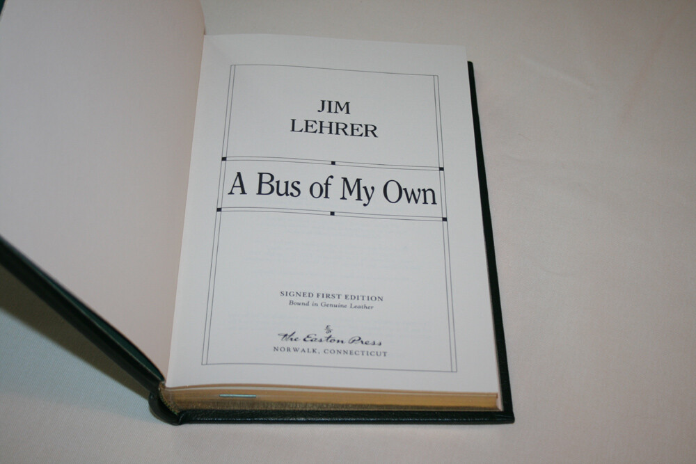 From the Easton Press Signed First Edition Collection... A Bus of My Own PERSONALLY SIGNED by Jim Lehrer Easton Press Signed First Edition Copyright 1992 by The Easton Press Bound in Premium Full Leather This Signed First Edition contains all of the classic Easton Press trimmings: Premium Leather Silk Moire Endleaves Distinctive Cover Design Hubbed Spine, Accented in Real 22KT Gold Satin Ribbon Page Marker Gilded Page Edges Long-lasting, High Quality Acid-neutral Paper Smyth-sewn Pages for Strength and Durability A very scarce title in any condition, this copy is in Fine and Unread condition. The front and back covers are both in Perfect condition and the gilded page edges show no wear at all! (see pictures). There are no markings, bookplates, or other signs of ownership in this book . This book is personally signed by the author as issued by the publisher and would be a beautiful addition to your Easton Press collection. Overall, this copy is a grade collector's book. This book is very elusive in this superior condition, as only a limited number of them were ever published, so now is the time to act. Hopefully you can add this book to your collection and enjoy it in the years to come... Please Email Me With Any Questions You Might Have! Shipping Info: Buyer to Pay Shipping and Handling International Bidders Pay Extra Shipping Seller Not Responsible For Uninsured Items Lost or Damaged in Mail Forms of Payment Accepted: Paypal Good luck and happy bidding! Powered by eBay Turbo Lister The free listing tool. List your items fast and easy and manage your active items.