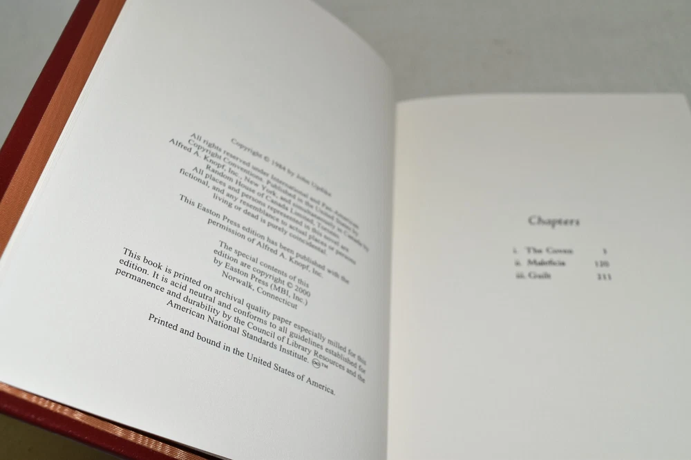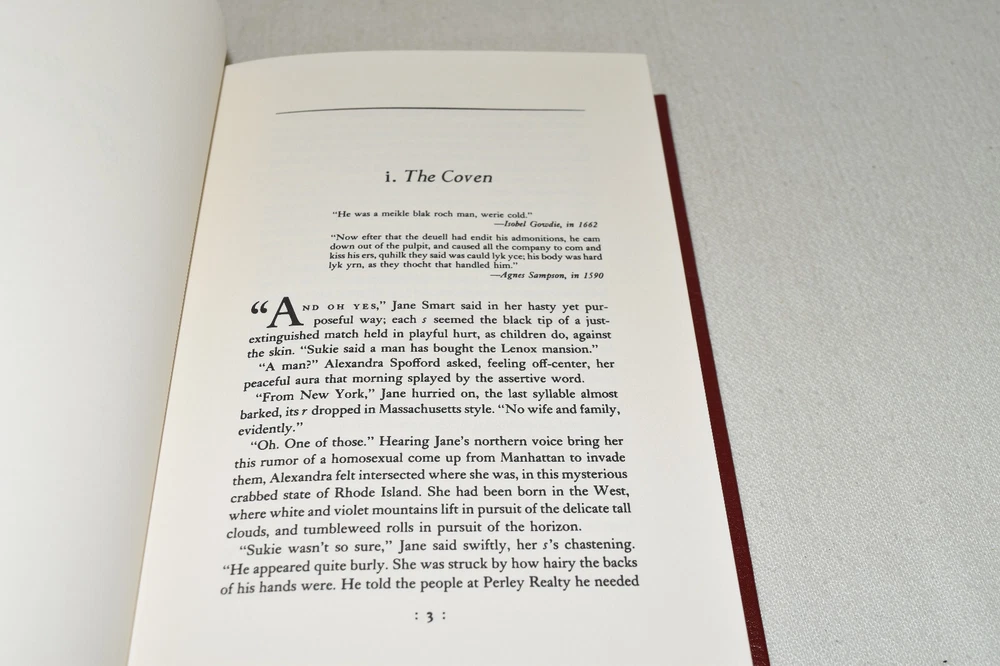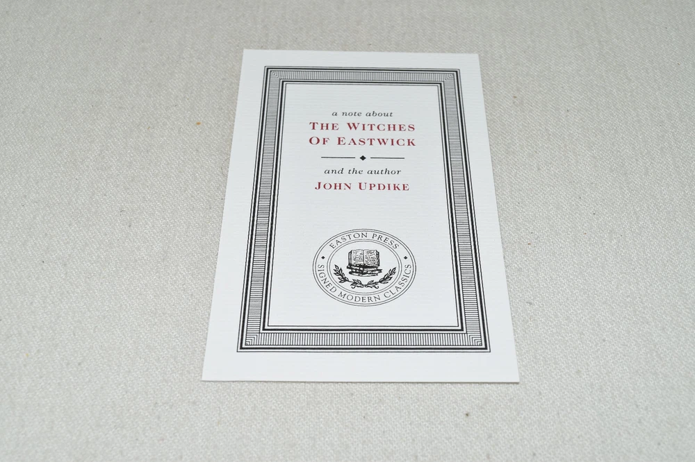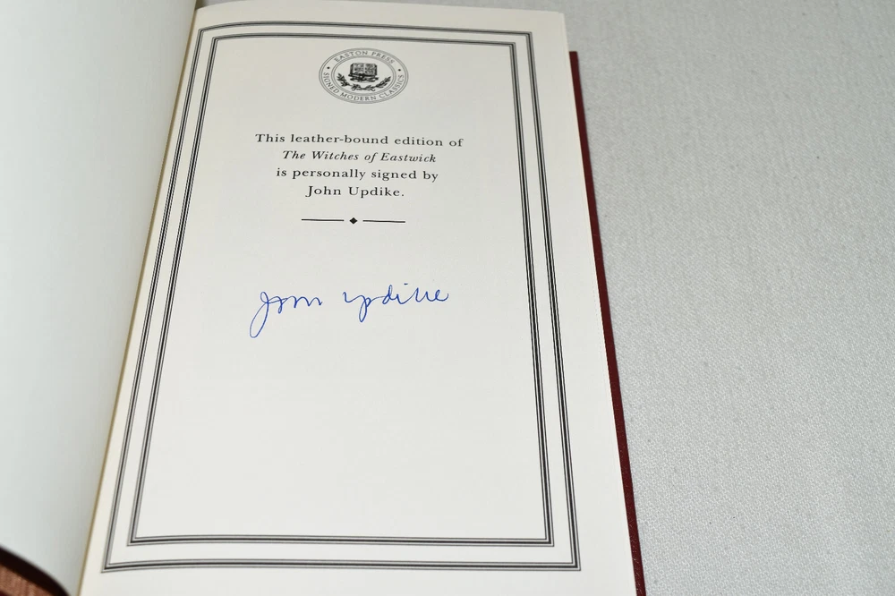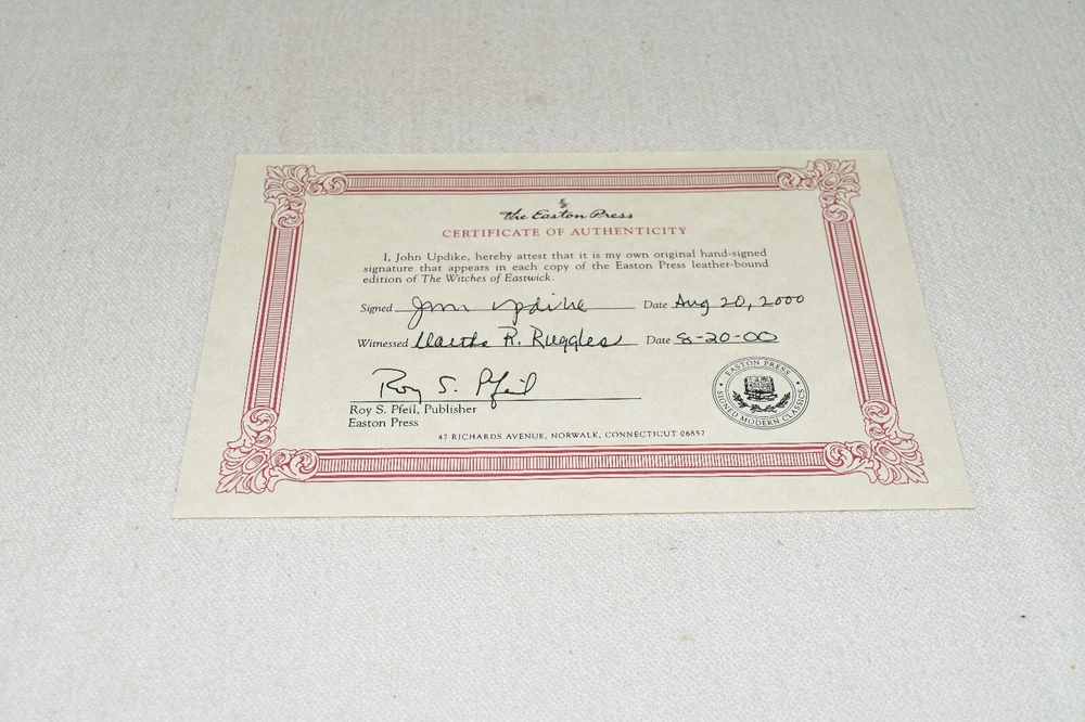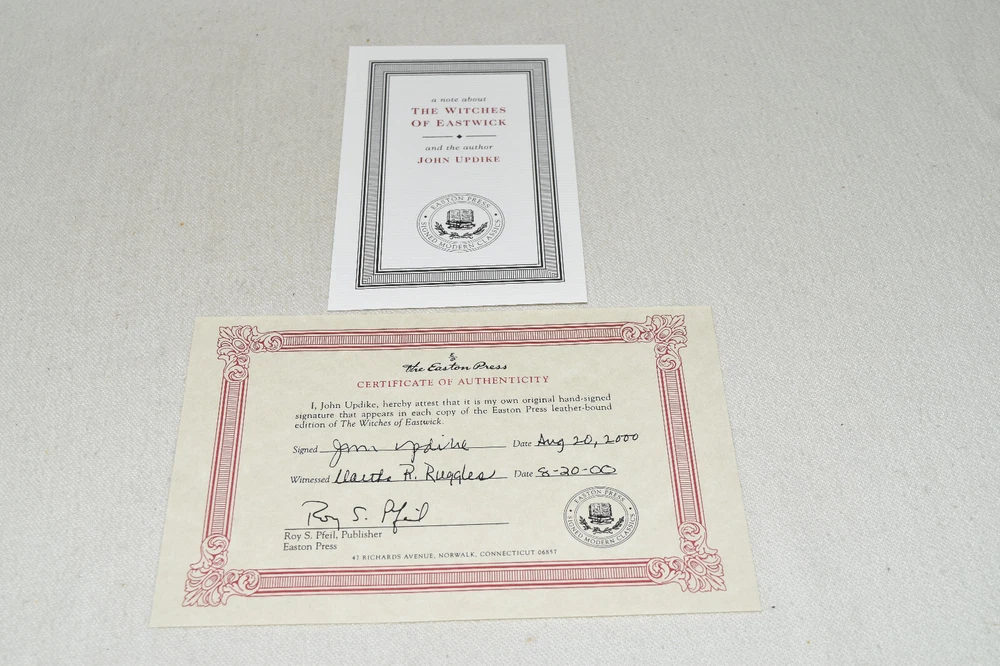 From the Easton Press Signed First Editions Collection... The Witches of Eastwick PERSONALLY SIGNED by Author John Updike Easton Press Signed First Edition Copyright 2000 by The Easton Press Bound in Premium Full Leather This Signed First Edition contains all of the classic Easton Press trimmings: Premium Leather Silk Moire Endleaves Distinctive Cover Design Hubbed Spine, Accented in Real 22KT Gold Satin Ribbon Page Marker Gilded Page Edges Long-lasting, High Quality Acid-neutral Paper Smyth-sewn Pages for Strength and Durability A very scarce title in any condition, this copy is in Fine condition. The front and back covers are both in near perfect condition and the gilded page edges show hardly any wear! There is a blank bookplate on the third page. This book is personally signed by John Updike. It comes with a Certificate of Authenticity and Collector's Notes and would be a beautiful addition to your Easton Press collection. Overall, this copy is a grade collector's book. This book is very elusive in this superior condition, as only a limited number of them were ever published, so now is the time to act. Hopefully you can add this book to your collection and enjoy it in the years to come... Please Email Me With Any Questions You Might Have! Shipping Info: Buyer to Pay Shipping and Handling International Bidders Pay Extra Shipping Seller Not Responsible For Uninsured Items Lost or Damaged in Mail Forms of Payment Accepted: Paypal Good luck and happy bidding! Powered by eBay Turbo Lister The free listing tool. List your items fast and easy and manage your active items.