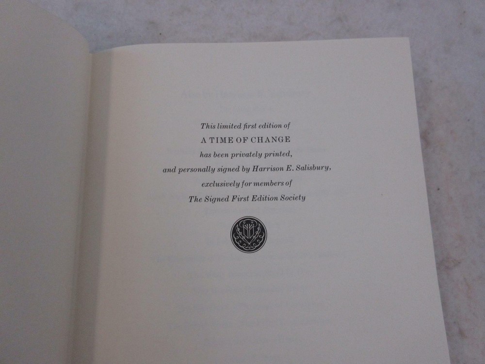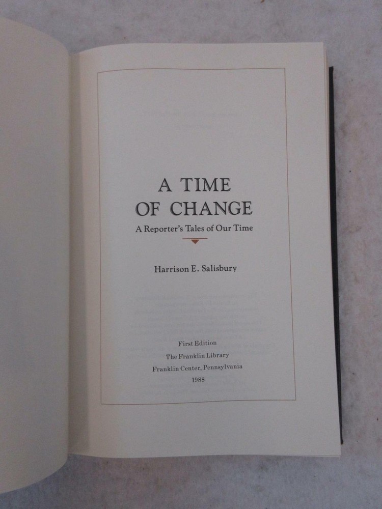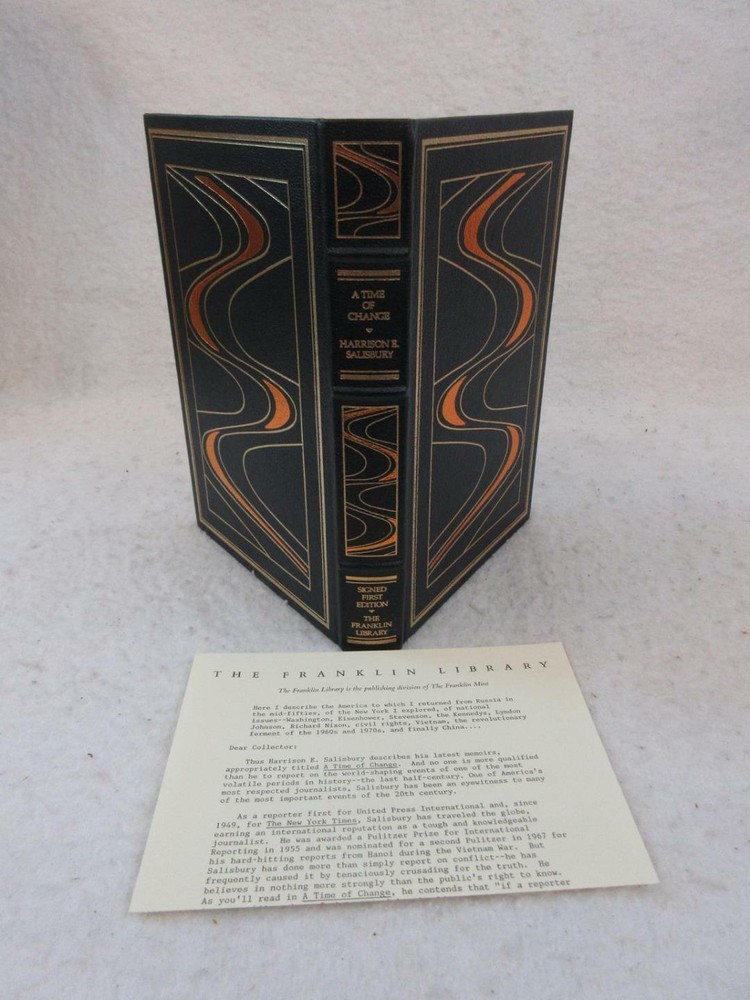 SIGNED Harrison E. Salisbury A TIME OF CHANGE A Reporter's Tales of Our Time 1988 Franklin Library Leather First Edition With Note A Leather Hardcover in Near Fine Condition, appears unread. Please examine photos for details. Condition: We strive to describe and photograph the condition of every item as accurately as possible. Photos are of the actual item that is being sold. Please examine the photos carefully for any condition details and possible flaws. Best Offers: Items are available for offers only after being listed for 30 days. We consider all offers in relation to current market values. We try to respond almost immediately to most offers. Most of our counteroffers are firm but we are open to bargaining. Shipping: We combine shipping. When ordering multiple items from us please request a total before paying. We charge postage based on weight plus $1 for each eBay listing. All of our orders are packed carefully to prevent damage during shipment. We ship most of our items within 24 hours. Contact Us: We are available 7 days a week and are happy to answer any questions you may have. Create your brand with Auctiva's Customizable Templates. Attention Sellers - Get Templates Image Hosting, Scheduling at Auctiva.com.