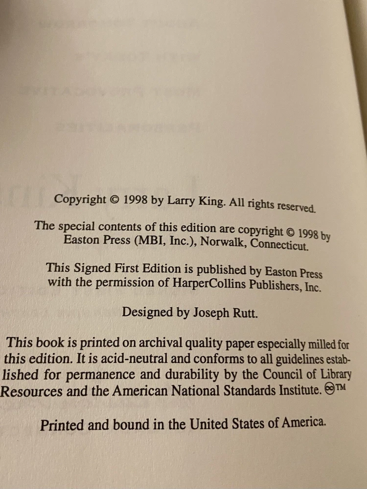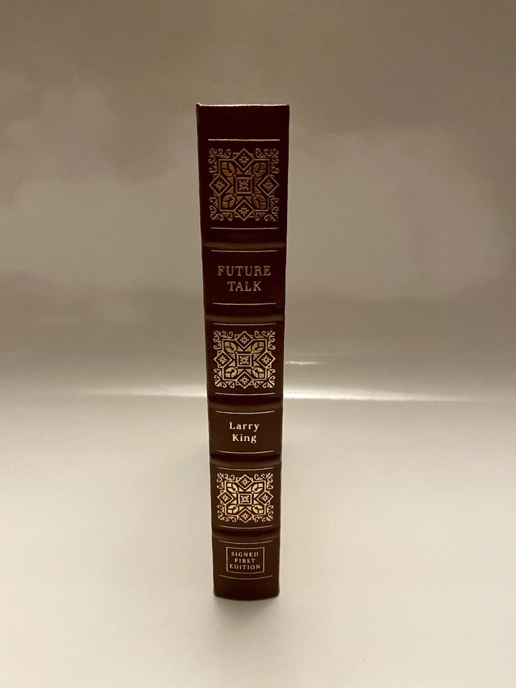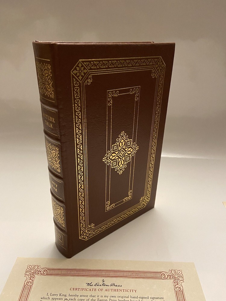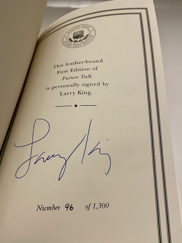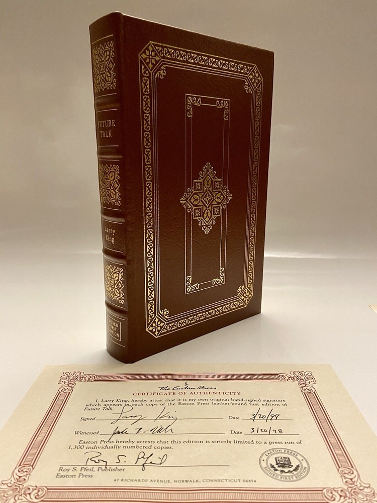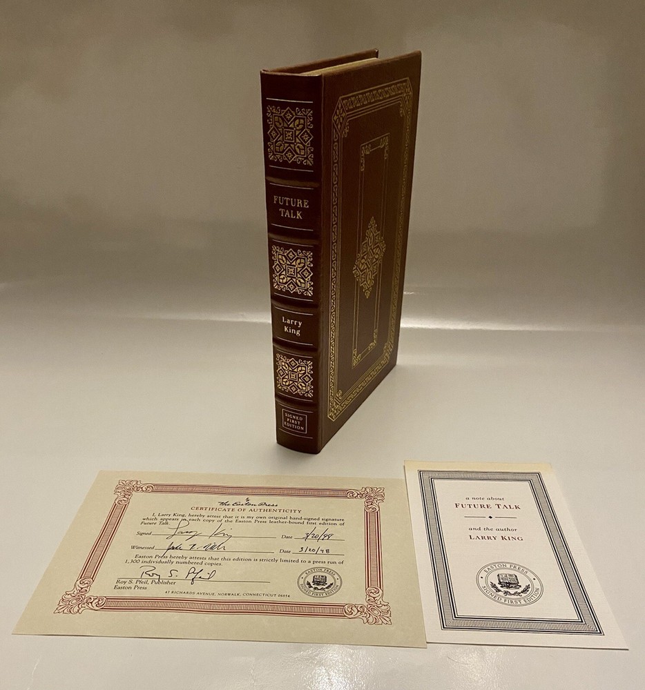 SIGNED LARRY KING Easton Press FUTURE TALK : Conversations About Tomorrow With Today's Most Provocative Personalities Larry King with Pat Piper Signed First Edition Bound in Genuine Leather The Eastern Press, 1998 Limited First Edition Numbered 96/1300 ~ LIKE NEW + COA. An unread book. Clean, tight binding. Small imperfection on gold gilt edging. The marketing card insert has a light tint. An excellent copy. 363 pages. Dimension are about 9.25" x 6.50" x 1.5".