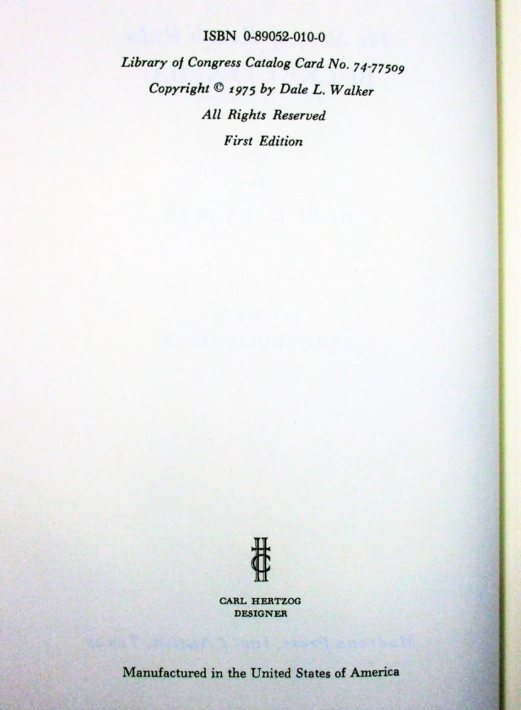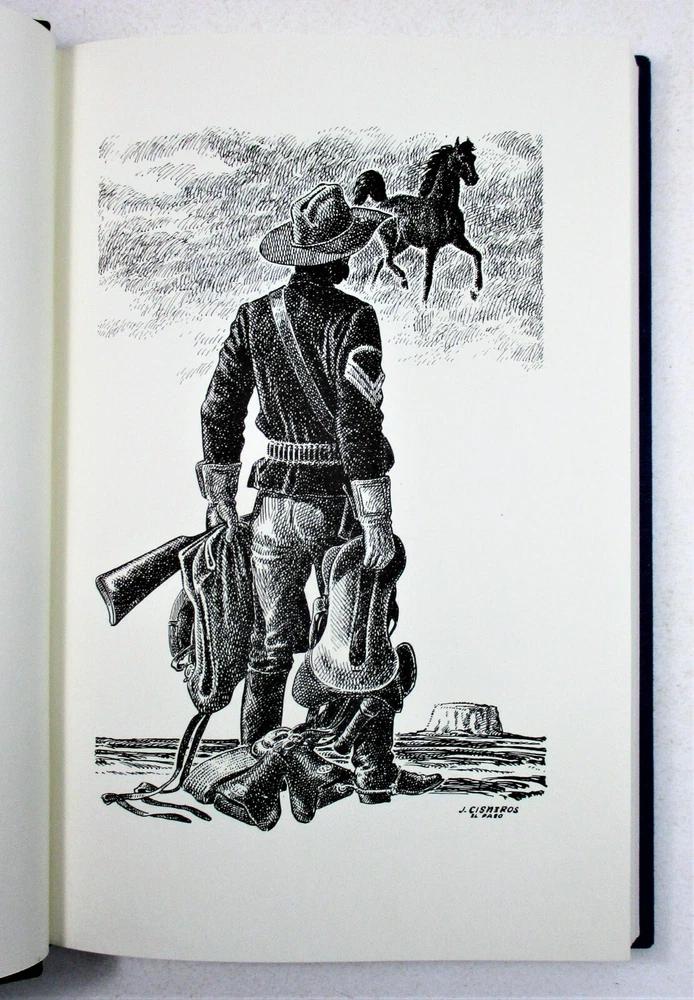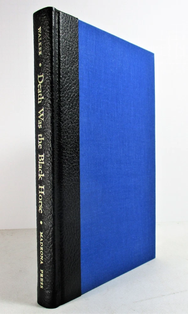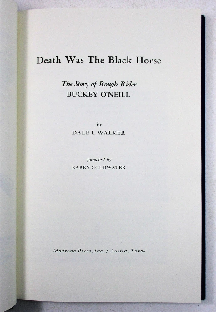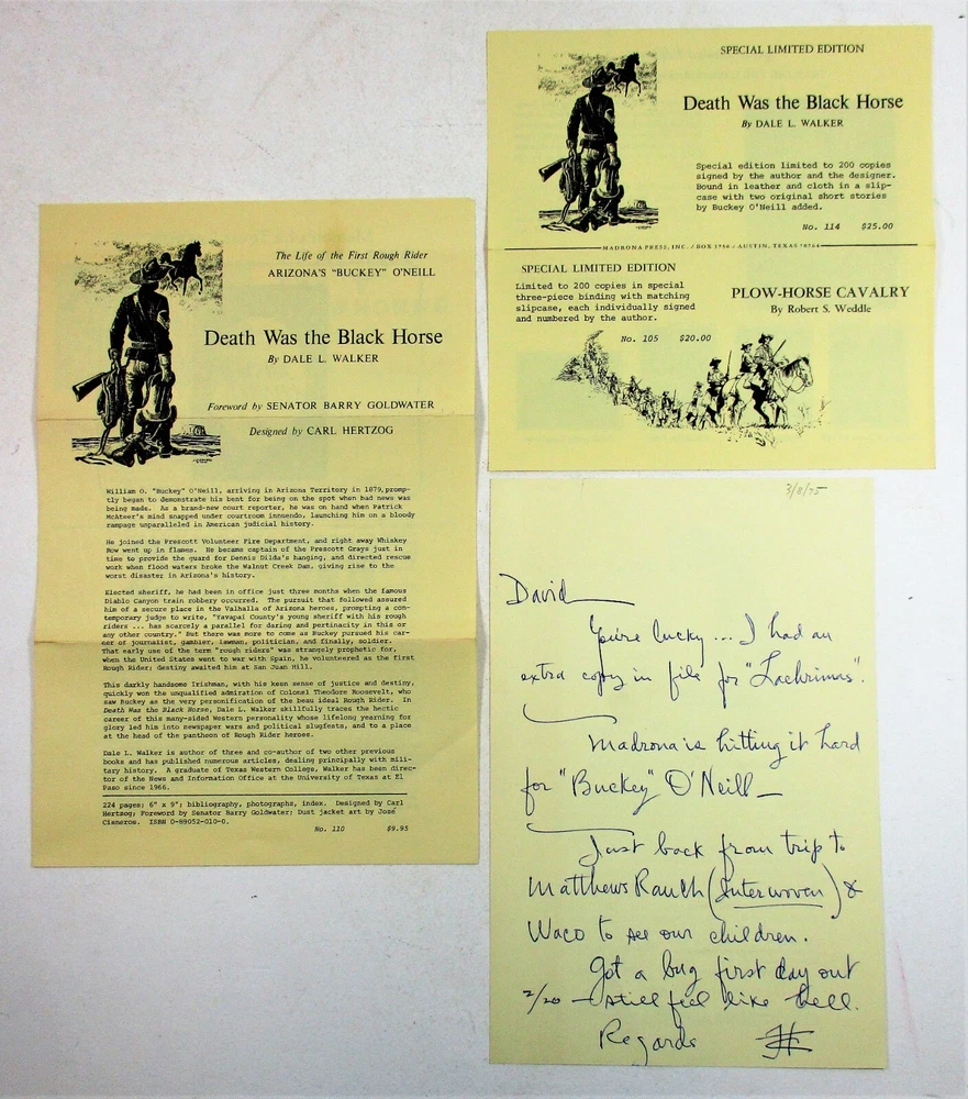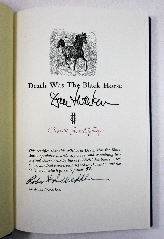For sale is a Like NEW condition slipcased quarter-stripe leather-bound hardcover copy of Death Was the Black Horse: The Story of Rough Rider Buckey O'Neill by Dale L. Walker. SIGNED by author Walker, designer Carl Hertzog, and publisher Robert Weddle on limitation page! Also comes with signed letter from Carl Hertzog addressed to previous owner, and two pieces of ephemera from publisher. Stated 1st Edition, Limited Edition #50 of 200 copies made. Features a frontispiece by Jose Cisneros. Published in 1975 by Madrona Press, Inc. in Austin, TX. Binding is sound and pages are unmarked. Boards are clean and square. Slipcase is sturdy and in Like New condition with minimal shelf wear. Please see photos for condition detail. L-869
