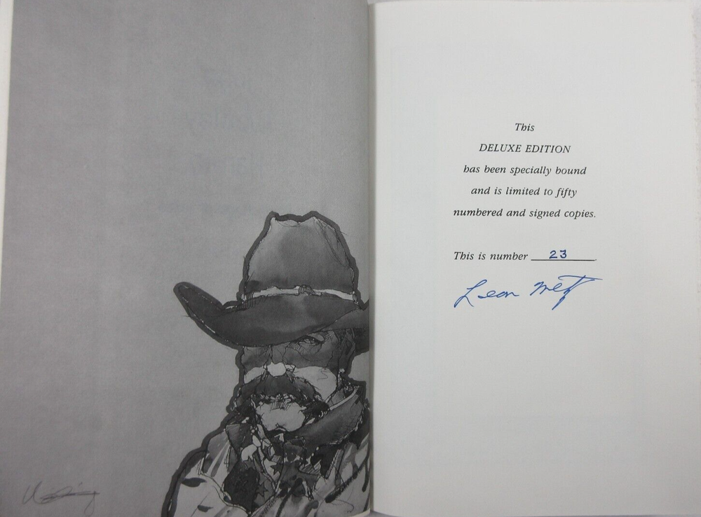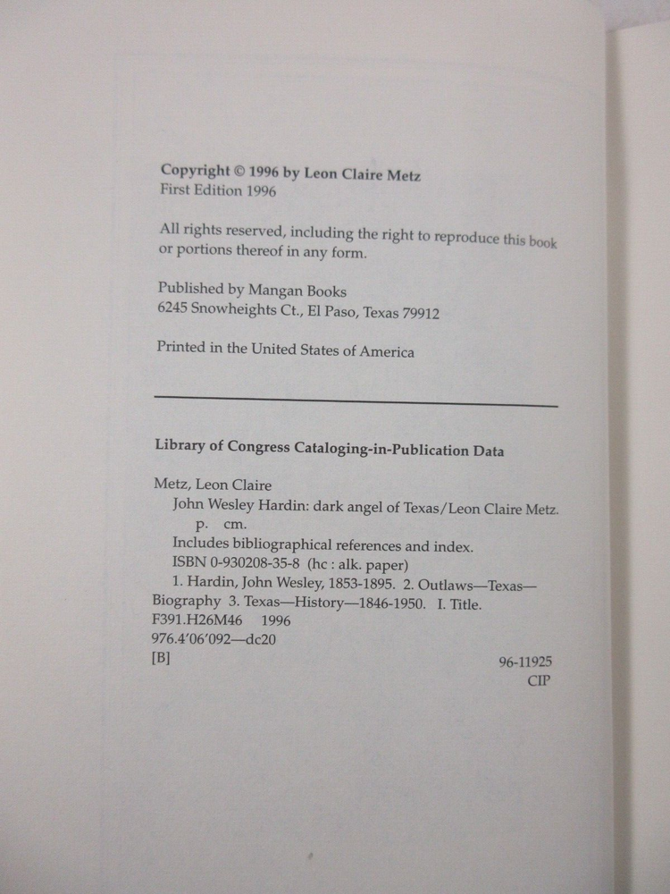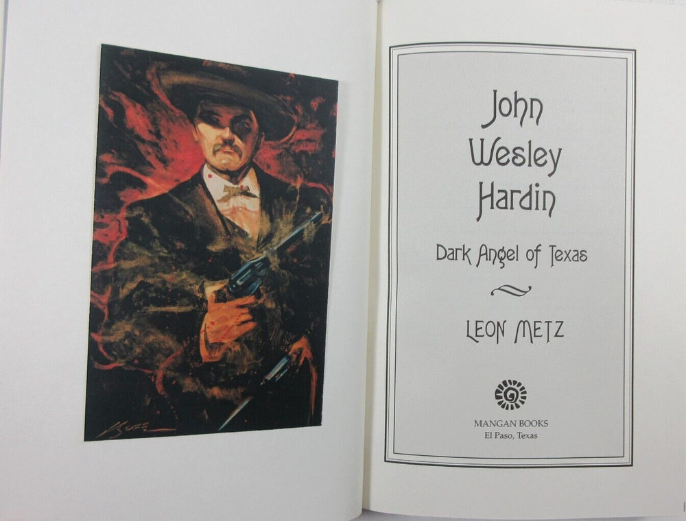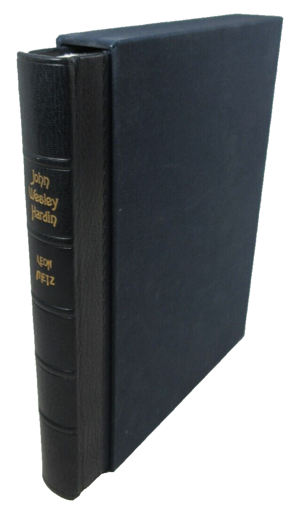 For sale is an Excellent+ condition slipcased 1/4 leather hardcover copy of John Wesley Hardin: Dark Angel of Texas by Leon Metz. SIGNED by Metz on limitation page! Deluxe Edition #23 of 50 copies made. Published in 1996 by Mangan Books in El Paso, Texas. Binding is sound and pages are unmarked. Includes facsimile playing card and account ledger at back. Boards are clean and square. Slipcase is sturdy and in Excellent condition with light shelf wear. Please see photos for condition detail. Shelf reference #L-1377