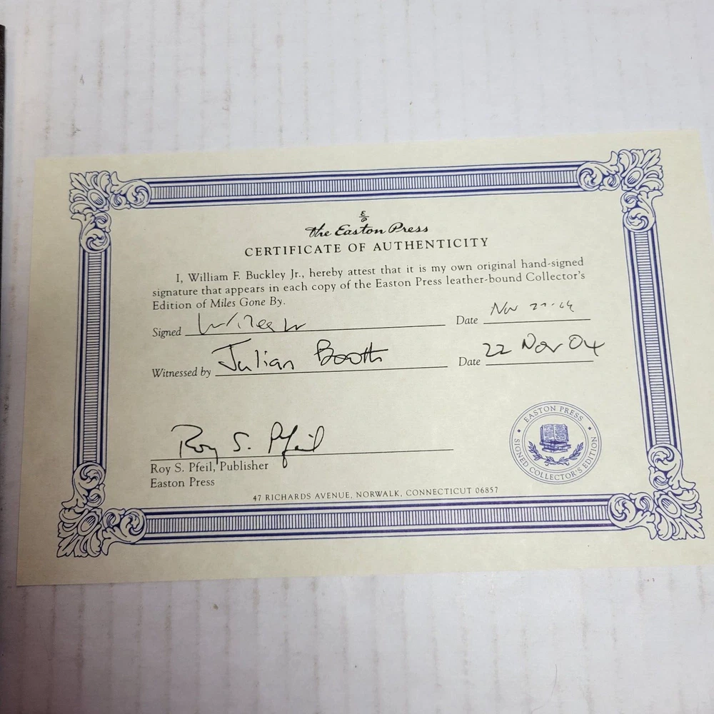 This listing is for a signed Easton Press edition of Miles Gone By by William F Buckley Jr. Book was stored in a non-climate controlled room for a few months by the previous owner and has developed some signs of mold issues on the leather cover. Will need professionally cleaned. Book was immediately bagged and stored separately from other items I have listed. Includes the COA. Cover may have some minor wear, please view all pictures.
