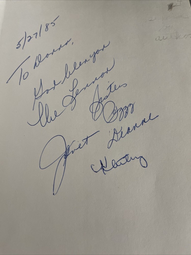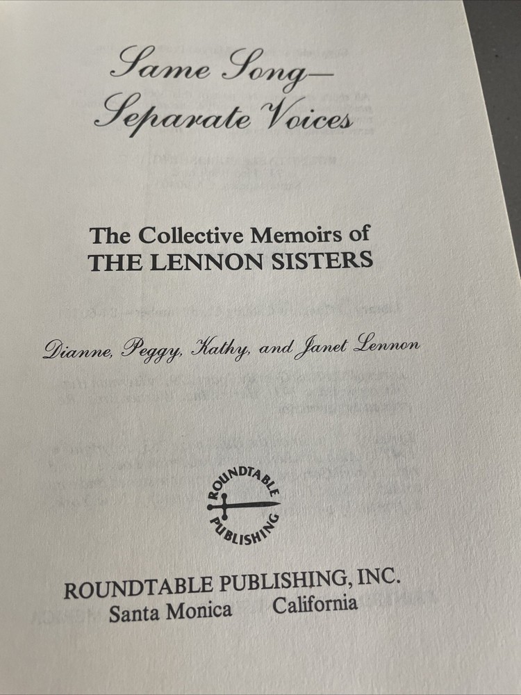1985. LENNON SISTERS, The. SAME SONG- SEPARATE VOICES: The Collective Memoirs Of The Lennon Sisters. Santa Monica: Roundtable Publishing Inc., [1985]. Tall 8vo., lavender faux-leather 352 pages. First Edition, first printing. Wonderful signed presentation from all four Lennon Sisters on the front endpaper, to DonnaThe Lennon Sisters. Kathy/ Janet/ Dee Dee/ Peggy."