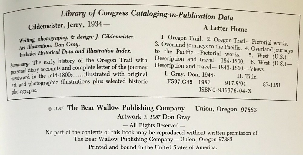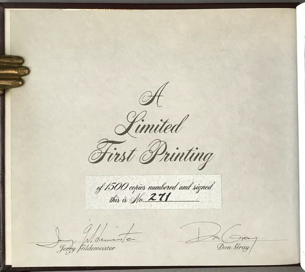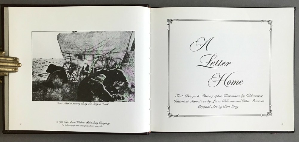 SIGNED/Limited Edition 271/1500 A Letter Home Bear Wallow Publishing 1987 Lucia Williams. Jerry Gildemeister. Don Gray, illustrator. A Letter Home. Union. OR: The Bear Wallow Publishing Company, 1987. Limited edition. Oblong octavo. 120pp. Illustrated. ISBN: 093637604X. No. 271 of 1,500 numbered copies. Signed by Jerry Gildemeister and Don Gray. Publisher’s brown leather, stamped in gilt to spine and front cover, cartographic endleaves. Extremities gently rubbed and edgeworn. Very good. YLG-00465A Visit our eBay store for more great signed books! https://www.ebay.com/str/inkqnabula/Signed/_i.html?_storecat=33084806014
