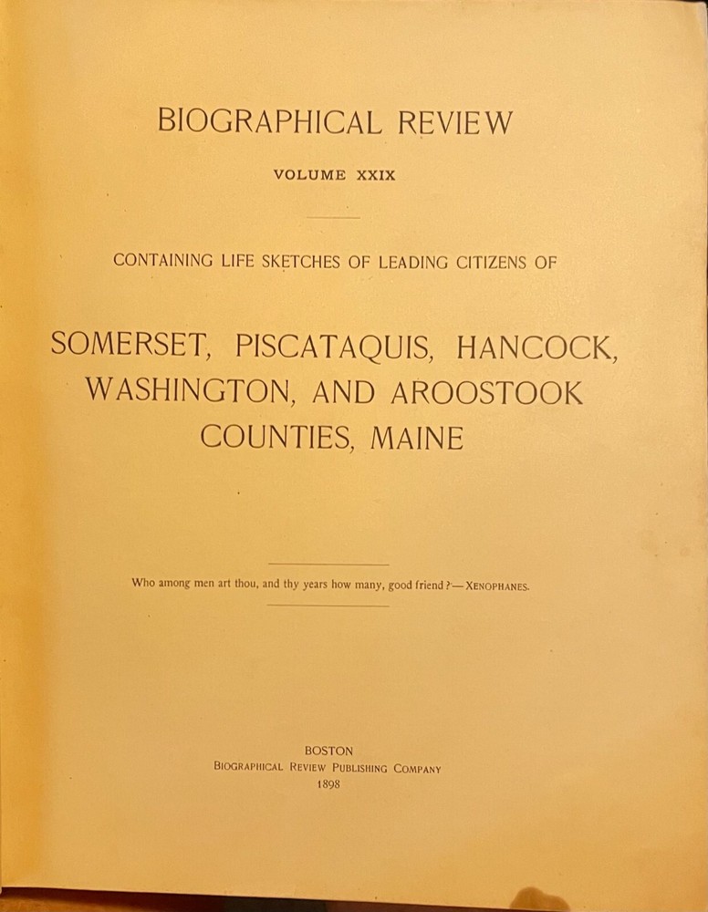 BIOGRAPHICAL REVIEW, VOLUME XXIX CONTAINING LIFE SKETCHES OF LEADING CITIZENS OF SOMERSET, PISCATAQUIS, HANCOCK, WASHINGTON, AND AROOSTOOK COUNTIES, MAINE Published by the Biographical Review Publishing Company, Boston, 1898 "With upward of four hundred and seventy names in the index, denoting that number of biographical sketches of prominent workers in various fields of useful activity, factors of progress and worthy of remembrance. . . this book is fairly representative of the industrial, the professional, and the public life of its locality in the closing years of the nineteenth century'". 739 pages, well illustrated D 96558