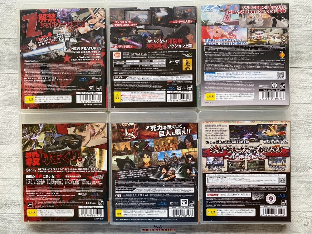 ๐Thank you for visiting our store!!๐ Safety Shipping Tracking Number Jet Wing Shipping! Japanese Good Items to the World! ๐ฎ๐ฎ๐ฎDescription๐ฎ๐ฎ๐ฎ Title: No More Heroes & Godzilla & Attack on Titan Shingeki no Kyojin & Bleach Soul Ignition & Nurarihyon no Mago 6games set Platform: SONY PlayStation 3 / PS3 Japan Language: Japanese Condition: Used Disc Exterior: Very Good Case: Very Good Manual: Very Good (Brand New - Like New - Very Good - Good - Acceptable) Although this software is Region-free, its operation is not guaranteed on devices other than Japanese devices. Depending on your device, it may not be possible to play, so please note that before purchasing. PS3 console is not included. We're NOT responsible if this game software works in your video game console. This game was originally sold for users in Japan. Be sure to check for yourself if your game console really matches this game. We provide the matching chart below for your information. ๐ซ๐ซ๐ซ๐ซShipping๐ซ๐ซ๐ซ๐ซ We use e-packet of Japan Post . It usually takes about 2 weeks (around 14 days) to get to your country. ( It may take more days according to the postal situation in your country or countries that the parcel goes through. For example, it usually takes more days during Christmas time.) Tracking number will be provided. After shipping, you can check your parcel with the tracking number (Please enter it in the website of Japan Post.) by yourself and ask the post office of your country. ONLY ship to PayPal confirmed address. ( We cannot ship to another address. ) We will ship items after packing them very carefully with bubble wrap, expanded polystyrene, and so on. So, please wait for its arrival at ease. Please ask anything before bidding if you have any questions about the item. (English only) We sell items in good condition, but if you find any defects, please tell me within 3 days after delivery. If you return the item, please return it in all original packaging and accessories. ๐ช๐ช๐ช๐ชPayment๐ช๐ช๐ช๐ช We Accept PayPal Only. Please complete payment within 3 days. ๐๐๐๐Other Term๐๐๐๐ International Buyers Please Note: Import duties, taxes and charges are not included in the item price or shipping charges. These charges are the buyer's responsibility. Please check with your country's customs office to determine what these additional costs will be prior to bidding/buying. These charges are normally collected by the delivering freight (shipping) company or when you pick the item up - do not confuse them for additional shipping charges. We do not mark merchandise values below value or mark items as "gifts" - US and International government regulations prohibit such behavior.
