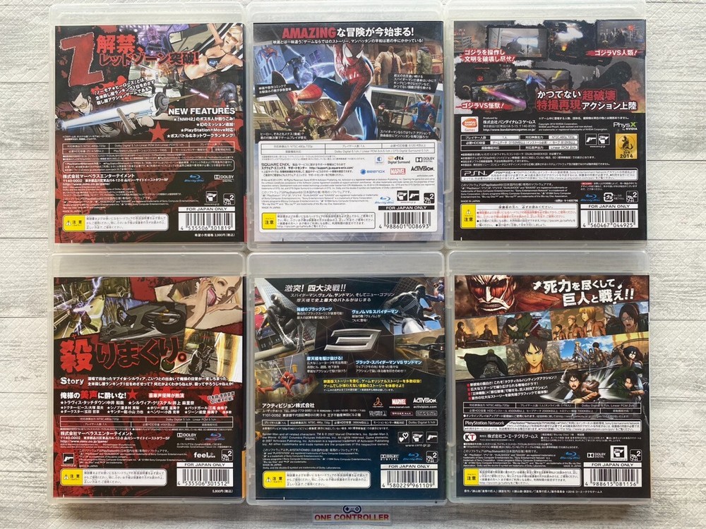 😄Thank you for visiting our store!!🌏 Safety Shipping Tracking Number Jet Wing Shipping! Japanese Good Items to the World! 🎮🎮🎮Description🎮🎮🎮 Title: No More Heroes & Spider-Man 2 3 & Godzilla & Attack on Titan Shingeki no Kyojin 6games set Platform: SONY PlayStation 3 / PS3 Japan Language: Japanese Condition: Used Disc Exterior: Very Good Case: Very Good Manual: Very Good (Brand New - Like New - Very Good - Good - Acceptable) Although this software is Region-free, its operation is not guaranteed on devices other than Japanese devices. Depending on your device, it may not be possible to play, so please note that before purchasing. PS3 console is not included. We're NOT responsible if this game software works in your video game console. This game was originally sold for users in Japan. Be sure to check for yourself if your game console really matches this game. We provide the matching chart below for your information. 🛫🛫🛫🛫Shipping🛫🛫🛫🛫 We use e-packet of Japan Post . It usually takes about 2 weeks (around 14 days) to get to your country. ( It may take more days according to the postal situation in your country or countries that the parcel goes through. For example, it usually takes more days during Christmas time.) Tracking number will be provided. After shipping, you can check your parcel with the tracking number (Please enter it in the website of Japan Post.) by yourself and ask the post office of your country. ONLY ship to PayPal confirmed address. ( We cannot ship to another address. ) We will ship items after packing them very carefully with bubble wrap, expanded polystyrene, and so on. So, please wait for its arrival at ease. Please ask anything before bidding if you have any questions about the item. (English only) We sell items in good condition, but if you find any defects, please tell me within 3 days after delivery. If you return the item, please return it in all original packaging and accessories. 🪙🪙🪙🪙Payment🪙🪙🪙🪙 We Accept PayPal Only. Please complete payment within 3 days. 📝📝📝📝Other Term📝📝📝📝 International Buyers Please Note: Import duties, taxes and charges are not included in the item price or shipping charges. These charges are the buyer's responsibility. Please check with your country's customs office to determine what these additional costs will be prior to bidding/buying. These charges are normally collected by the delivering freight (shipping) company or when you pick the item up - do not confuse them for additional shipping charges. We do not mark merchandise values below value or mark items as "gifts" - US and International government regulations prohibit such behavior.