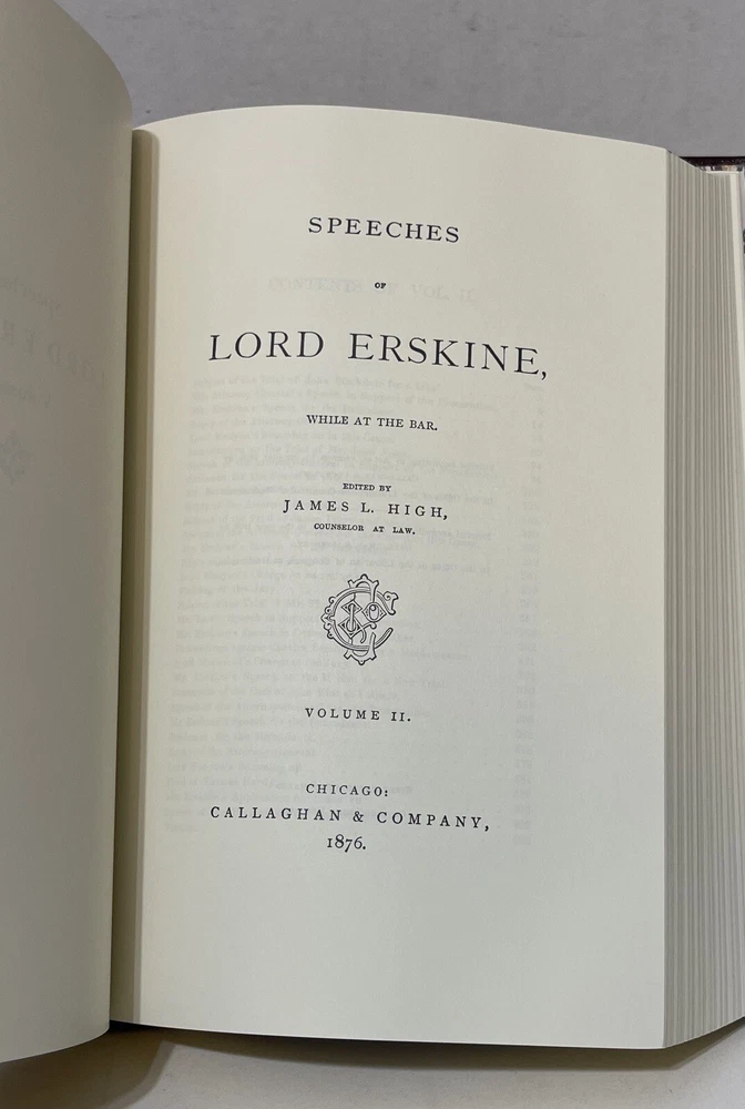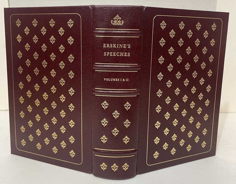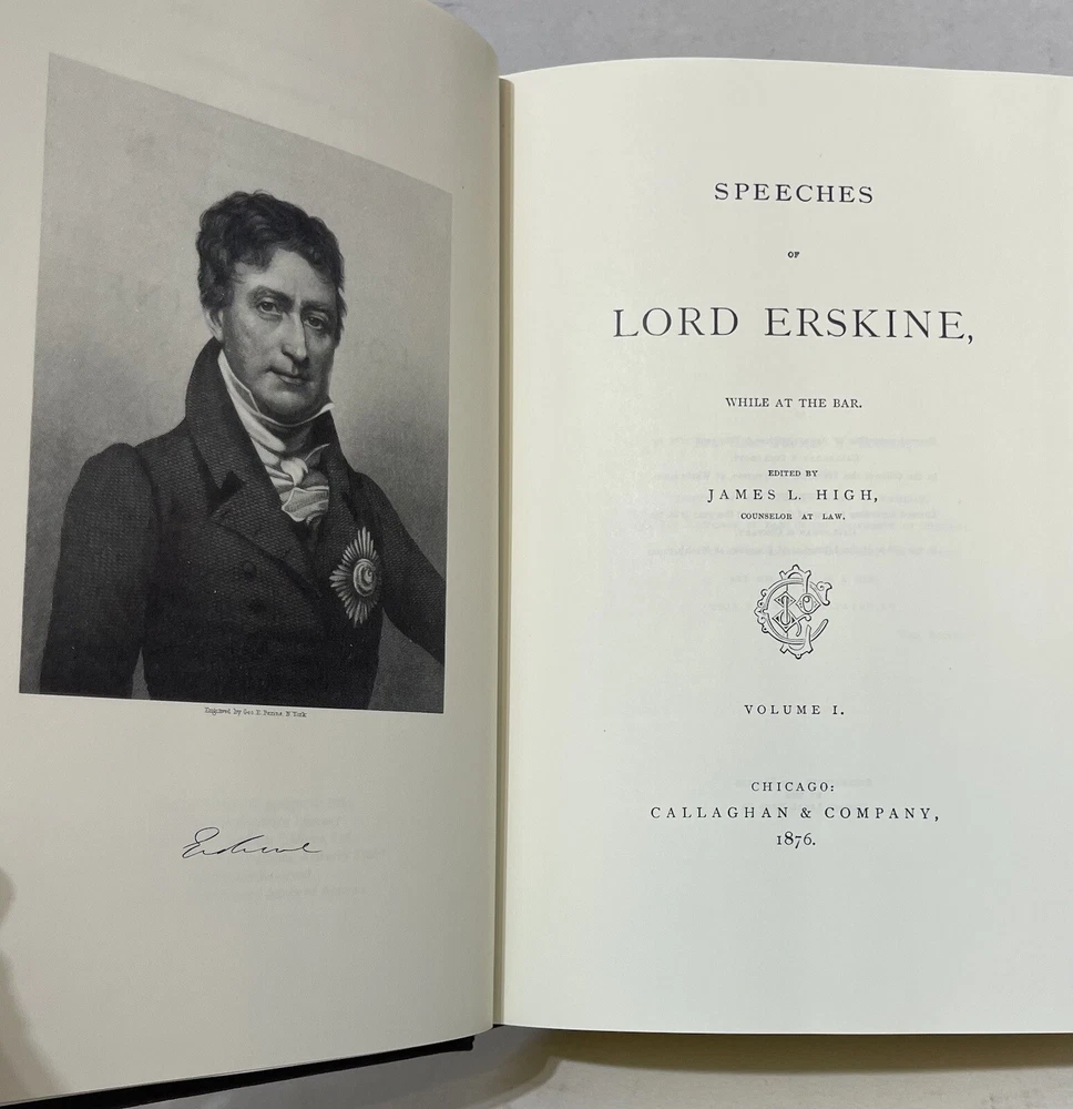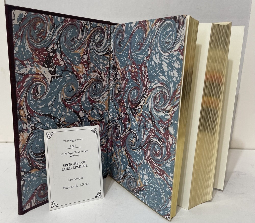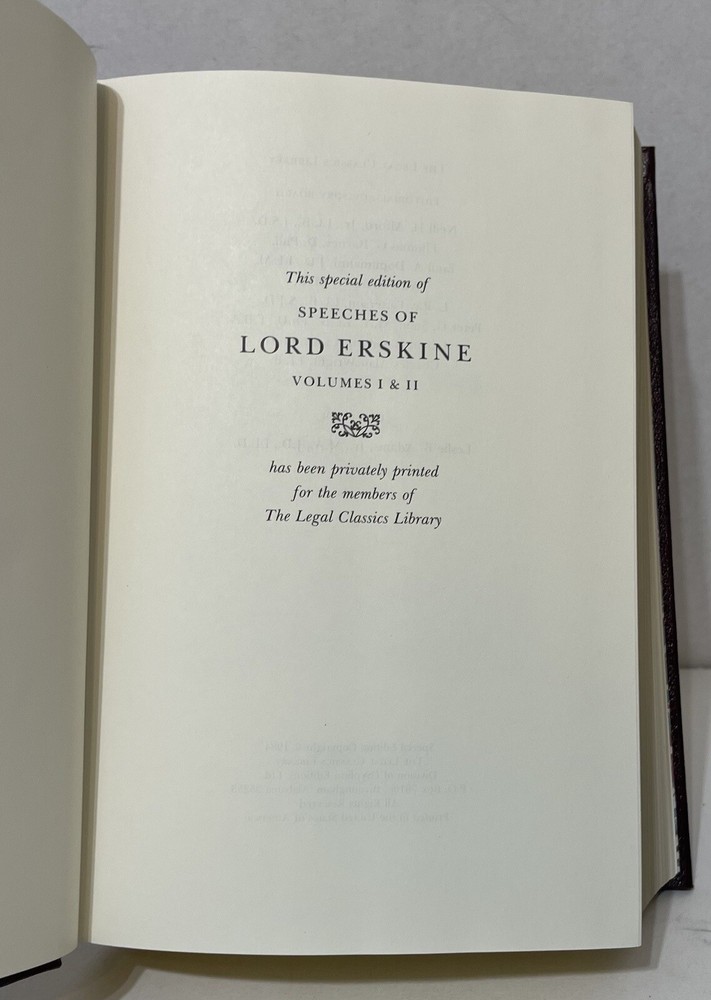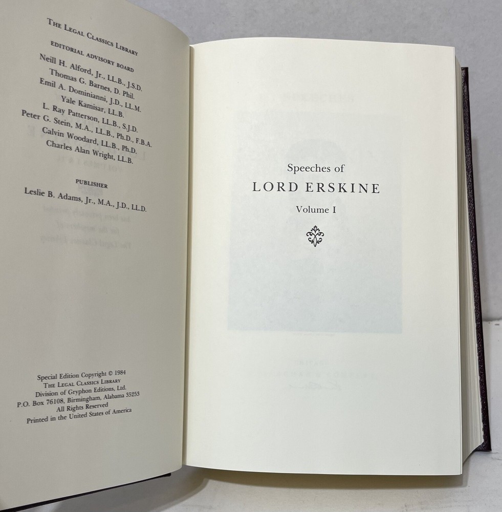 This limited edition contains the collected speeches of Lord Erskine, a renowned Scottish lawyer and politician. The books are bound in leather and weigh approximately 1 pound each. They were printed in 1984 by the Legal Classics Library and are written in English. The speeches cover a range of historical topics and provide insight into the mindset of one of Scotland's most influential figures. This set is a must-have for any book collector or history enthusiast.