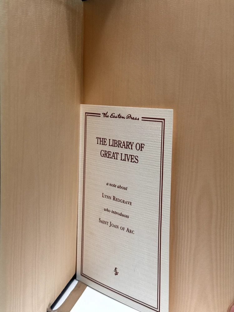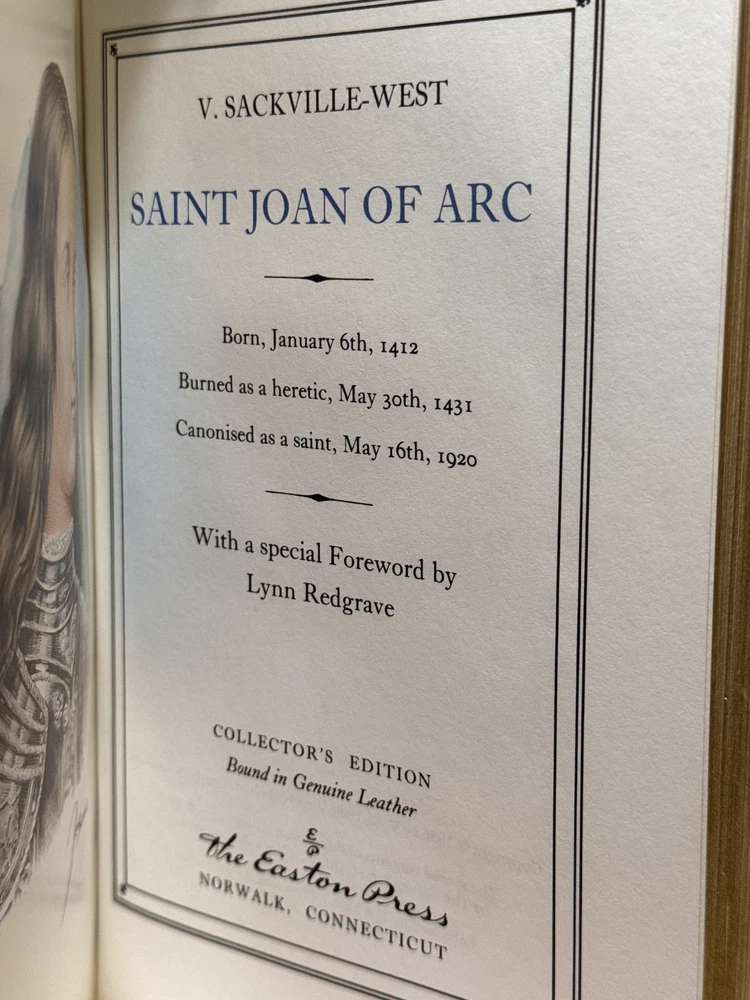 You are bidding on a copy of a 1st Edition, 1st Printing of the Easton Press' LIBRARY OF GREAT LIVES series edition of V. Sackville-West's SAINT JOAN OF ARC. Born, January 6th, 1412. Burned as a heretic, May 30th, 1431. Canonised as a saint, May 16th, 1920. The book is about the life of St. Joan of Arc, the patron saint of France, a French hero of the 100 years' war... Foreword by Lynn Redgrave. Bound in beautiful genuine moroccan cowhide leather, the book features raised bars on the spine, gold tooling on the cover and spine, Moire ribbed endpages, satin silk sewn-in bookmark, 22k gold dust on page ends on all 3 sides. Printed on archival quality acid-neutral paper, that will last for generations without diminishing in quality or looks. LIMITED, COLLECTOR'S EDITION, PRINTED SPECIALLY FOR SUBSCRIBERS TO THE LIBRARY OF GREAT LIVES. Free Shipping in all of Continental United States. All other buyers, please check with me for shipping rates before bidding. See my other listings. I have a large collection of rare and collectible books, most leather-bound, others of first edition, first printing, even unpublished manuscripts. I will combine them during shipping so you can receive them together. Just message me your intent to buy more than one book, and I will hold them to be shipped together. Happy Buying!