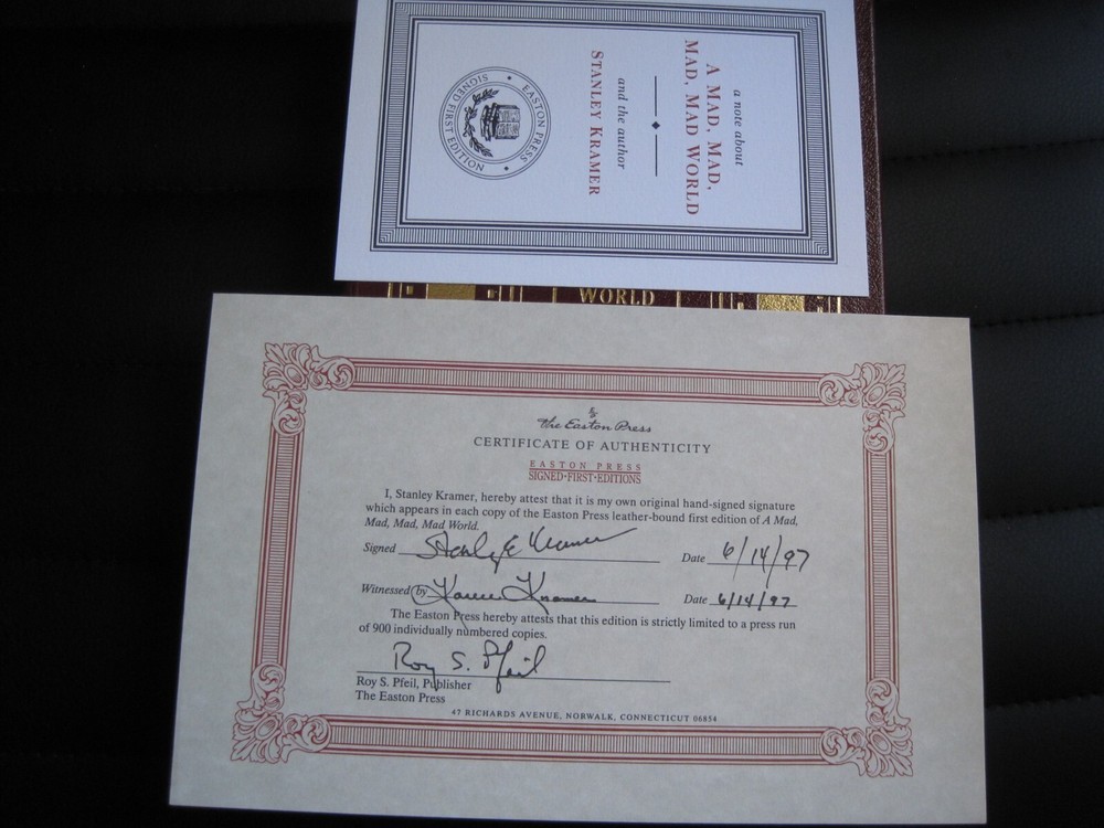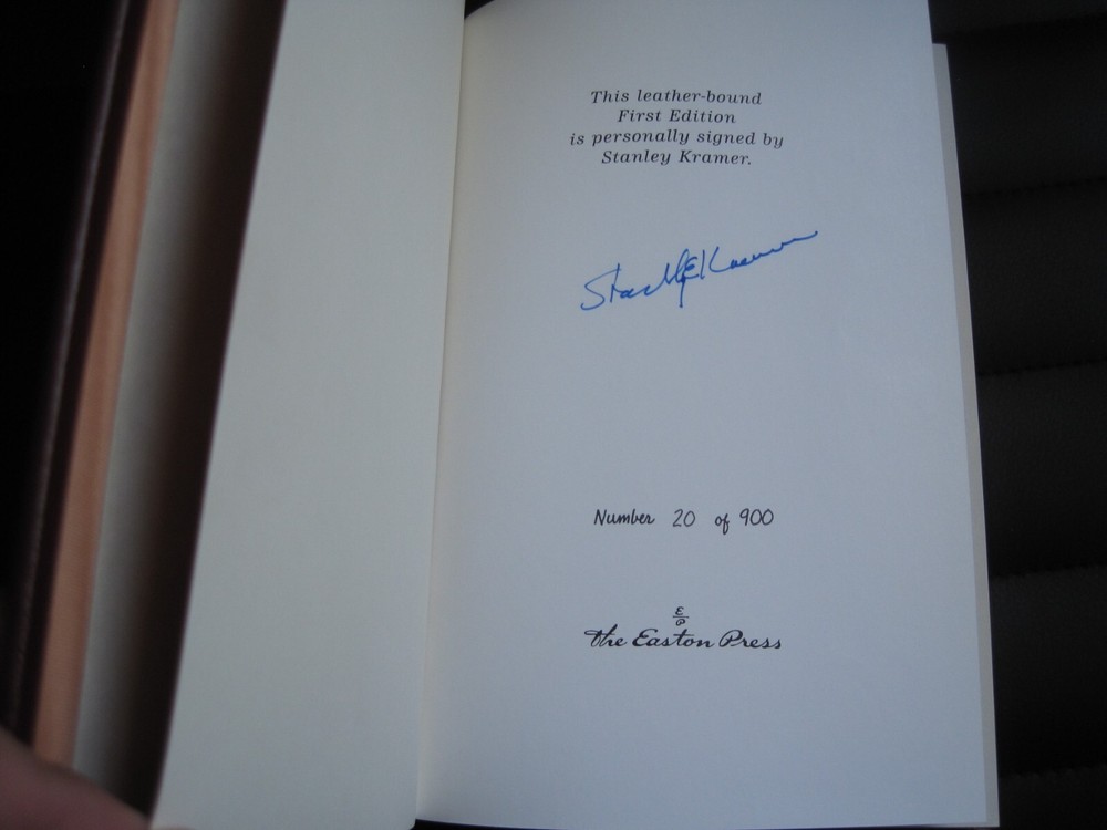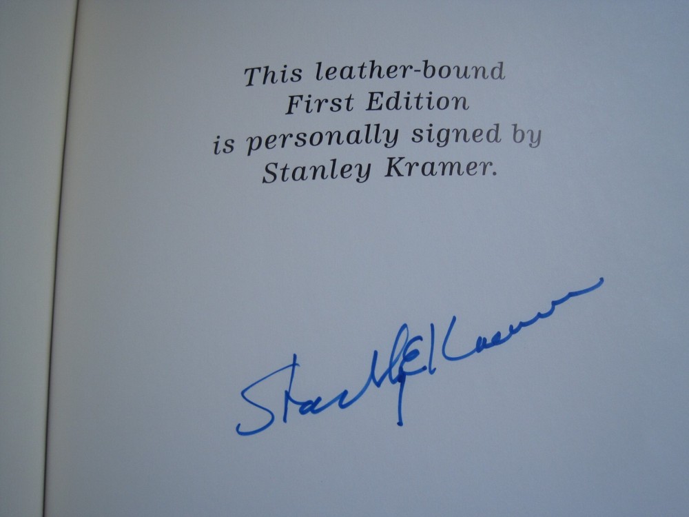 This is a leather bound signed first edition of Stanley Kramer's best-selling memoir - "A MAD MAD MAD MAD WORLD", a fascinating book written by the famous Hollywood producer and Academy Award winning director. Legendary Hollywood producer/director Stanley Kramer touts himself as "the most frequently picketed producer in movie history," a distinction to which he is entitled as the force behind such landmark films as Guess Who's Coming to Dinner , On the Beach , High Noon , and The Wild One . Kramer tells a remarkable history of life in Hollywood during the depths of the McCarthy era and other cold war exigencies. His memoir captivates the reader with anecdotes from working with such troublesome stars as Marlon Brando and Humphrey Bogart. The book is unread, and in great condition (see images). Signed by the famous Hollywood star on the limitation page, it also includes the signed and dated certificate of authenticity, and the publisher's note card. This is book number 20 of only 900 copies ever printed. Easton Press books are the golden standard in the publishing industry, highly collectible and lasting generations. Easton Press Full Genuine Leather Dubbed Spine Accented Wit 22 kt. Real Gold Satin Ribbon Page Marker Distinctive Cover Design Gilded Page Edges To Protect Against Humidity High Quality Acid - Free paper Smyth-Sewn Pages Silk-Moire Endleaves I combine multiple items for savings on shipping charges. I ship worldwide. Please ask about international shipping charges and/or different shipping options. Please check out my other auctions for several rare signed books for sale. Thank you!