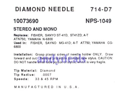NEW IN BOX TURNTABLE NEEDLE STYLUS FOR FISHER ST41D ST-41D CG8800, 714-D7, TURNTABLE STYLUS NEEDLE FOR SANYO ST41D ST-41D CG8800, 714-D7, NEW IN BOX TURNTABLE STYLUS NEEDLE FOR YAMAHA C8-8800 YAMAHA CG8800, 714-D7 Model Pfanstiehl 714-D7 Description Brand New (factory box) replacement stylus Diamond .7 mil conical tip needle Speeds: 33 & 45 RPM REPLACES needles listed below NEEDLE S ASTATIC N2577 AUDIO TECHNICA ATN-750 ATN750 CEC MM-1 MM1 RS-1 RS1 EVG PM2306D FISHER 4-1579-26980 4157926980 4-1579-29400 4157929400 ST-41D ST41D SANSUI SN-47 SV47 SN47 SANYO ST-41D ST41D ST-41ZD ST41ZD YAMAHA N-6800 N6800 CARTRIDGES AUDIO TECHNICA AT-750 AT750 CEC MG-41 MG41 PC-1 PC1 SANSUI SV-47 SANYO MG-41 ST41D ST41D ST41ZD ST41ZD MG41 YAMAHA CG-6800 CG6800 MODELS FISHER 2500 2600 6000 8000 8001 8002 ACS146 ACS132 ACS146 ACS221 ACS280A ACS365 ACS365 ACS370 ACS400 MMT640 MMT650 MT640 MT650 MT6410 MT6420 SYSTEM200 SYSTEM220 SYSTEM250L SYSTEM350 SYSTEM350L SYSTEM75A SYSTEM200 SYSTEM220 SYSTEM250L ACS112 ACS118 ACS122 ONKYO PX-55F PX55F